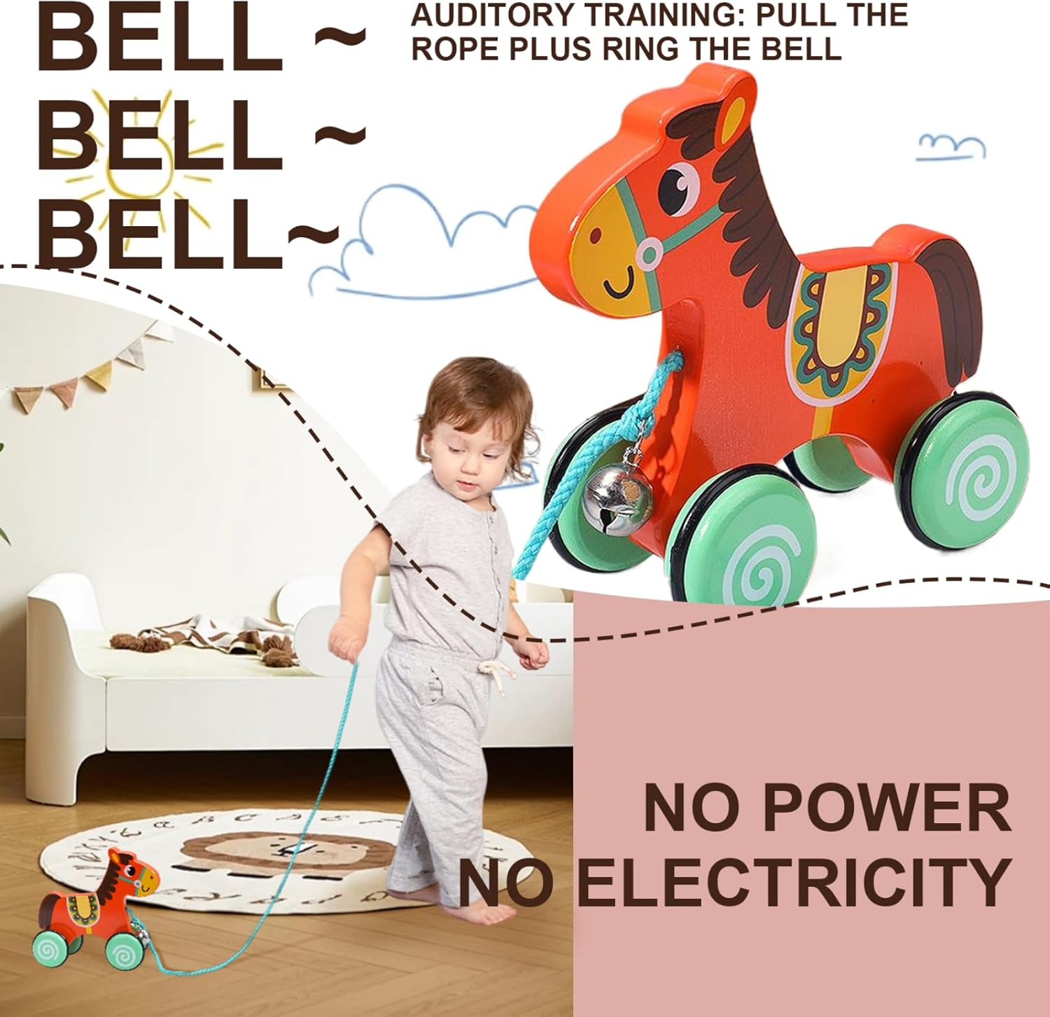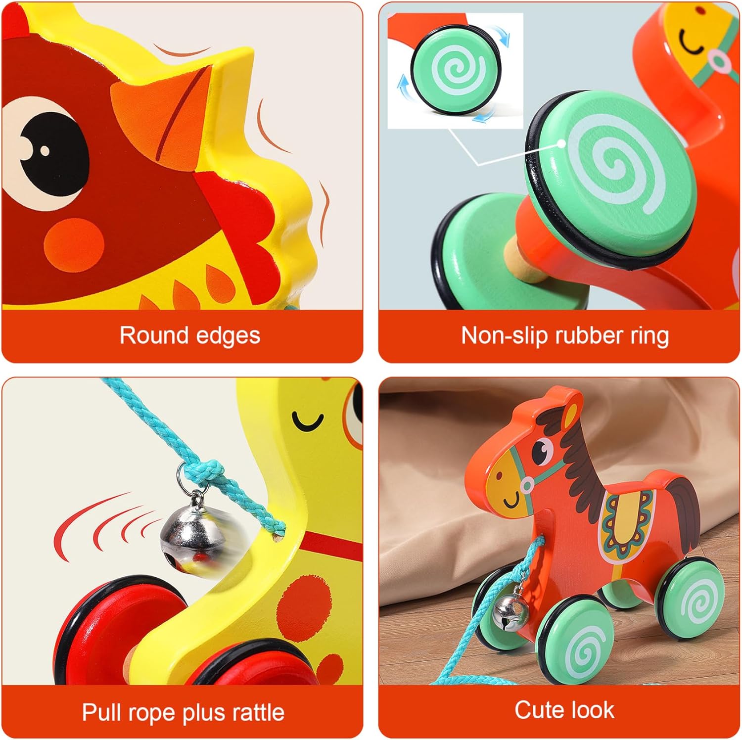 Incoraggia la crescita dello sviluppo: questo giocattolo pull-and-push aiuta i bambini a migliorare le capacità motorie, il coordinamento degli occhi e l'equilibrio, rendendolo un eccellente strumento di sviluppo per l'apprendimento della prima infanzia. Materiali ecologici e non tossici: realizzato con materiali in legno, questo giocattolo è, ecologico e ricoperto di vernice non tossica, che lo rende sicuro per piccole mani e bocche. Azione di pull & push bidirezionale: questo giocattolo può essere tirato o spinto in entrambe le direzioni, consentendo ai bambini di esplorare il loro ambiente mentre sviluppano coordinazione e forza muscolare. Adorabile design del cavallo con campana: a forma di cavallo carino con una campana divertente, questo giocattolo che cattura l'attenzione dei bambini e li tiene fidanzati..Il Sound Gentle Bell aggiunge un tocco di stimolazione uditiva durante il gioco. Ruote anti-slip per la sicurezza: le robuste ruote anti-slip assicurano che il giocattolo rotoli agevolmente e in sicurezza su superfici diverse, prevenendo fogli o improvvisi fermate durante il gioco.