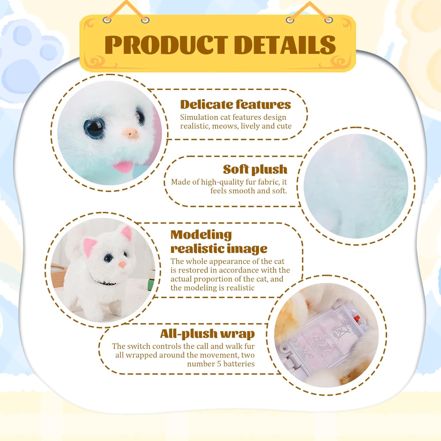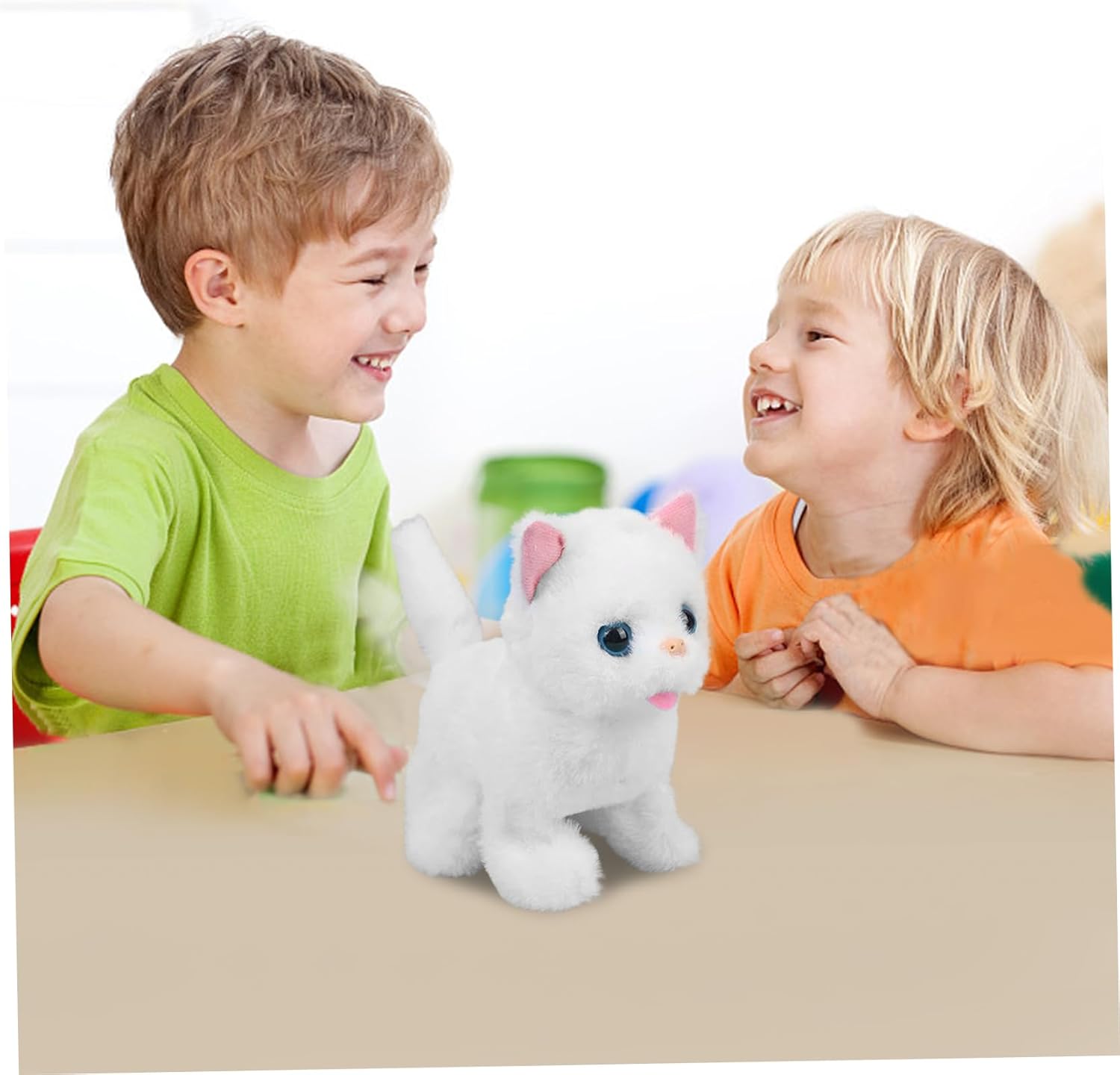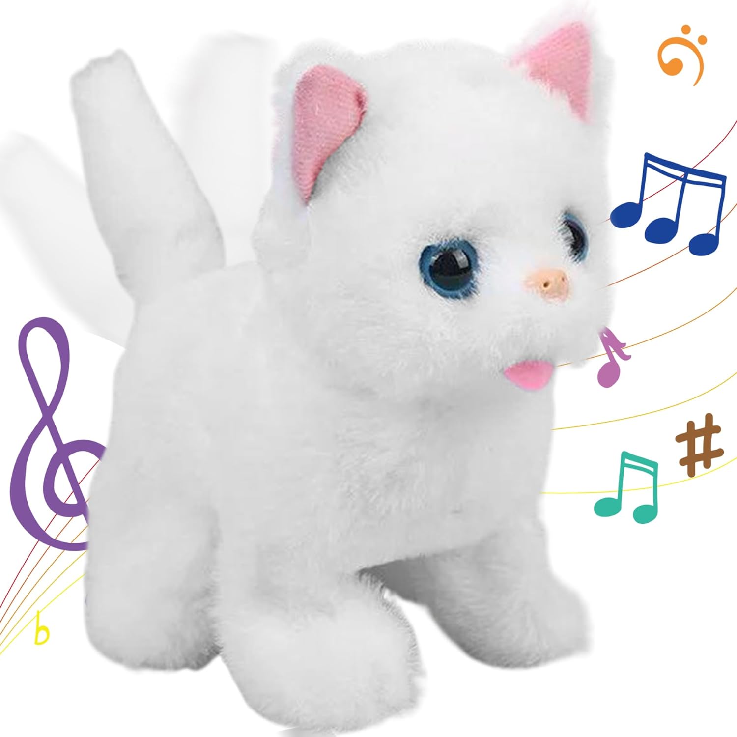 Richiede una configurazione minima: basta installare 2 batterie AA (non incluse) e questo gatto giocattolo è pronto per il divertimento!.Il suo design intuitivo garantisce che i bambini possano iniziare rapidamente a giocare senza complicati setup.cat giocattoli per bambini Design morbido e coccoloso: misurato 6.69x3.94x6.69 pollici, questo gatto giocattolo di peluche è realizzato con materiali morbidi e di alta qualità perfetti per coccole..È il compagno ideale per le avventure di gioco e le accoglienti sessioni di coccole. Giocattoli per bambini robot gatto Regalo perfetto per ogni occasione: sia per Pasqua, Natale che per i compleanni, questo gatto giocattolo fa un regalo affascinante per i giovani amanti degli animali..Le sue adorabili caratteristiche di design e interattive porteranno gioia e eccitazione a qualsiasi celebrazione..Robot Cat Toy Cat Adorabile azione che scodinda la coda: questo gatto giocattolo agita la coda mentre cammina, aggiungendo un tocco divertente e giocoso che imita il vero comportamento del gatto..I bambini apprezzeranno i deliziosi movimenti, rendendo questo giocattolo un'aggiunta accattivante alla loro collezione..Gatto gatto giocattolo Caratteristiche a piedi interattive: guarda il viso di tuo figlio illuminarsi mentre questo peluche cammina e miagoli!.Il design interattivo fa divertire i bambini, incoraggiando il gioco immaginativo con una vivace esperienza simile a animali domestici..Animale di peluche per gatto di gatto di peluche