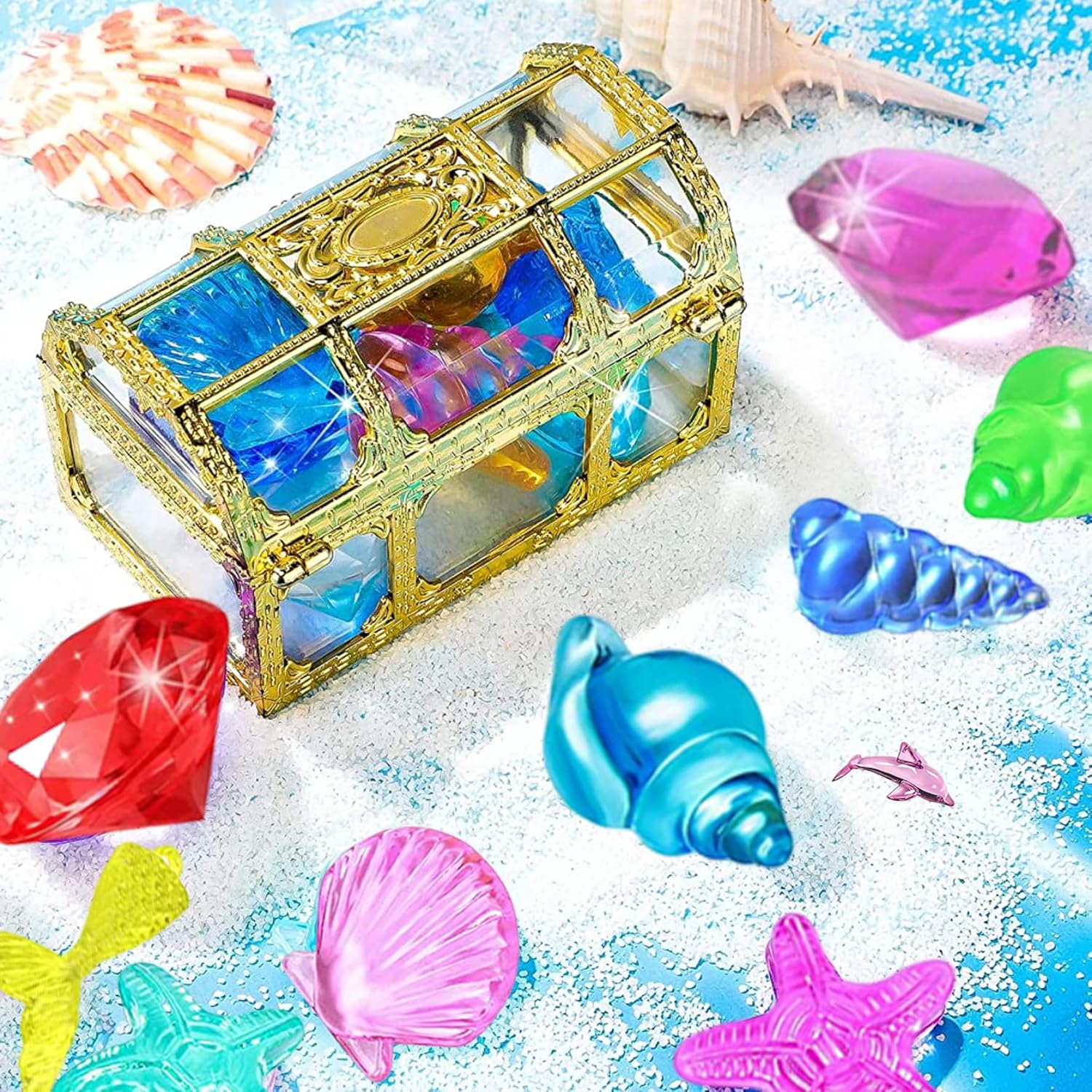 Migliora le abilità di nuoto: lancia queste vivaci gemme subacquee in diverse aree della piscina e lascia che i tuoi bambini si tuffino per raccoglierle. Questo gioco non solo crea divertimento senza fine per ogni famiglia, ma aiuta anche a migliorare le abilità di nuoto e immersione. Questi giocattoli per l'allenamento del nuoto sono perfetti per incoraggiare adolescenti e giovani ad immergersi, promuovendo una sana attività natatoria e fisica. Gioco versatile: che si tratti di una giornata in spiaggia, di una festa in piscina o di un semplice tuffo in giardino, i nostri giochi da piscina per tuffi sono un must per il divertimento estivo. Inoltre, fungono da ottimi strumenti educativi per insegnare gli animali marini e possono essere inclusi in sacchetti regalo o utilizzati come premi per varie attività. Affidabili e sicuri: i nostri giocattoli da piscina affondanti sono realizzati con materiali acrilici di alta qualità, garantendo durata e resistenza all'usura. Sono atossici e completamente sicuri per far giocare i bambini. I colori vivaci li rendono altamente visibili sott'acqua, aggiungendo eccitazione e divertimento. Regalo estivo perfetto: il set di giocattoli Pirate Gems è una fantastica aggiunta a qualsiasi avventura in piscina con i tuoi bambini. Porta gioia ed eccitazione a bambini e adulti. Che tu sia un genitore, un amico o un appassionato di nuoto, questo set è un regalo estivo perfetto per i bambini e gli studenti di nuoto, offrendo ore di intrattenimento e creando ricordi indimenticabili. Contenuto della confezione: vivi infinite avventure subacquee con i nostri giocattoli per il nuoto e le immersioni!