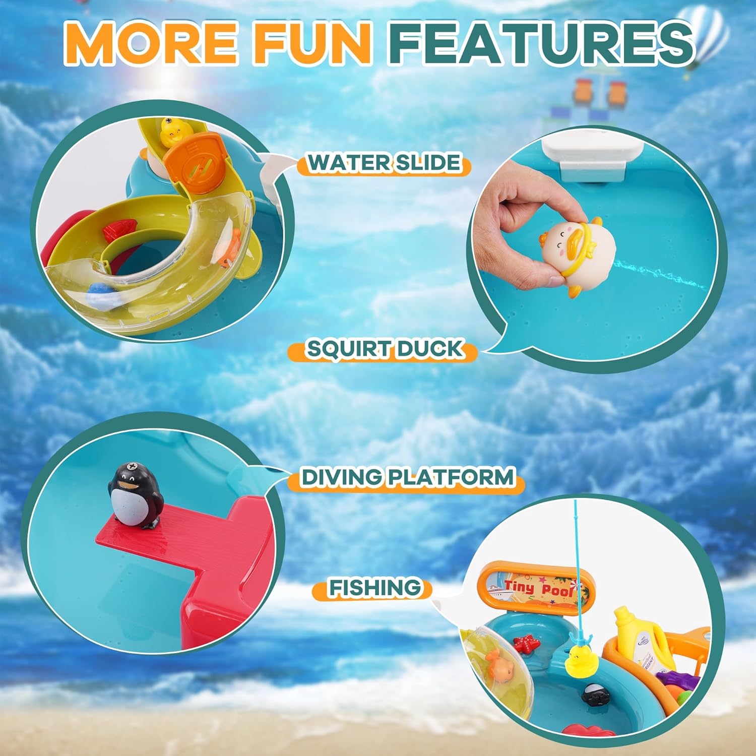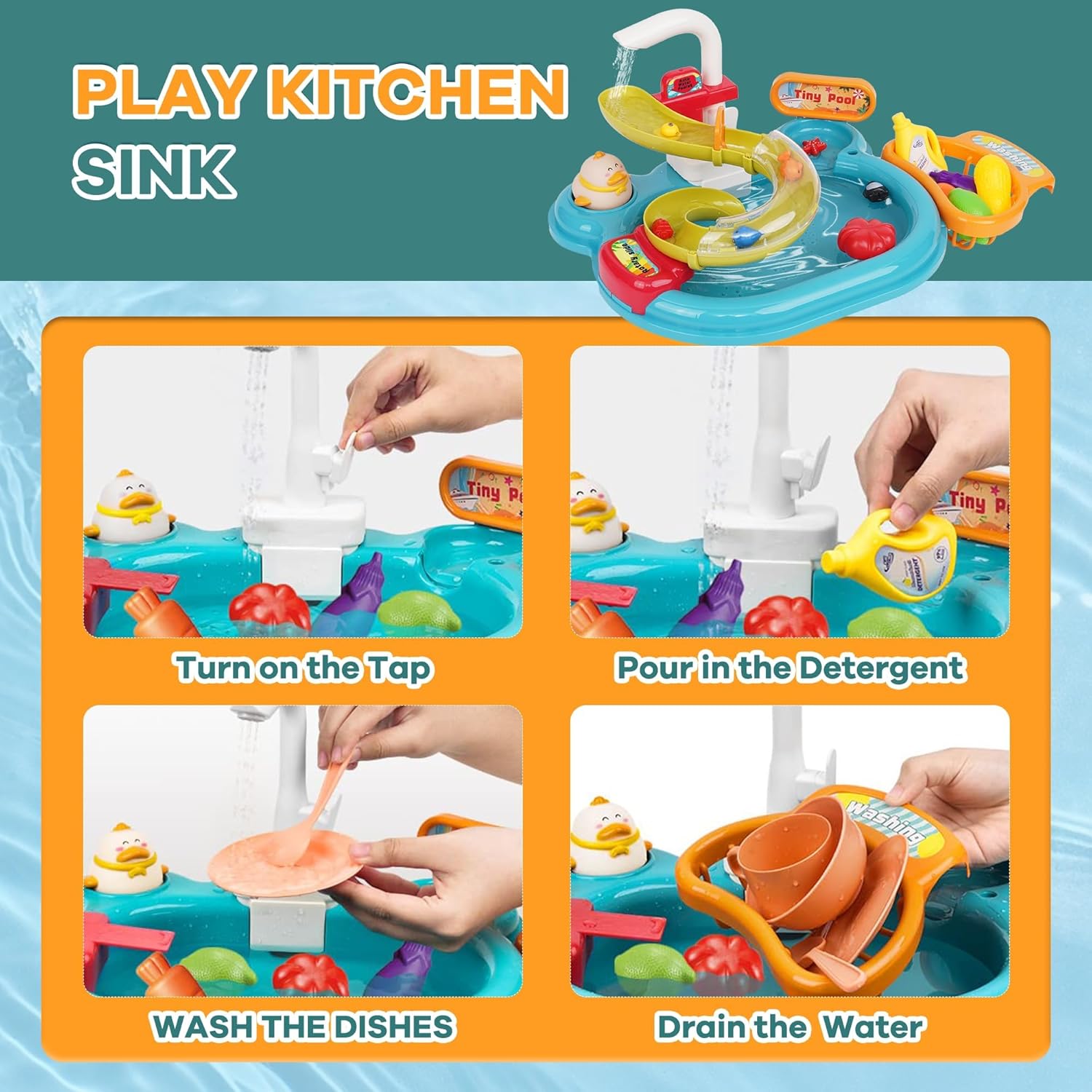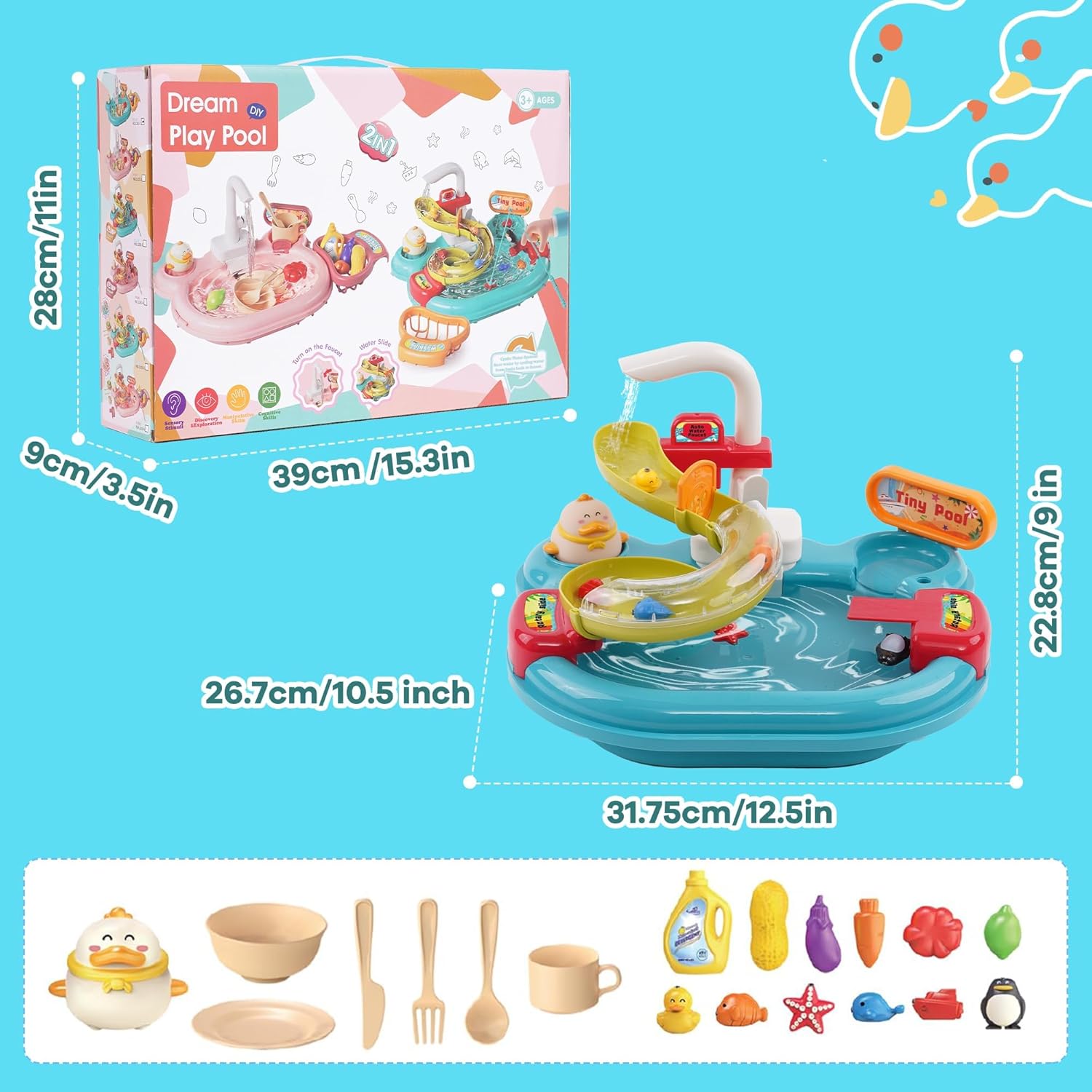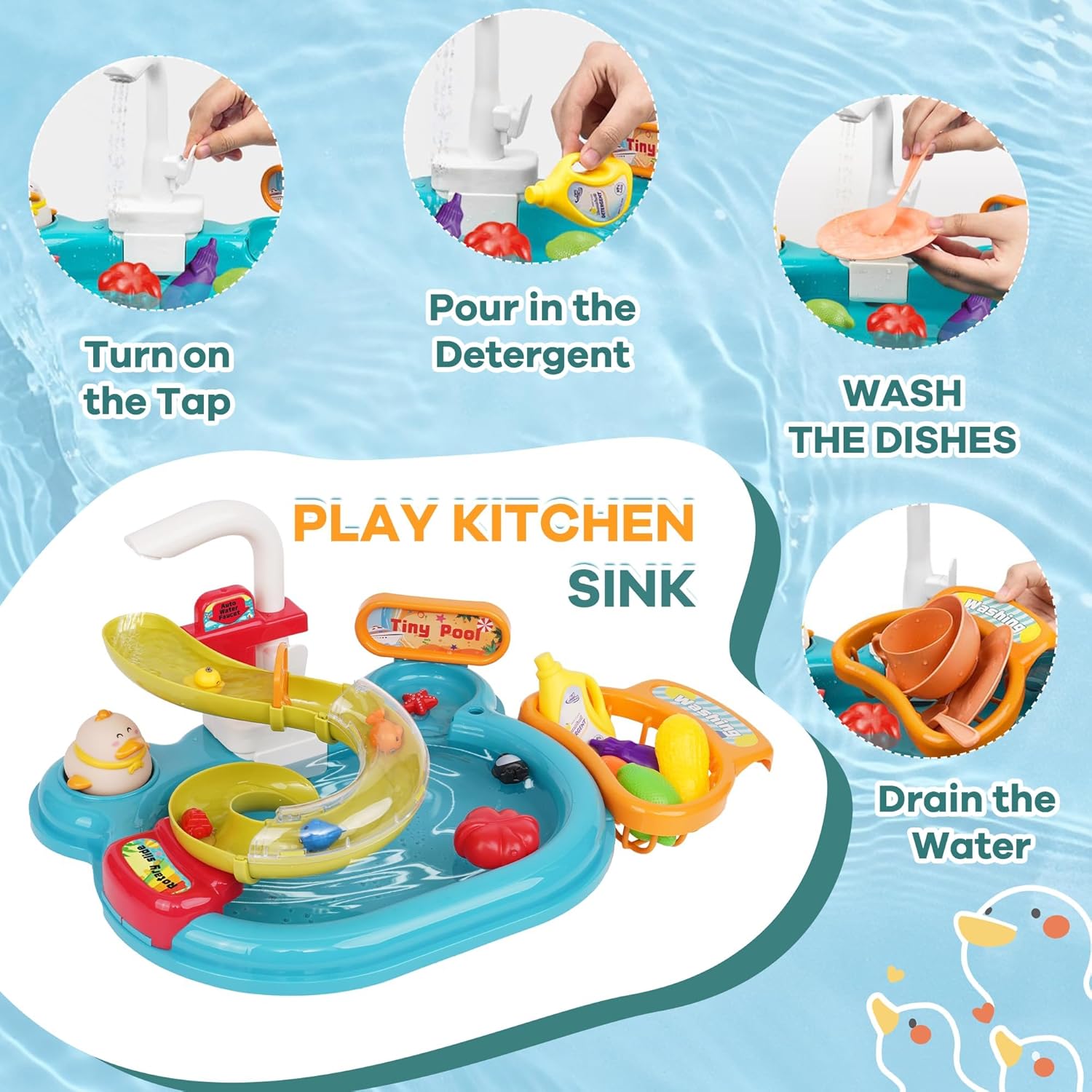 [Set da cucina da gioco 3 in 1]: il set da gioco per lavello aggiunge un divertente gioco di pista e pesca! I più piccoli potranno non solo giocare a giochi di ruolo in cucina con posate e cibo finto, ma anche a giochi di pesca con stelle marine/pesci/pinguini/anatre/barche posizionate sopra la pista e che scorrono lungo il ruscello. Molto divertente e bello! [Set da gioco realistico per lavello con flusso d'acqua]: questo set di lavello da gioco 3 in 1 è dotato di un rubinetto e di un sistema di circolazione dell'acqua per aiutare a risparmiare acqua. Il rubinetto supporta la rotazione di 180°. Apri il rubinetto e il tuo bambino potrà provare il divertimento della cucina. Ruota la direzione del rubinetto, l'acqua scorrerà lungo la pista e i più piccoli potranno dedicarsi a una divertente pesca. [Ricchi giocattoli da cucina]: il set da cucina per bambini comprende bicchieri di plastica, piatti di plastica, detersivo per giocattoli, set di coltelli e forchette di plastica, giocattoli alimentari, canne da pesca e giocattoli galleggianti come stelle marine/anatre/balene/pinguini. I ricchi accessori possono migliorare il colore dei tuoi bambini riconoscimento ed esercita la capacità di organizzare e immagazzinare. [Seguro y apto para niños]: juguete de fregadero apto para niños, hecho de material ABS resistente, con bordes lisos, sin rebabas ni olores, brinda a los niños un espacio de juego amplio y seguro. Los peces y ranas de juguete flotantes también se pueden utilizar como juguetes para pescar o bañarse en la piscina. [Gran regalo para niños]: diseñado para que los niños jueguen en la cocina y la pesca, alentándolos a lavarse siempre las manos para mantenerse saludables, ayudarlos a aprender habilidades para la vida y ahorrar agua. Regalo perfecto para cumpleaños, vacaciones, Navidad, familia, fiesta, especialmente para niños y niñas de 3 4 5 6 7 8 9 años.