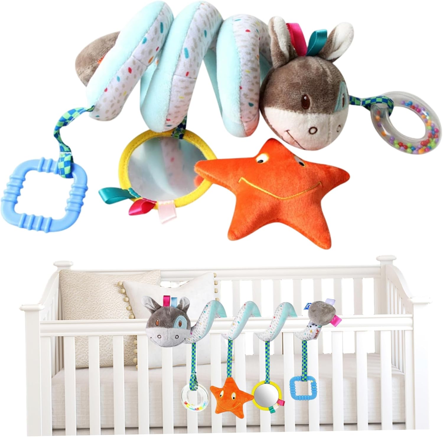 Vantaggi dello sviluppo: stimola le capacità visive, tattili e uditive del bambino attraverso diverse trame e suoni, sostenendo la crescita delle capacità cognitive e motorie Uso versatile: dimensionato perfettamente sia per bassine che per passeggini, ideali per ragazzi e bambini entro 0-6 e 6-12 mesi di fasce di età per mantenere i piccoli impegnati ovunque Materiali sicuri e delicati: realizzati con tessuti morbidi e morbidi che sono delicati su una pelle delicata, adatti a neonati di età compresa tra 0 e 6 mesi e fino a 12 mesi Playset interattivo: giocattoli a basso contenuto di bassine con specchio sospeso, tintinnio, squeaker e teether coinvolge i sensi dei bambini e incoraggia lo sviluppo precoce Attacco sicuro: progettato per seggiolini auto e passeggini, questi giocattoli attaccano e rimangono in posizione durante il viaggio, fornendo comfort e intrattenimento in viaggio