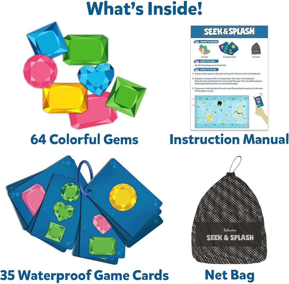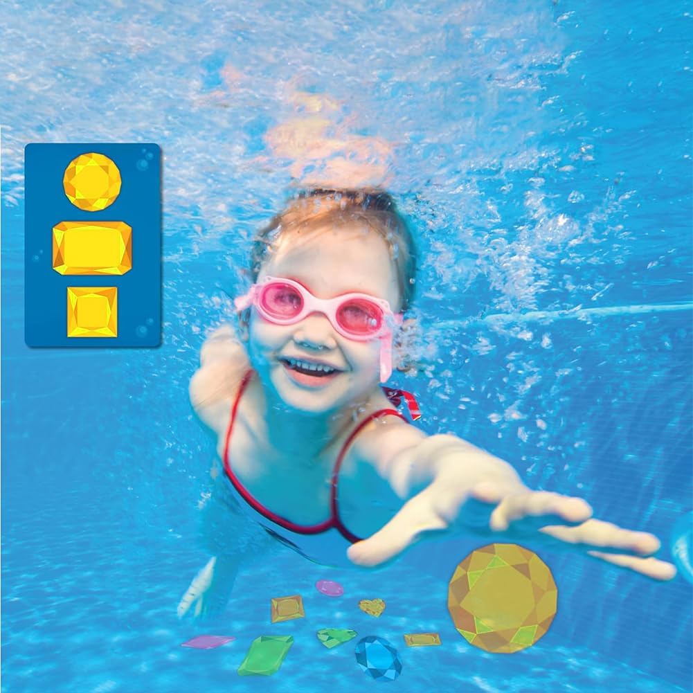 Gemme e borsa in rete per bambini, nuoto, immersioni, giochi d'acqua. Stimola le abilità dell'acqua e l'allenamento di nuoto attraverso immersioni emozionanti e ricerche in acqua Contiene 64 gemme colorate, carte da gioco impermeabili e tasca in rete per una facile conservazione e trasporto Set di giocattoli con 64 gemme colorate e borsa a rete per bambini nuoto immersioni giochi d'acqua. Ideale per bambini dai 6 anni in su, perfetto per l'estate, feste in piscina e gite in campeggio Giocattolo subacqueo caccia al tesoro favorisce le capacità motorie, la coordinazione e il lavoro di squadra durante il gioco dell'acqua 64 Gemme Colorate E Sacchetto Della Maglia Per I Bambini. Materiale in silicone resistente, durevole e sicuro per i bambini che giocano in acqua