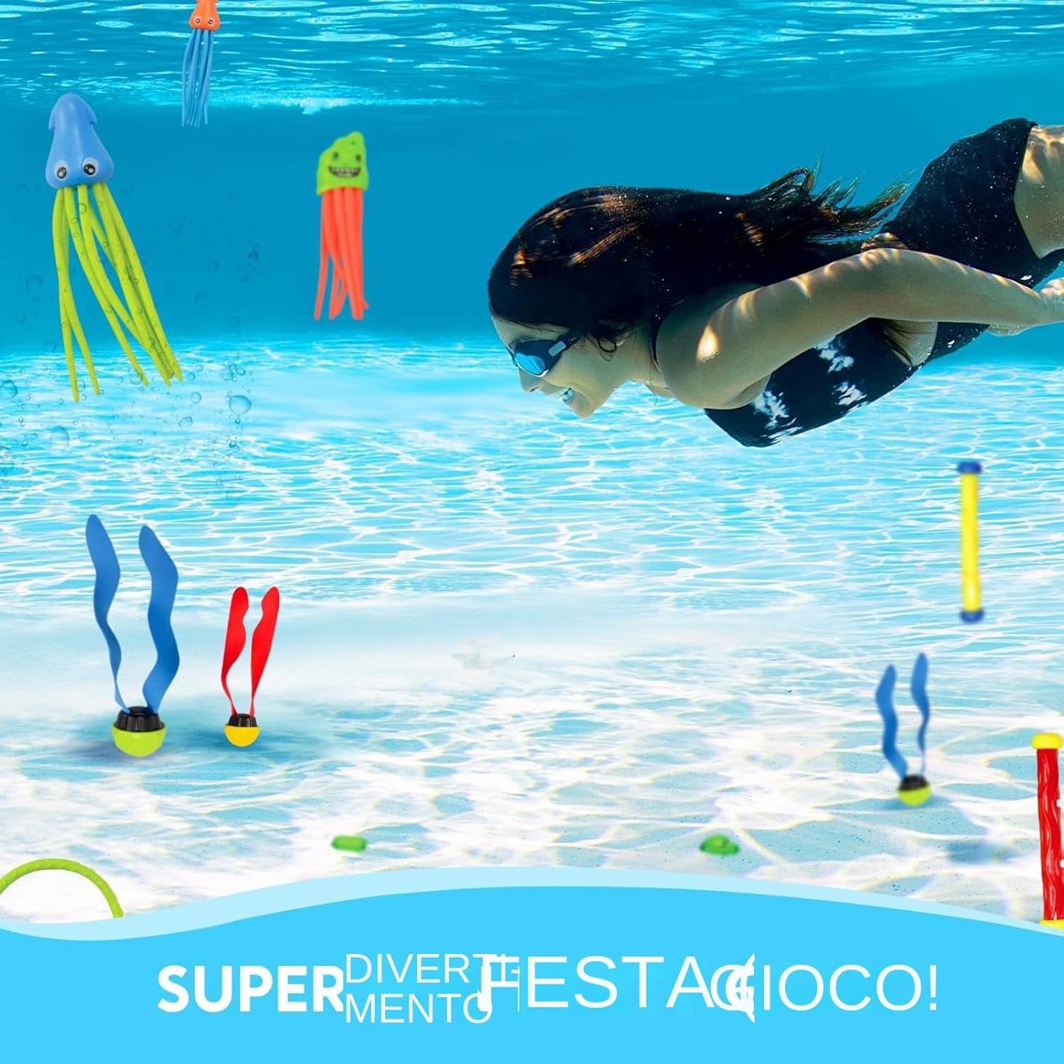 Set da 30 Diversificati: Include vari giocattoli subacquei a tema marino che stimolano la scoperta attraverso la curiosità, offrendo giochi d'acqua multifunzione per divertimento infinito ed esplorazione durante le attività in piscina Giochi acquatici coinvolgenti: Questi giocattoli da immersione catturano l'attenzione con i loro adorabili personaggi marini e colori vivaci, offrendo un'esperienza estetica coinvolgente grazie ai design cartoneschi che stimolano il gioco prolungato in piscina Coinvolgimento dinamico: Stimola l'interazione fisica e il divertimento con design resistenti e stabili per giochi acquatici, perfezionando le tecniche motorie e di recupero Attività Subacquee Interattive: ludico che trasforma la piscina in palestra relazionale, con percorsi di gioco modulari che richiedono coordinazione e sostegno reciproco, intensificando le connessioni emotive durante il divertimento Divertimento flessibile: Kit multiuso che supporta differenti stili di gioco acquatico, combinando portabilità avanzata con elementi modulari per sessioni estive rinfrescanti in qualsiasi contesto acquatico, dalla vasca idromassaggio alla battigia
