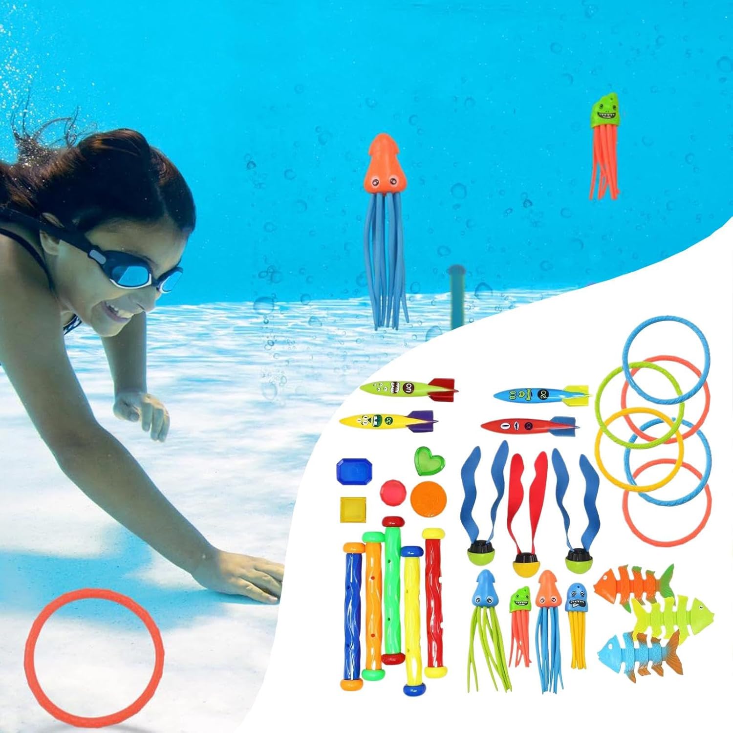 Gioco Acquatico Multifunzione: I 30 componenti diversificati a tema marino favoriscono la scoperta guidata dalla curiosità e supportano attività versatili in piscina, ideali per divertimento familiare interattivo Giochi da piscina giocosi: Design marini ipnotici e dinamiche donano a questi giocattoli un mix unico di appeal visivo e coinvolgimento prolungato, rendendo ogni momento in acqua più gioioso e memorabile Gioco interattivo potenziato: un'esperienza di gioco subacqueo coinvolgente con giocattoli studiati per migliorare la coordinazione motoria e sviluppare le abilità di recupero, amplificando il divertimento Rafforzatore Legami Emotivi: Stimola la complicità familiare con meccanismi di gioco cooperativo, facilitando interazioni qualitative attraverso sfide acquatiche guidate che ricordi condivisi duraturi Praticità e adattabilità: Giochi acquatici facili da trasportare con opzioni di gioco modulari, perfetti per sessioni ricreative in ambienti diversi mantenendo alto il coinvolgimento, sia che si tratti di relax in piscina o divertimento balneare estivo