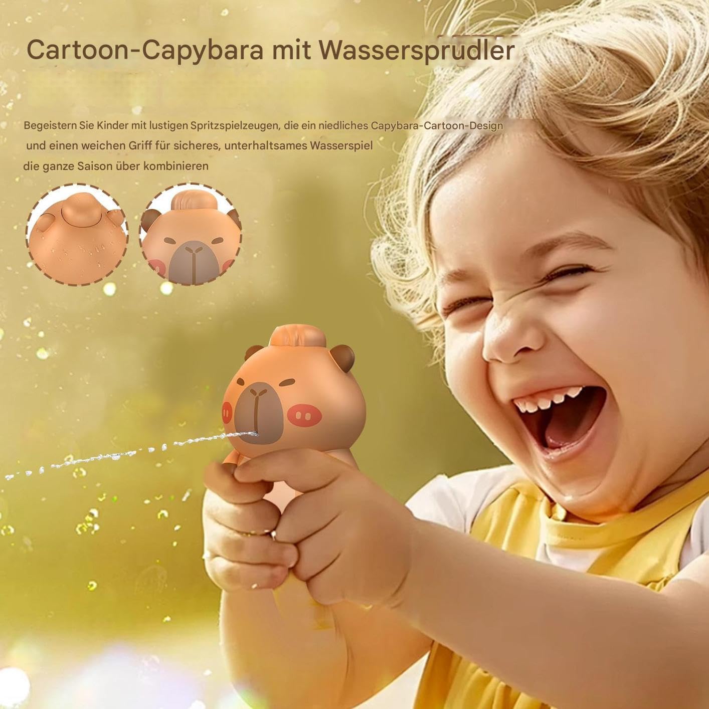 Design carino: fa brillare gli occhi dei bambini grazie all'adorabile design dei cartoni animati Capybara con impugnatura morbida, ideale per il divertimento di gioco e il divertimento in acqua Dimensioni ideali per viaggiare: forma ergonomica e design leggero per una presa confortevole durante il gioco attivo. Una quantità sufficiente di acqua consente un divertimento duraturo in viaggio senza fatica Sicurezza a fuoco: soddisfa gli standard di sicurezza dei giocattoli con superfici delicate sulla pelle, superfici uniformi e struttura adatta ai bambini per un allenamento di gioco spensierato Scenari di applicazione: porta divertimento a feste e feste di famiglia e rende indimenticabili momenti estivi. Ideale per lezioni di nuoto o giochi d'acqua in giardino in diverse situazioni. Design di uscita piccolo: il meccanismo nascosto rilascia nebbie sottili attraverso aperture minime e garantisce così emozionanti giochi d'acqua con momenti di sorpresa inaspettati per un divertimento interattivo