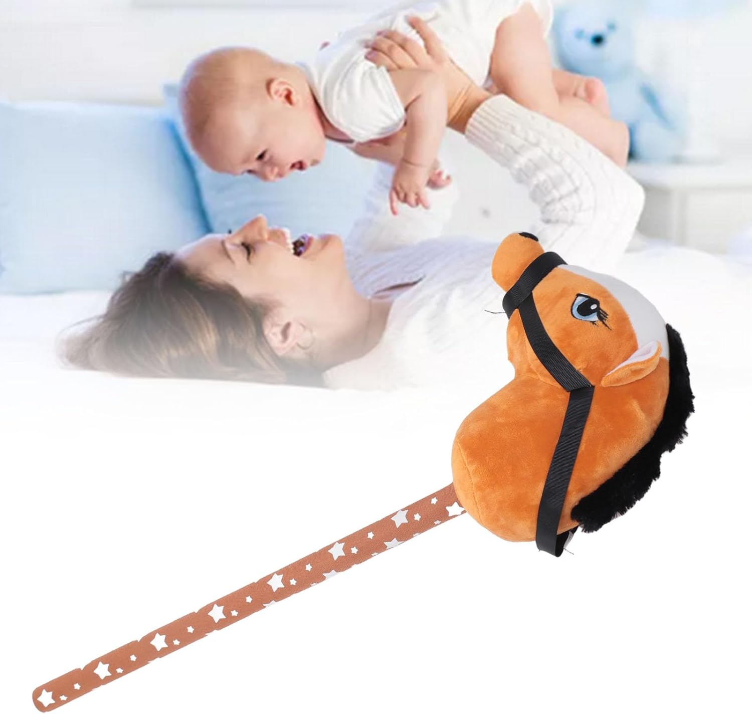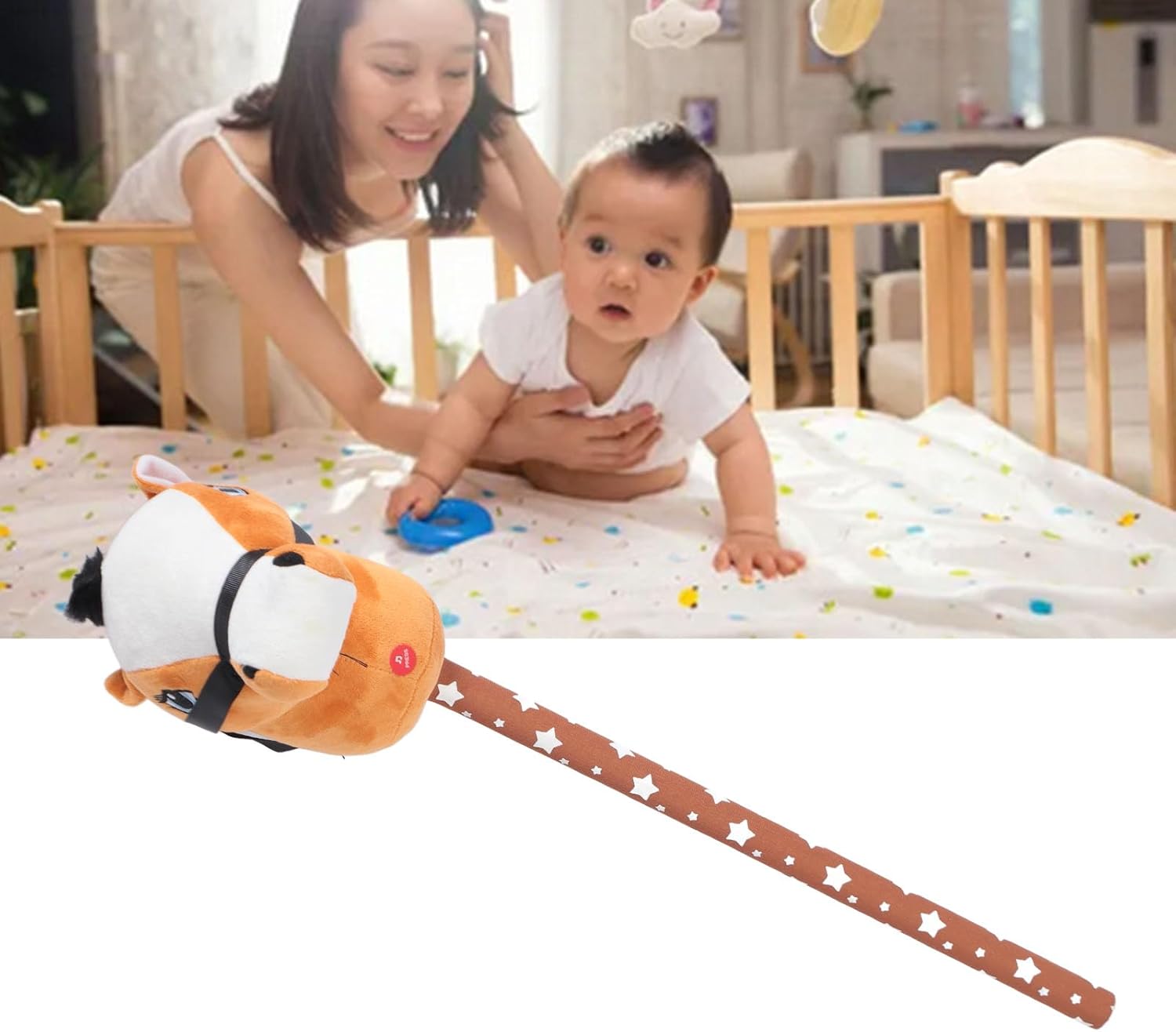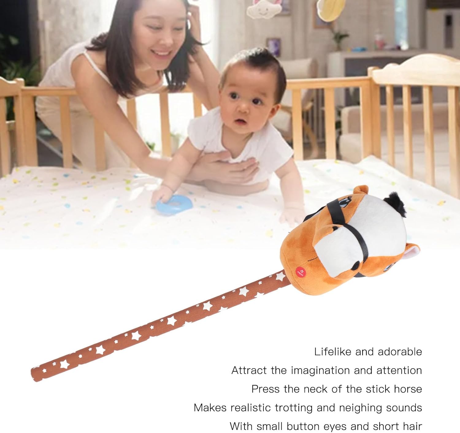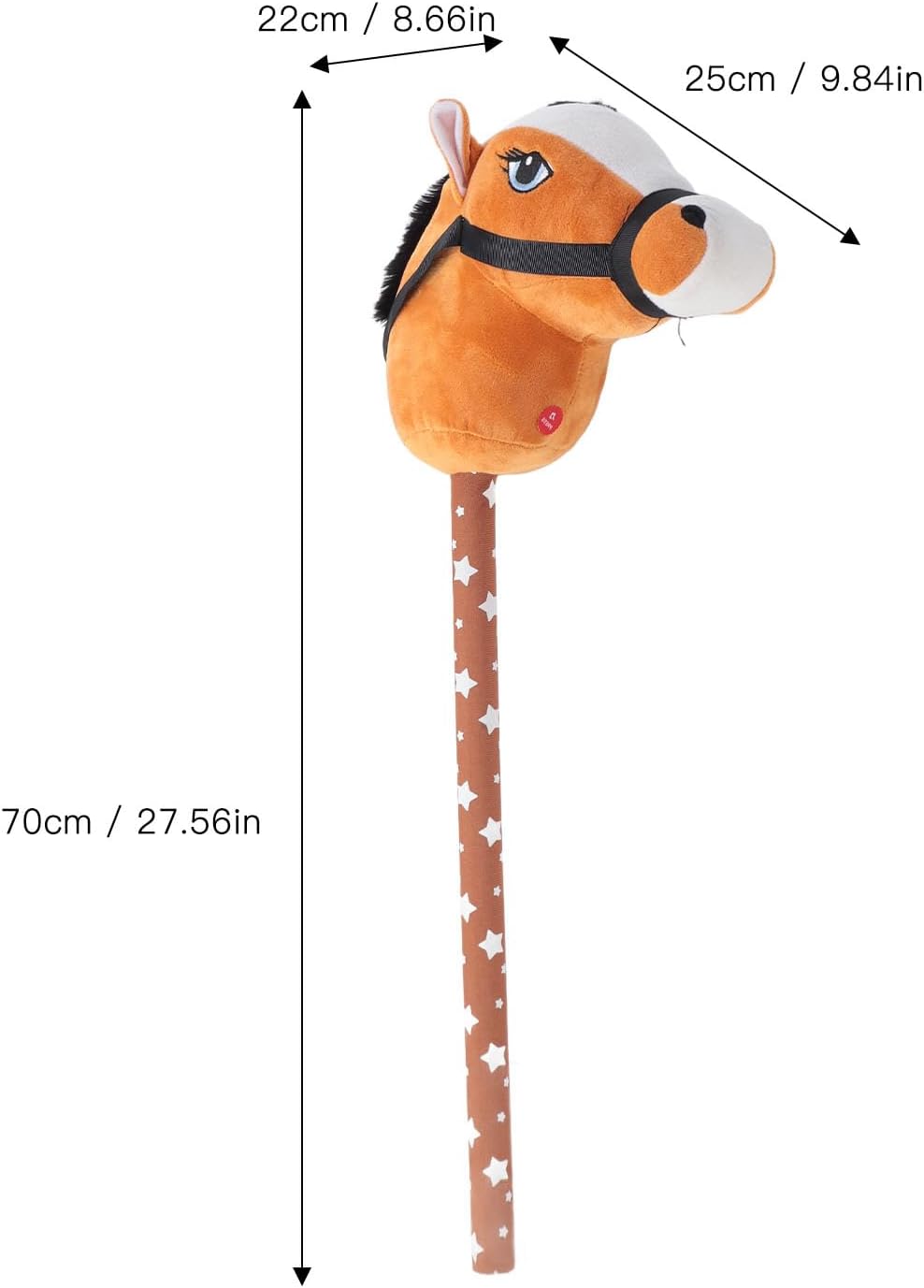 Morbido peluche: realizzato in materiale peluche, questo cavallo bastone è morbido e delicato sulla pelle, offrendo un'esperienza di gioco confortevole e piacevole. Cavallo di peluche realistico: il cavallo stilizzato presenta un design realistico e adorabile che attirerà l'immaginazione e l'attenzione dei bambini. Aspetto adorabile: il giocattolo del cavallo bastone ha adottato una testa adorabile, con piccoli occhi a bottone e capelli corti, che può essere usato come per i tuoi bambini. Suoni di nitrito: quando viene premuto il collo, il cavallo bastone emette suoni di trotto e nitriti, aggiungendosi al gioco divertente. Bastone lungo 70 cm: la morbida testa di peluche ha una maniglia e una briglia, posizionate su un bastone da 70 cm, che è un compagno per i piccoli avventurieri.