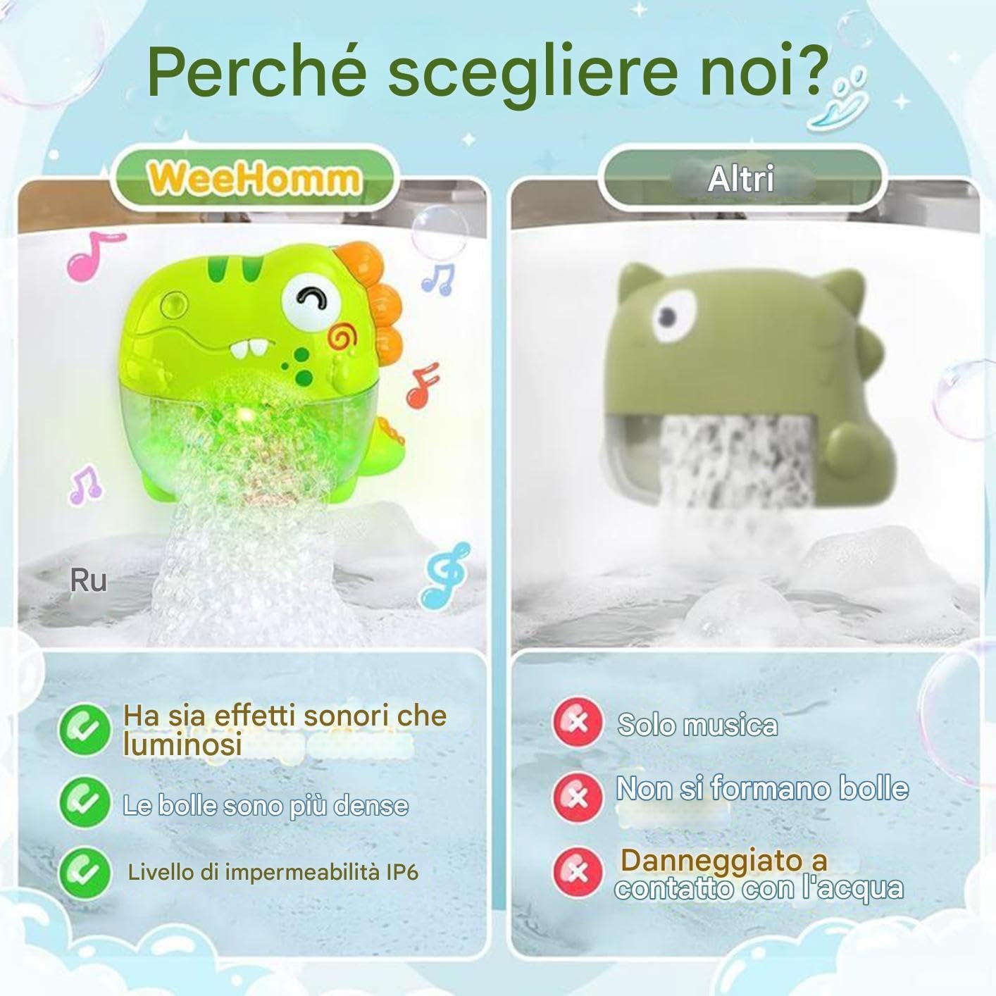 Effetti Luci e Suoni Avvincenti: Arricchisci il momento del bagno con la modalità solo luci oppure combina luci fresche con coinvolgenti effetti sonori tramite la funzione luci con musica, garantendo ore di divertimento sensoriale stimolante. Qualità Affidabile: Prodotto realizzato in ABS premium con spessori controllati, garantisce integrità strutturale nel anche con uso frequente in ambienti umidi Divertimento garantito: Realizzato appositamente per 1-3 anni, il giocattolo da bagno con bolle migliorato sfoggia un design da dinosauro e colori vivaci per creare un momento di immersione gioiosa durante il bagnetto infantile Scelta Regalo: Celebra occasioni speciali come compleanni o Natale con giocattoli da bagno progettati per rendere piacevole il momento vasca, creando ricordi indimenticabili per l'infanzia Funzionamento intuitivo: L'uso a un pulsante semplifica l'operazione, mentre pompa removibile e membrana impermeabile garantiscono praticità durante il gioco nella vasca