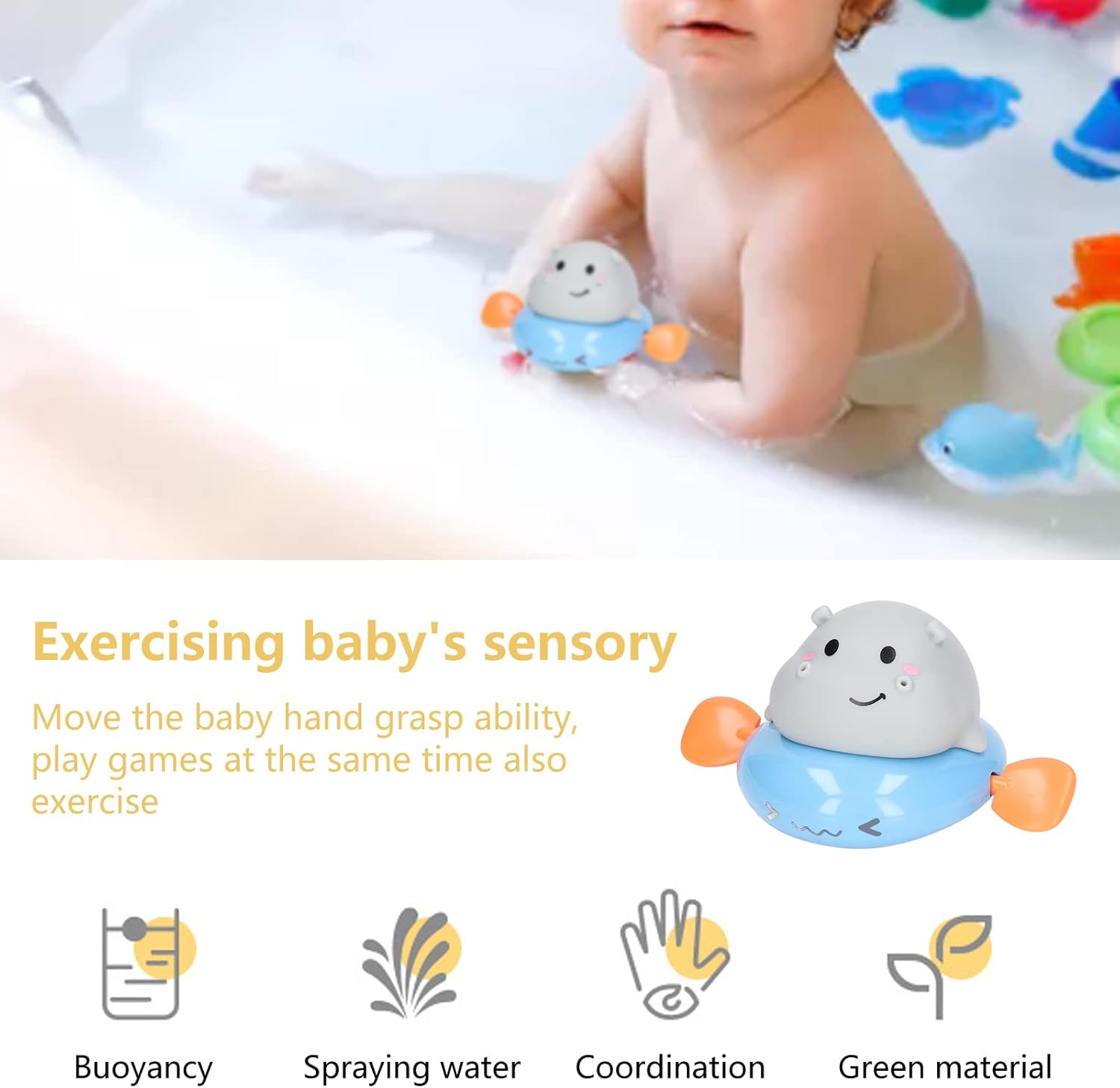 Galleggiante sull'acqua: il nostro giocattolo galleggiante per acqua spray per bambini è un buon nuotatore. I giocattoli possono stimolare il gioco e la conoscenza della galleggiabilità. Giocattolo di caricamento: tirare il guinzaglio posteriore senza elettricità per andare avanti. Che si tratti di bacino, vasca da bagno, piscina, si può svolgere un'interessante gara di nuoto. Spruzzare l'acqua: questo è un interessante giocattolo a spruzzo d'acqua. Quando il giocattolo è pieno d'acqua, spinge il pesce nell'acqua. Successivamente, è possibile spruzzare acqua premendo un pulsante. Calma il tuo bambino: i nostri giocattoli da bagno possono calmare la paura del tuo bambino di resistere al bagno, perché fantastici e divertenti giocattoli da bagno attirano il tuo bambino a fare il bagno. Esercizi sensoriali: i nostri simpatici giocattoli animali possono allenare la capacità del tuo bambino di riconoscere colori e forme che promuovono la curiosità e la coordinazione occhio-mano durante il gioco.