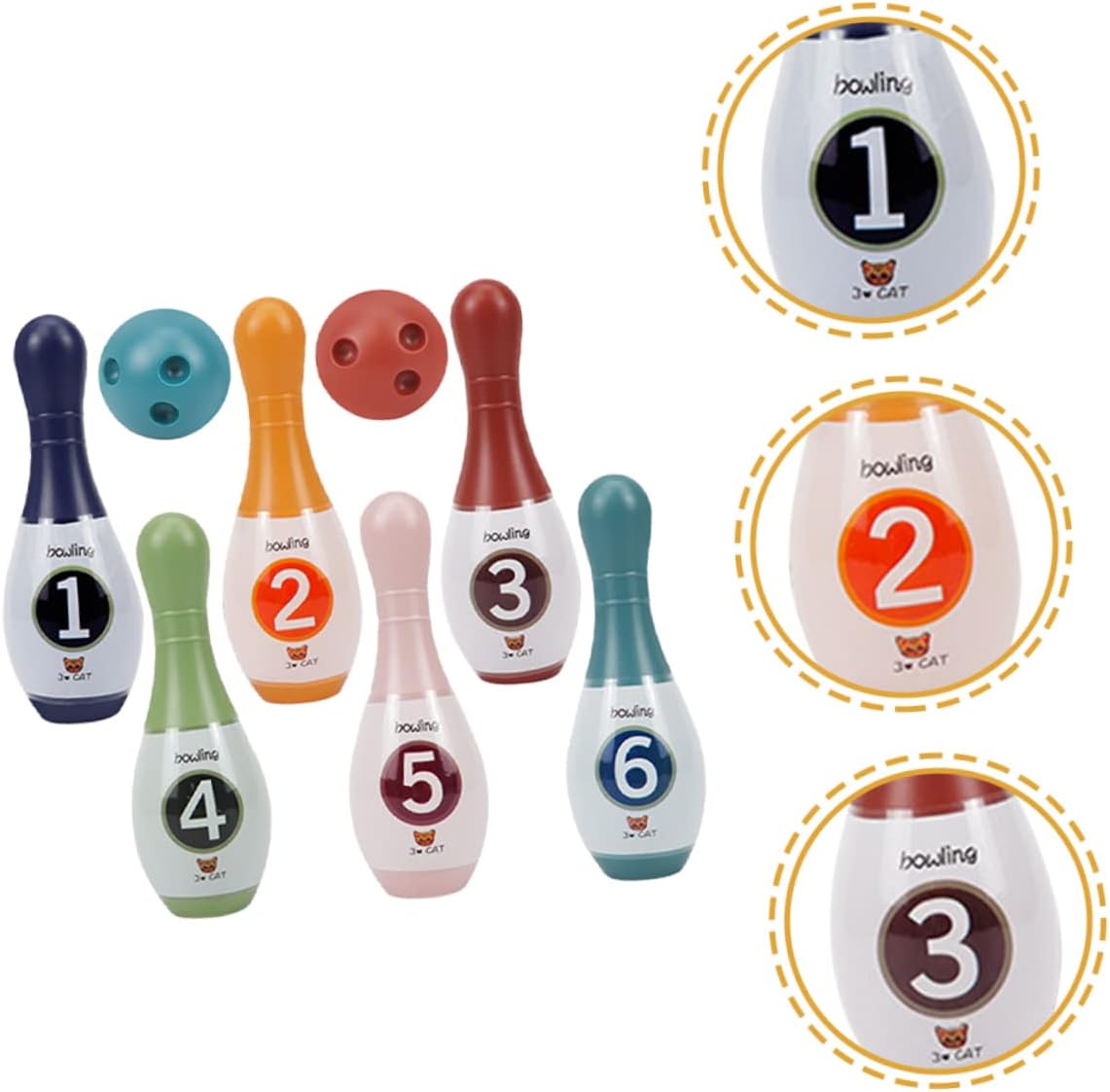 | enthaltene Komponenten | 6 x Bowling Pin Spielzeug;2 x Bowlingkugelspielzeug |