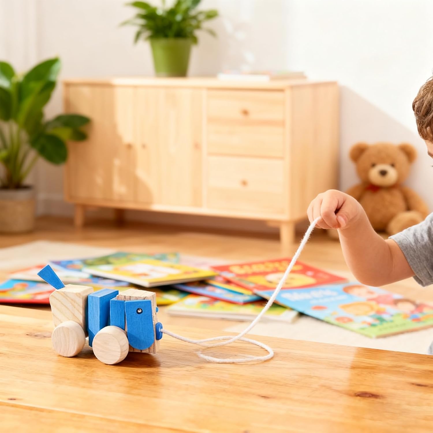 ESSENZIALE PER IL GIOCO REGOLABILE: questo cane da tiro garantisce una facile conservazione ed è realizzato con un design portatile per esterni che consente agli utenti di portarlo comodamente ovunque. La corda da tiro di facile presa migliora il comfort durante le passeggiate o i viaggi in ambienti diversi, rendendolo un giocattolo versatile per le attività quotidiane che si adatta in modo flessibile. Divertente compagno di passeggiate: questo giocattolo da tirare in legno delizia i bambini con la sua funzione di trazione interattiva che favorisce il controllo dell'equilibrio durante le passeggiate all'aperto. Stimola l'interesse per l'esplorazione attraverso un divertente ausilio per la deambulazione ed è ideale per i giochi al chiuso e per le avventure all'aria aperta. Durante il gioco migliora naturalmente le capacità motorie. Il movimento di trazione lo rende un compagno divertente che assicura sempre attività e scoperta. Attività coinvolgenti per i bambini: incoraggiando le capacità di imitazione e arricchendo il gioco interattivo, questo giocattolo da tirare stimola la curiosità con elementi cognitivi ponderati. Dotato di appeal sonoro e visivo, garantisce un gioioso apprendimento multisensoriale durante il gioco in famiglia. È ideale per attività condivise e promuove il legame mentre i bambini esplorano l'ambiente circostante. Costruzione naturale durevole: con la sua costruzione naturale durevole, questo giocattolo da tirare presenta bordi arrotondati e lisci che aumentano la sicurezza durante il gioco e offrono un'esperienza gioiosa ai bambini mentre lo trascinano su diverse superfici. La stabilità e la durata sono garantite da materiali robusti e da una costruzione sicura, che consente un divertimento affidabile su moquette, legno o all'aperto e la longevità del giocattolo da tirare in legno. Sviluppo precoce delle capacità motorie: questo animale da traino in legno con il suo design speciale favorisce una camminata sicura e aumenta la forza degli arti attraverso movimenti combinati di presa e trazione. Migliora efficacemente la coordinazione occhio-mano mentre i bambini si divertono durante il gioco attivo all'interno o all'esterno, soddisfacendo perfettamente i requisiti motori di base per uno sviluppo sano nei primi anni.