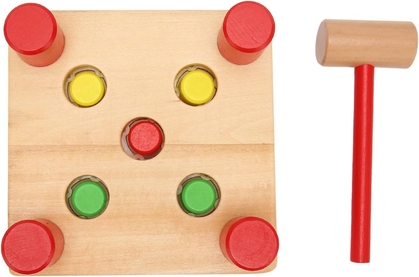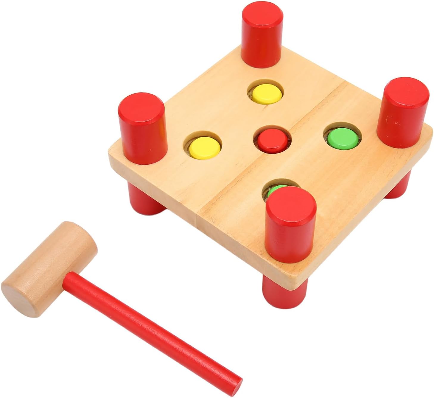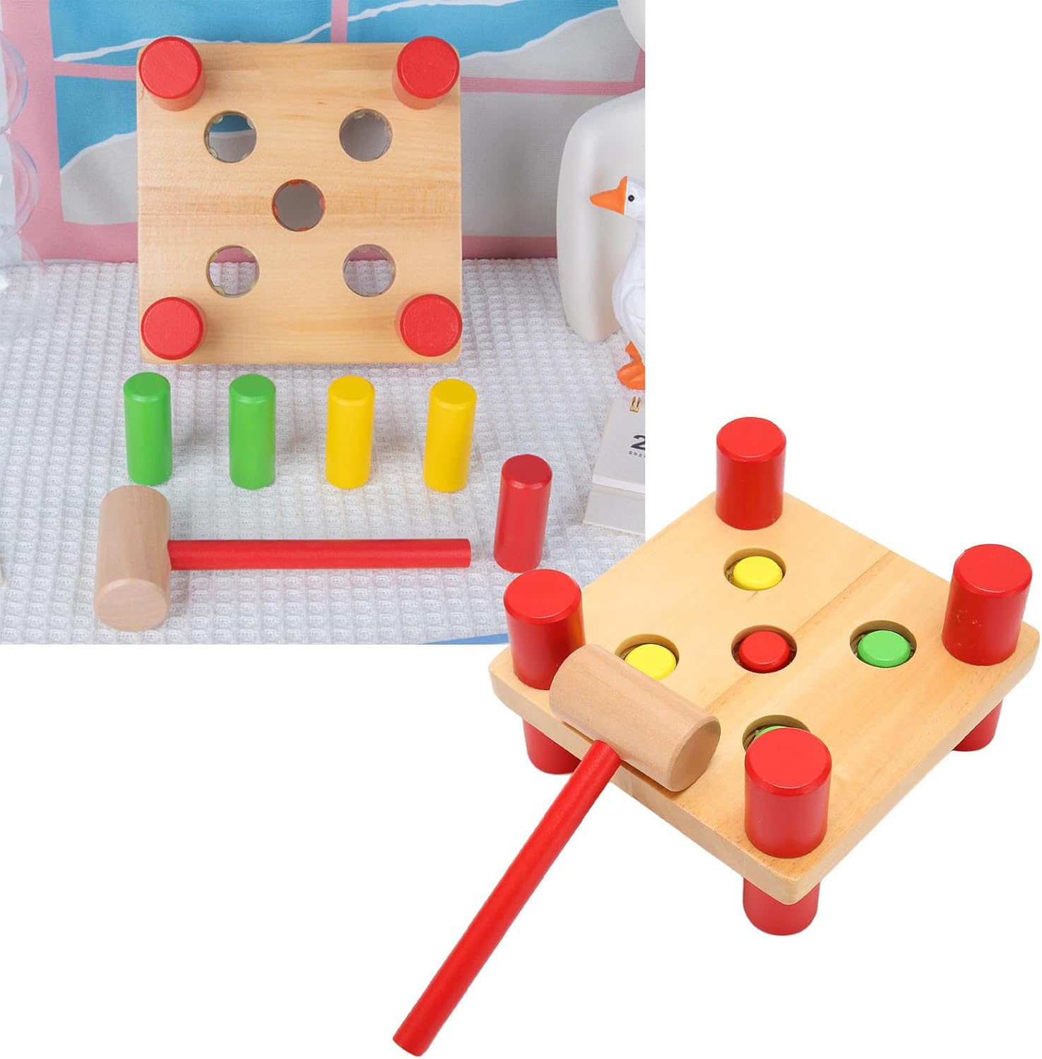 [Materiale in legno sintetico sicuro] Realizzato in legno sintetico atossico con angoli arrotondati, fornisce un ambiente di gioco sicuro per i bambini. [Colorato ed educativo] Questo giocattolo presenta 3 colori vivaci e 9 penne, incoraggiando lo sviluppo visivo e le abilità di conteggio in modo coinvolgente. [Migliora la coordinazione occhio-mano] Con questo giocattolo interattivo da banco per timbratura, puoi sviluppare la coordinazione e le capacità motorie del tuo bambino. [Idea regalo perfetta] Sorprendi tuo figlio con questo martello giocattolo in legno, per compleanni e occasioni speciali. [Stabile e sicuro] Gli anelli di gomma nei fori assicurano che i picchetti siano tenuti saldamente durante l'uso, fornendo stabilità durante il gioco.