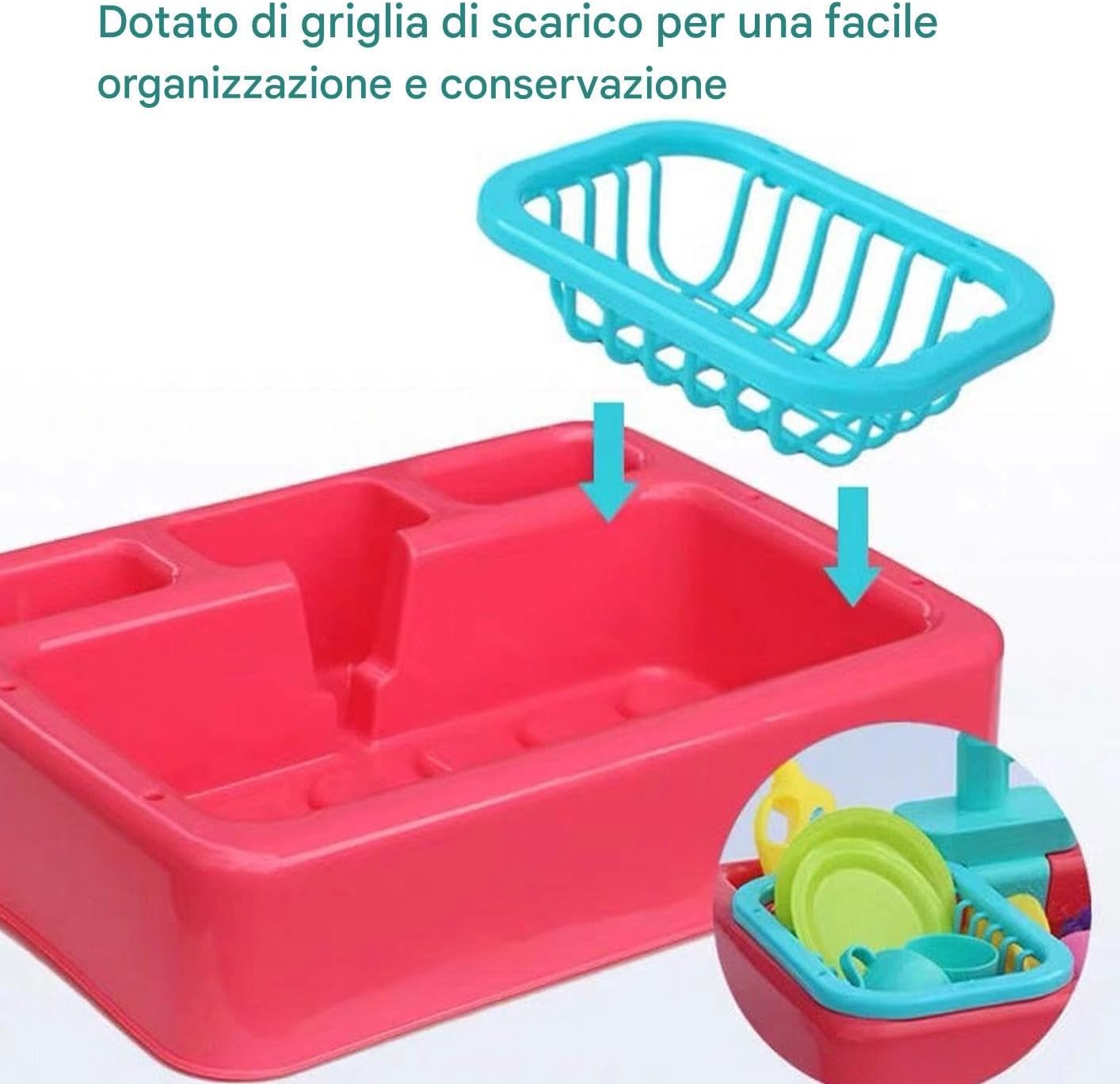 Gioco Simbolico: Sink giocattolo con flusso d'acqua motorizzato e rubinetto girevole 180 alimentato a batteria, ideale per attività acquatiche educative e sviluppo immaginativo Sicurezza Assoluta:Anelli in gomma impermeabili e bordi arrotondati garantiscono protezione durante il gioco con l'acqua. La costruzione robusta resiste all'uso quotidiano mantenendo i bambini al sicuro. 4. Design Creativo: Stimola l'apprendimento attraverso attività di pulizia interattive che imitano quelle reali in cucina, sostenendo il potenziamento delle capacità cognitive e della motricità fine grazie a un gioco pratico coinvolgente pensato per ispirare curiosità e concentrarsi spontaneamente. Soluzione Creativa: Promuove giochi di ruolo creativi spiaggia e cucina con collezione di adattabili, per ambienti interni o esterni per incoraggiare interazioni genitori-figli gioiose durante ogni sessione di gioco istruttivo. Sviluppare Capacità Organizzative: Contenitore giocattoli integrato e grande sviluppano abilità organizzative, includendo scolapiatti multi-livello per pulizia rapida e preparazione efficiente del gioco.