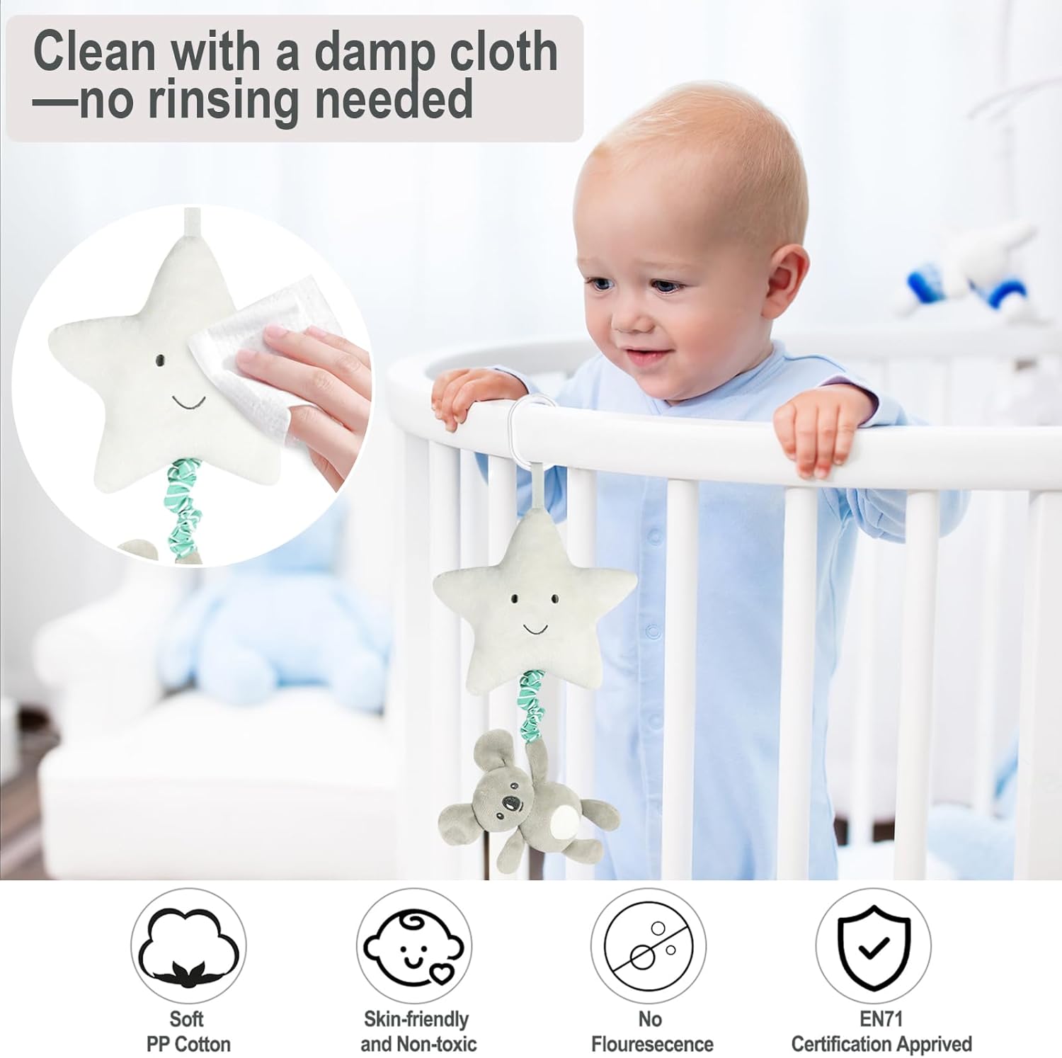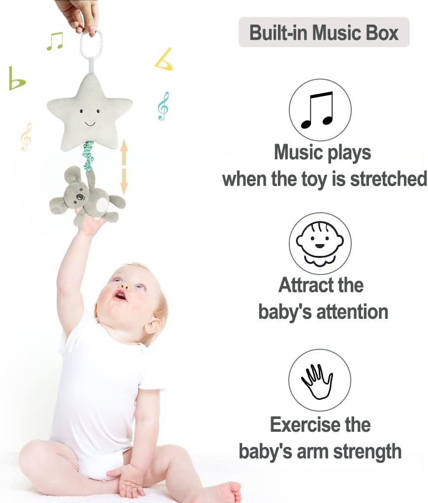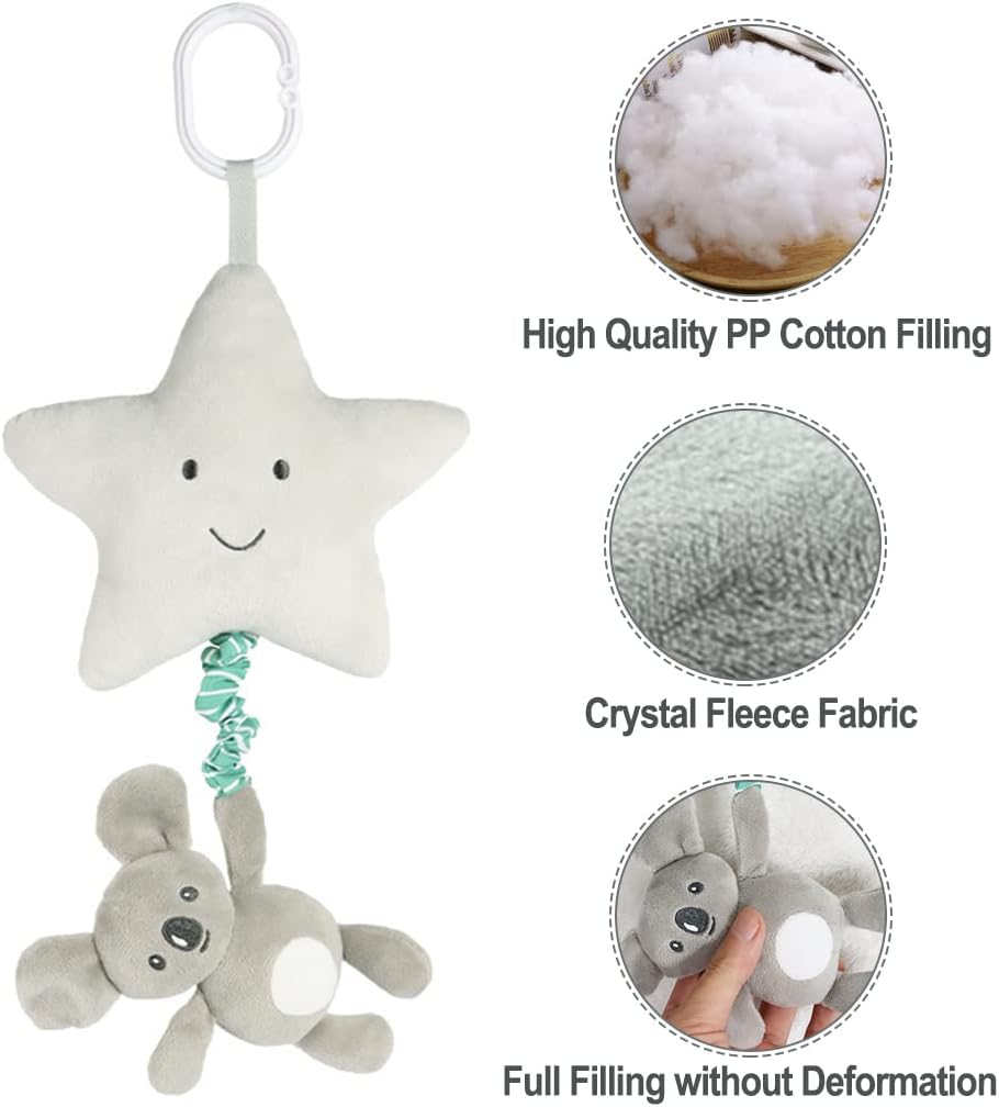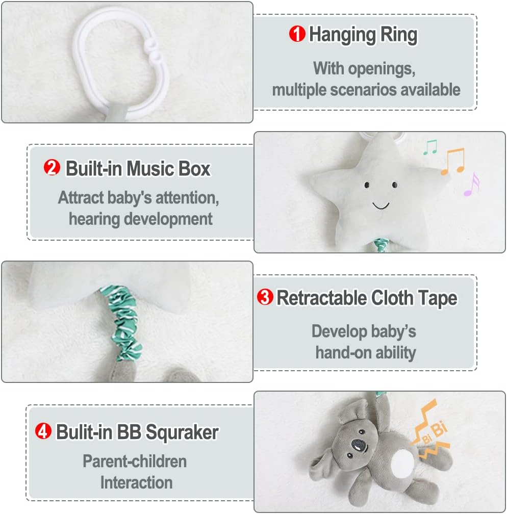Protegge la visione del bambino: colore a bassa saturazione, riduce la stimolazione visiva del bambino, adatto per giocattoli per neonati, giocattoli per bambini da 0 a 6 mesi, giocattoli per carrozzine per bambini da 6 a 12 mesi Tessuto super morbido di cristallo: i giocattoli per carrozzina sono realizzati in tessuto super morbido di cristallo, morbido e confortevole, possono essere lavati senza sbiadire e si prendono cura della pelle del bambino Promuovere lo sviluppo sensoriale: i giocattoli sensoriali del bambino 0 6 mesi carillon integrato, quando il bambino tira il giocattolo appeso suonerà musica, attirerà l'attenzione del bambino, promuove lo sviluppo dell'udito del bambino Esercizio per la forza del braccio: i giocattoli da appendere per bambini hanno un design a corda retrattile che consente al bambino di costruire la forza del braccio tirando la bambola per ruotare il carillon orologio Multiuso: design ad anello da appendere, facile da installare, i giocattoli per bambini possono essere appesi all'auto, al passeggino, alla culla, dove va il bambino e accompagnare il bambino a giocare