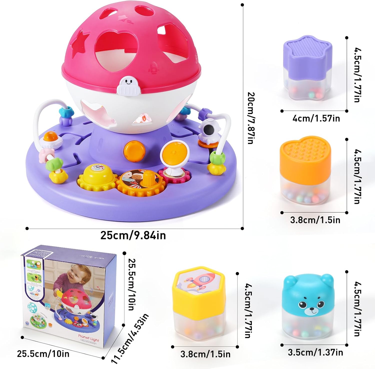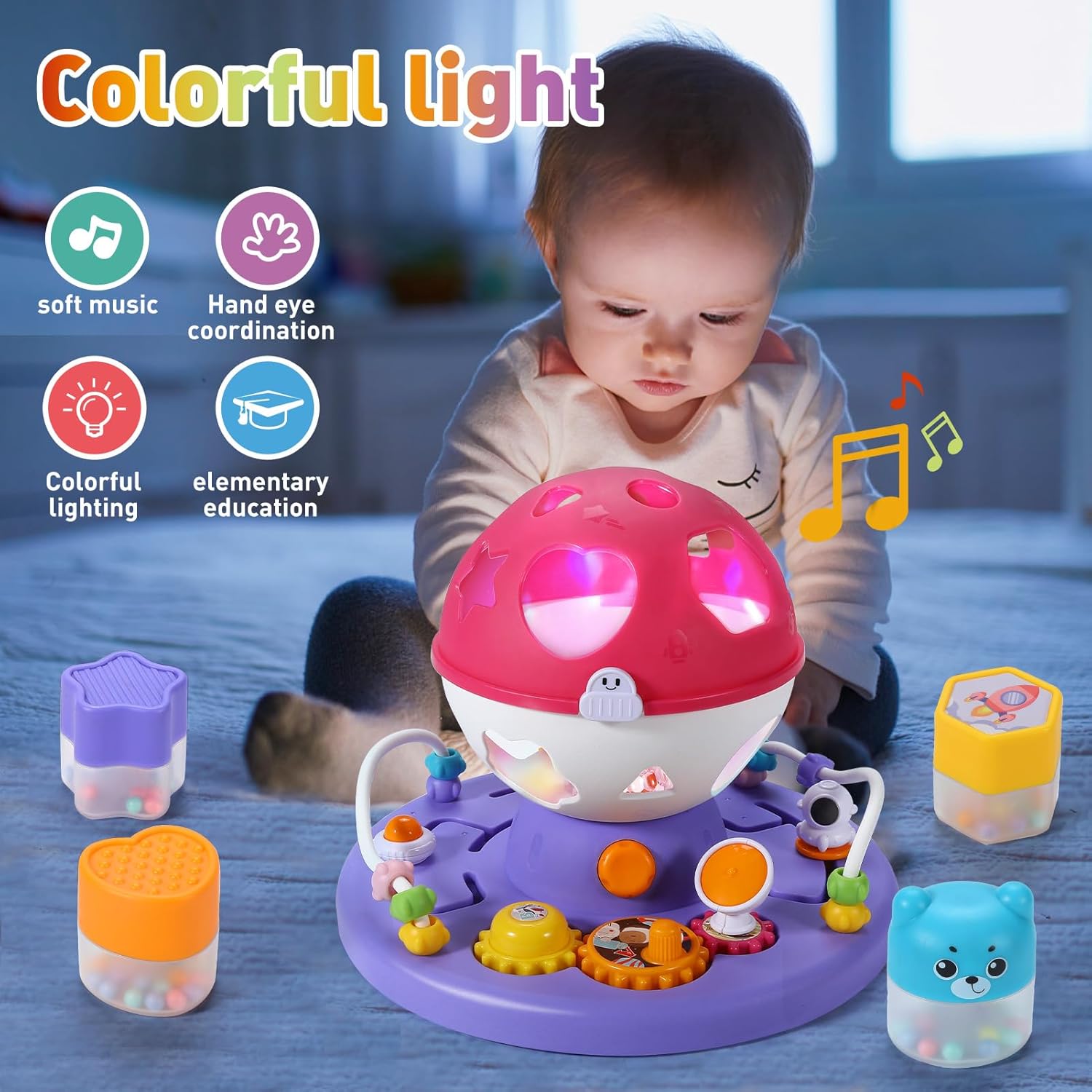 【Giocattoli per bambini con luci e musica】 Con luci colorate e musica, possono essere proiettati in luoghi diversi, creando un'atmosfera calda e stimolando l'immaginazione del tuo bambino. 【Giocattolo per l'ordinamento delle forme per neonati】 Posizionando la forma nella posizione appropriata, puoi allenare l'abilità di riconoscimento del colore del bambino e l'abilità di discriminazione della forma dell'oggetto. 【Sicuro e durevole】 I giocattoli musicali per bambini sono realizzati in plastica ABS di alta qualità e hanno una superficie liscia senza spigoli vivi. 【Giocattoli multifunzionali per l'educazione precoce】 Una varietà di mini giochi per l'addestramento delle piccole mani consente alle piccole mani del tuo bambino di esplorare e migliorare la destrezza. Promuovi in modo significativo le capacità motorie e la coordinazione occhio-mano del tuo bambino. 【Ottimo regalo per bambini】 Scelta perfetta come regalo per neonati, regalo di compleanno per ragazzi e ragazze di 1 anno, idea regalo per Natale, Ringraziamento, ecc.