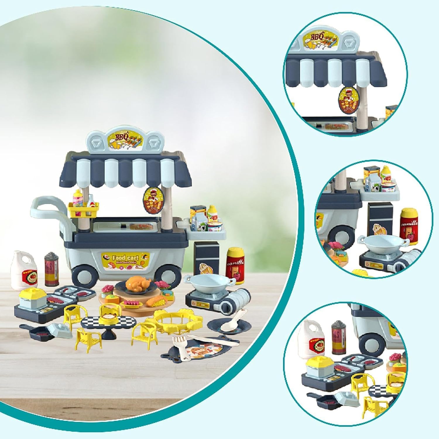 【Vari accessori】: il set di gioco include una varietà di modelli alimentari realistici come verdura, frutta, carne e pane, oltre a utensili da cucina come piatti, ciotole, cucchiai, forchette e accessori per la tavola come tavolo e sedie. I bambini possono partecipare all'intero processo, dalla preparazione degli ingredienti alla cottura e al servizio dei pasti. 【Effetti sonori e luminosi】: Dotato di effetti sonori e luminosi, questo set da gioco per barbecue per bambini rende l'esperienza del barbecue più realistica, attirando l'attenzione dei bambini e aggiungendo divertimento alle loro attività di gioco di ruolo (alimentatore AA richiesto, ma non incluso) 【Divertimento in cucina fai da te】: questo set di giocattoli con carrello da barbecue simulato supporta il gioco della grigliata fai da te. I bambini possono mescolare e abbinare diversi modelli di cibo in base alle loro preferenze e creatività, consentendo loro di esercitare appieno la loro immaginazione e le loro capacità creative. 【Gioco di ruolo】: In scenari di gioco di finzione, i bambini possono assumere ruoli come chef, cameriere/a o cliente. Attraverso l'interazione con i coetanei, ampliano le trame e le ambientazioni di gioco, aiutando a sviluppare abilità sociali e capacità di linguistica, promuovendo al contempo il pensiero logico e la capacità di problem solving, oltre a migliorare la motricità fine e la coordinazione occhio-mano. 【Design realistico】: questo mini set di giocattoli per barbecue per bambini è realizzato con accessori che assomigliano molto a un vero barbecue all'aperto, rendendo i bambini coinvolti nel gioco del barbecue e portando molto divertimento
