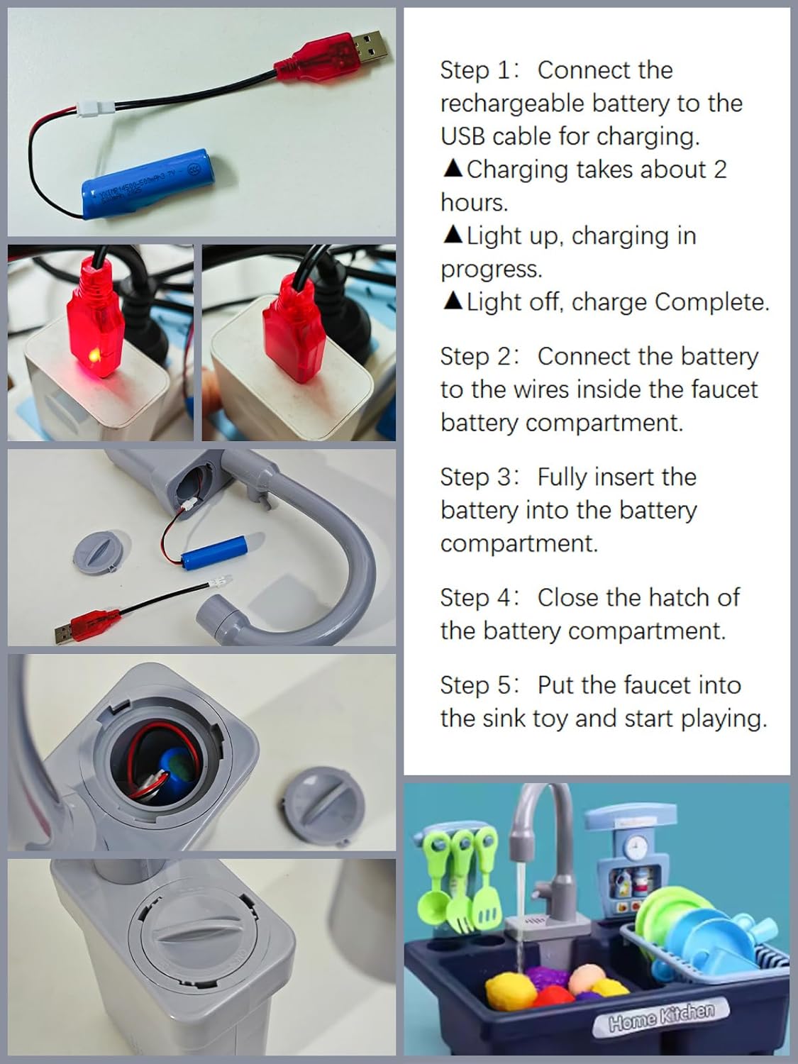 【Contenuto del pacchetto】 Include rubinetto 1pcs (accessorio del giocattolo del lavandino), 1 batteria ricaricabile e 1 cavo USB. 【Materiale】Plastica. 【Batteria】Si prega di notare che a causa del design speciale dell'interfaccia della batteria, questo progetto può utilizzare solo batterie ricaricabili corrispondenti e cavi USB. 【Buone prestazioni impermeabili】La scatola della batteria è dotata di una striscia adesiva impermeabile all'interno, che non sarà danneggiata anche se lasciata in acqua per un lungo periodo di tempo. 【Bambini giocattolo cucina lavandino rubinetto】Bordi e angoli lisci per prevenire lesioni e garantire la sicurezza dei bambini. Facile da pulire per un uso duraturo. Lascia che i tuoi figli trascorrono un'infanzia molto felice con questo interessante giocattolo.