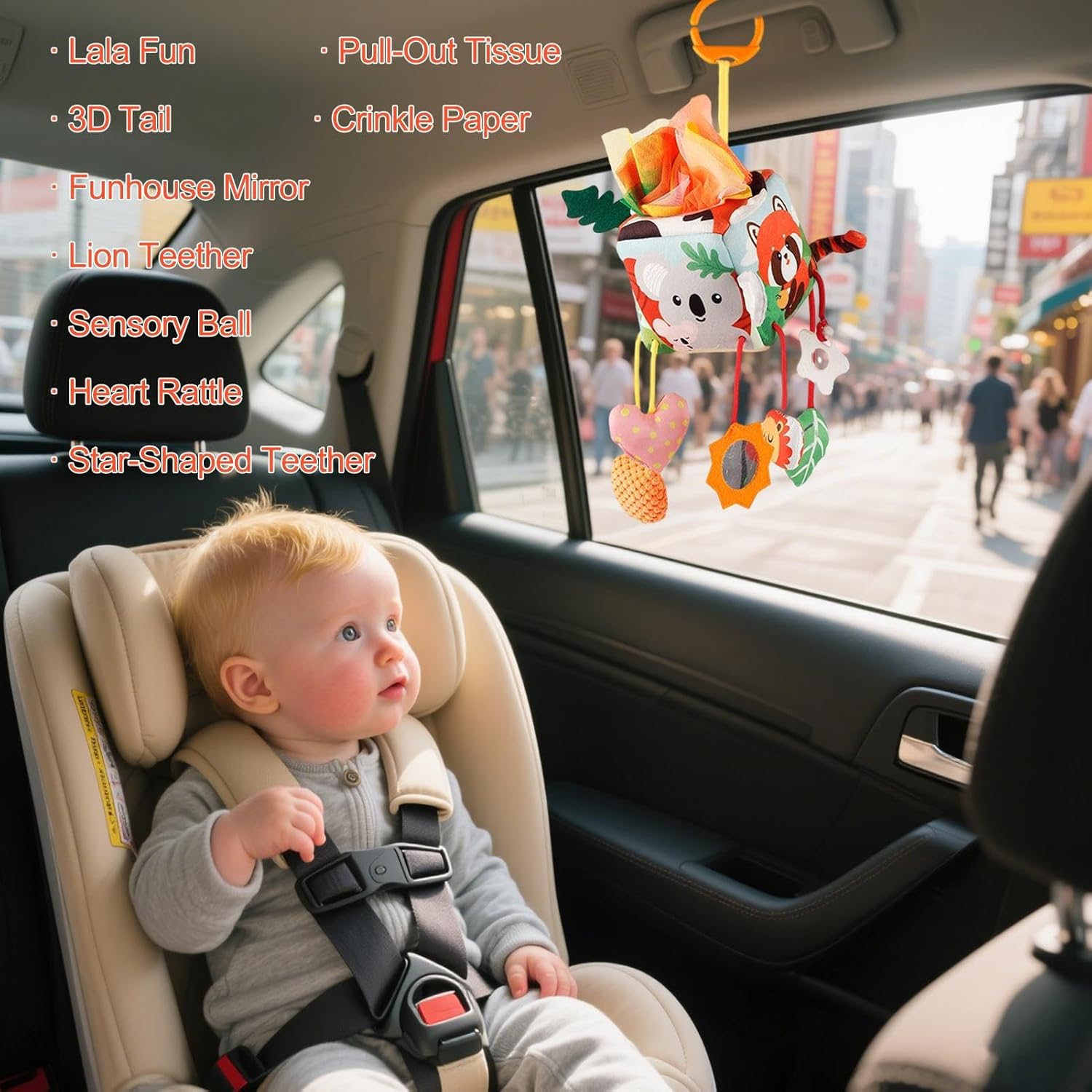 Vantaggio combinato: i giocattoli per seggiolini auto per bambini combinano il design estetico con la funzione divertente. Contribuiscono a creare un ambiente di sonno tranquillo e confortevole durante i viaggi o i sonnellini quotidiani. Le texture morbide e l'aspetto accattivante aumentano l'attrattiva visiva dell'area bambini e promuovono un senso di benessere. Regalo eccellente: progettato appositamente come regalo perfetto per i viaggi di vacanza, questo giocattolo per seggiolino auto offre intrattenimento che avvicina famiglie e amici durante il viaggio. Rende i viaggi in macchina più piacevoli per i bambini e l'intero viaggio molto più rilassato e pratico per i genitori. CONFORTEVOLE E DUREVOLE: Realizzato con materiali morbidi di alta qualità che non cedono sotto pressione, questo giocattolo per passeggino offre una sensazione rilassante e un rapido rimbalzo. Arricchisce i momenti interattivi sia all'interno che all'esterno senza sacrificare la qualità. Comoda maneggevolezza e utilizzo: con il pratico meccanismo a clip, i giocattoli del seggiolino auto semplificano notevolmente il processo di fissaggio e riducono lo sforzo. Ciò porta a maggiore gioia e comodità durante le gite in famiglia poiché i giocattoli sono rapidamente disponibili. Il design intuitivo garantisce un utilizzo affidabile in varie situazioni, sia in macchina che durante brevi soste. La facile manutenzione lo rende una soluzione duratura per il divertimento giocoso di guida quotidiano: il design creativo e la gamma di accessori accattivanti stimolano la curiosità dei bambini. Questi giocattoli per seggiolini auto trasformano i viaggi in momenti piacevoli e riducono l'irrequietezza grazie alle opzioni di gioco tattile.