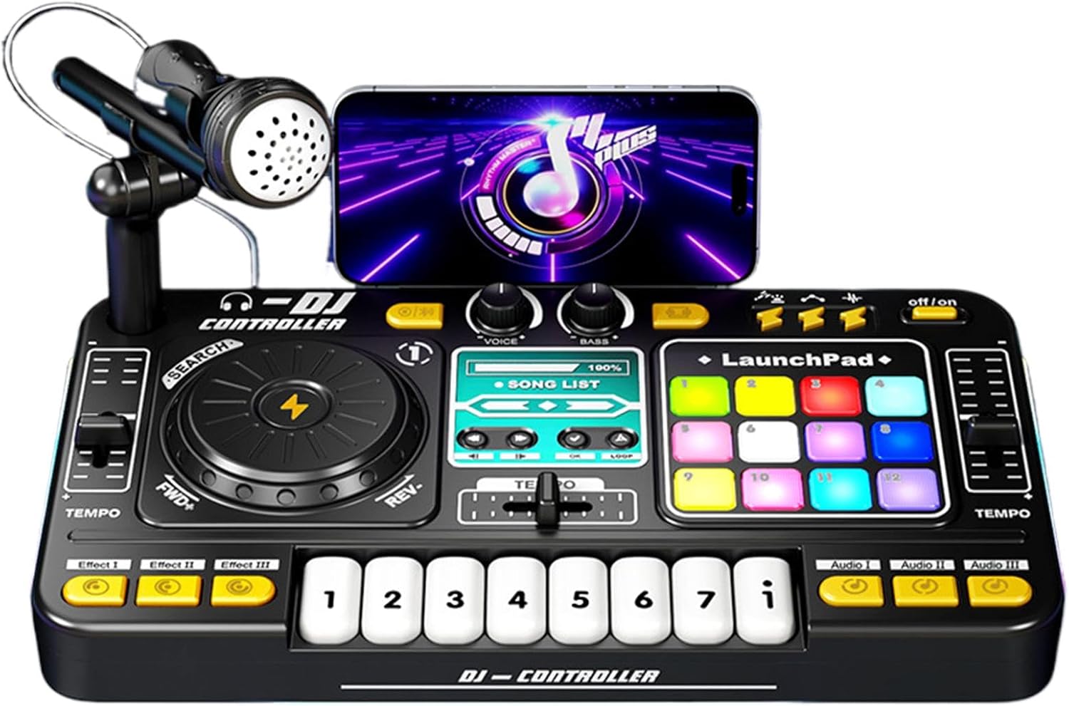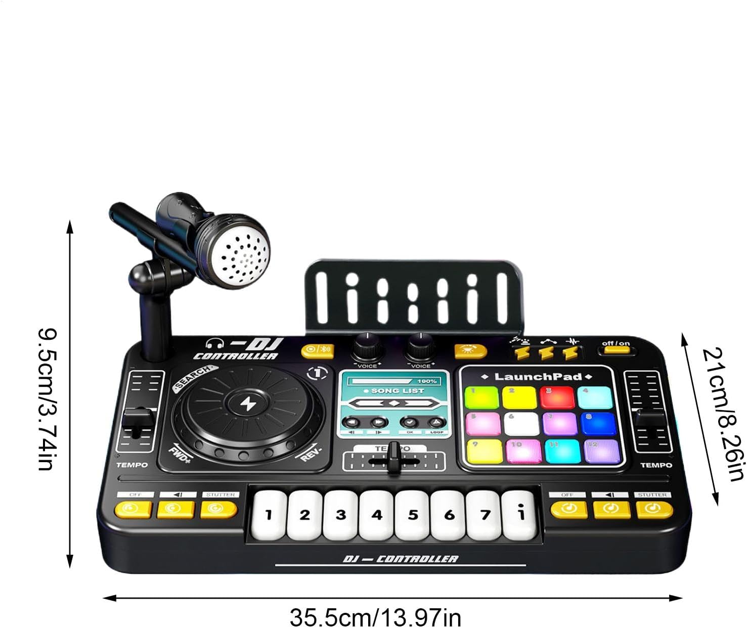 Materiale robusto: realizzato con materiali robusti, questo pratico giocattolo per pianoforte di musica è ideale per tutte le età. Rilascia il tuo maestro DJ interiore e crea il tuo unico meglio che senza soluzione di continuità; Completo di una batteria integrata a carico USB per portabilità senza sforzo Facile da trasportare: dotato di regolazione del volume, questo giocattolo per pianoforte non garantisce disturbi per i familiari, presenta funzioni di registrazione e riproduzione e si collega in modalità wireless al pH mobile, fornendo riproduzione musicale illimitata con 3 effetti sonori DJ, 12 MIDI e 12 effetti sonori chiave; tutto in un pacchetto portatile Incoraggia l'espressione musicale: design realistico, tra cui microfono e caratteristiche wireless, ripristina perfettamente il giradischi DJ con effetti di illuminazione, ispirando i bambini a ballare e diventare rocker in mentre sembrano incredibilmente fighi Facile da usare: lascia che i bambini ospitino piccoli concerti: connettiti in modalità wireless a pH, crea musica con amici e regola il microfono per ore di divertimento, migliorando i legami familiari con il piano giocattolo con microfono Buona scelta per i regali: giocattolo per pianoforte interattivo con varie funzioni di miscelazione della musica e chiavi colorate, suscitando immaginazione ed espressione musicale: un regalo delizioso per i compleanni