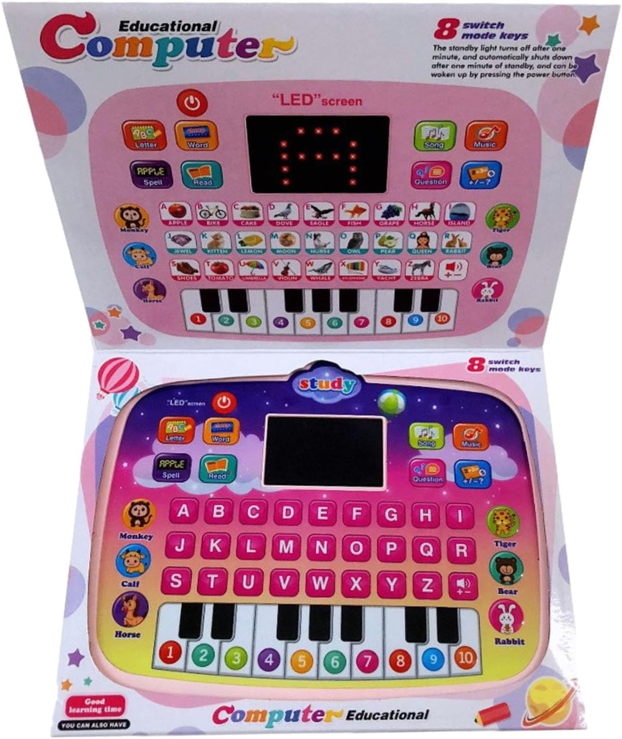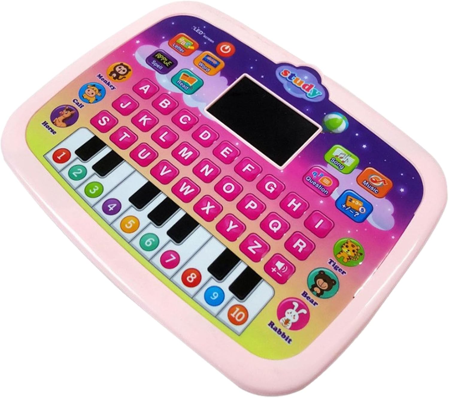 Giocattolo per tablet per bambini a 8 modalità: il giocattolo per tablet per bambini include 6 modalità di apprendimento + 2 modalità musicali, schermo LED, tastiera del pianoforte, spegnimento automatico senza funzionamento per più di 1 minuto e 3 regolazioni del volume. Ottimo per la prima educazione: Toy Laptop include lettere, numeri e parole come animali, cibo, frutta, personaggi e merci, i bambini possono imparare molte abilità da esso. Giocattolo musicale funzionale: i bambini possono utilizzare la tastiera del pianoforte di simulazione per suonare le proprie canzoni, il laptop per bambini ha più di 30 melodie, canzoni e versi di animali interessanti. Incredibile funzione di domanda: Baby Toys Tablet può porre domande su lettere, parole, numeri, ecc. Per consolidare le proprie conoscenze. Quando i bambini vengono incoraggiati e affermati per la risoluzione di vari problemi, saranno fiduciosi e diventeranno studenti attivi! Ottimo regalo per i bambini: il tablet di apprendimento per i più piccoli è consigliato per i bambini di età compresa tra 1, 2, 3 e 4 anni. I bambini possono esplorare più funzioni e iniziare un interessante viaggio di apprendimento da soli.