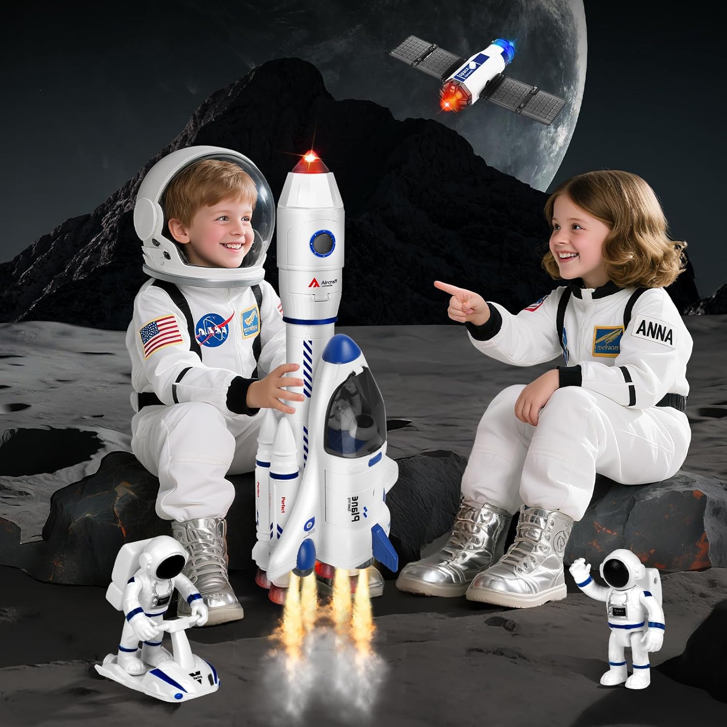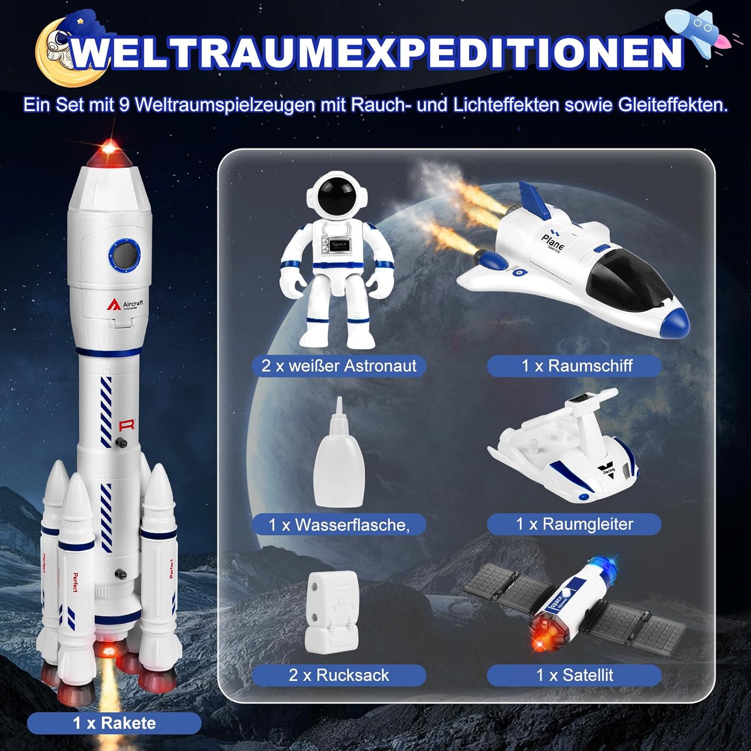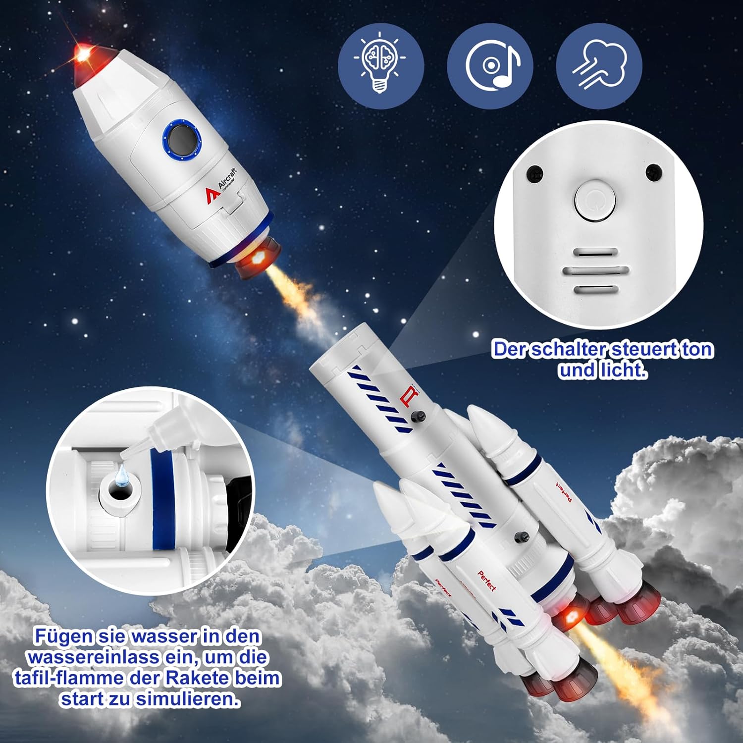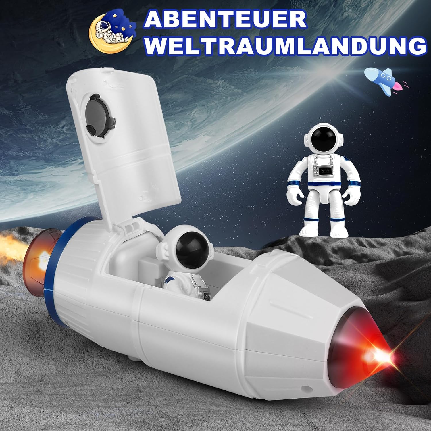【Giocattolo Razzo Spaziale 8 in 1】Questo set di giocattoli a forma di razzo spaziale include un razzo x1 (effetti sonori), un astronauta bianco x2, uno zaino x2, un'astronave x1 (effetti sonori), un aliante x1, una bottiglia d'acqua x1, un satellite artificiale x1 (luminosità). È disponibile un'ampia varietà di accessori per soddisfare l'immaginazione dei bambini sull'esplorazione spaziale. 【Giocattolo Razzo】Questo razzo non solo ha una forma realistica, ma emette anche un suono ruggente, lampeggia luci fredde e rilascia fumo realistico, simulando vividamente la scena scioccante di un lancio di razzo! Inserisci tre batterie da 1,5 AAA (non incluse) nel razzo del primo stadio e aggiungi un po' d'acqua per simulare il processo del razzo, dal lancio riuscito alla separazione dei booster dal corpo principale del razzo. Un'avventura spaziale immersiva per bambini. 【3, 2, 1 Lancio】 Il set di giocattoli con razzi spaziali può essere smontato e rimontato liberamente, permettendo ai bambini di combinarlo in monopattini, satelliti o razzi per creare il proprio mondo spaziale! Che si tratti di guidare un monopattino attraverso una stazione spaziale o di pilotare un satellite per esplorare un pianeta sconosciuto, ogni tipo di gioco può ispirare la creatività e le abilità pratiche dei bambini. 【Materiali adatti ai bambini】 Questi razzi spaziali sono realizzati in materiale ABS di alta qualità. Sono lisci e delicati al tatto, con colori vivaci e brillanti, angoli e bordi arrotondati e senza spigoli. Sono robusti e resistenti, adatti ai bambini. Con questi colori vivaci, i bambini possono dare libero sfogo alla loro immaginazione e intraprendere le proprie avventure nell'universo! 【Regalo ideale per bambini di 3, 4, 5, 6, 7, 8 anni】 I razzi spaziali non sono solo adatti per giochi di ruolo nello spazio, ma sono anche un regalo eccellente per Halloween, Pasqua, Natale o altre occasioni. Immagina gli occhi del tuo bambino illuminarsi quando riceve il regalo, mentre assembla con entusiasmo il razzo e simula la missione degli astronauti. Aiutalo a realizzare il suo sogno di spazio e a risvegliare la sua curiosità e il suo desiderio di esplorare l'universo!
