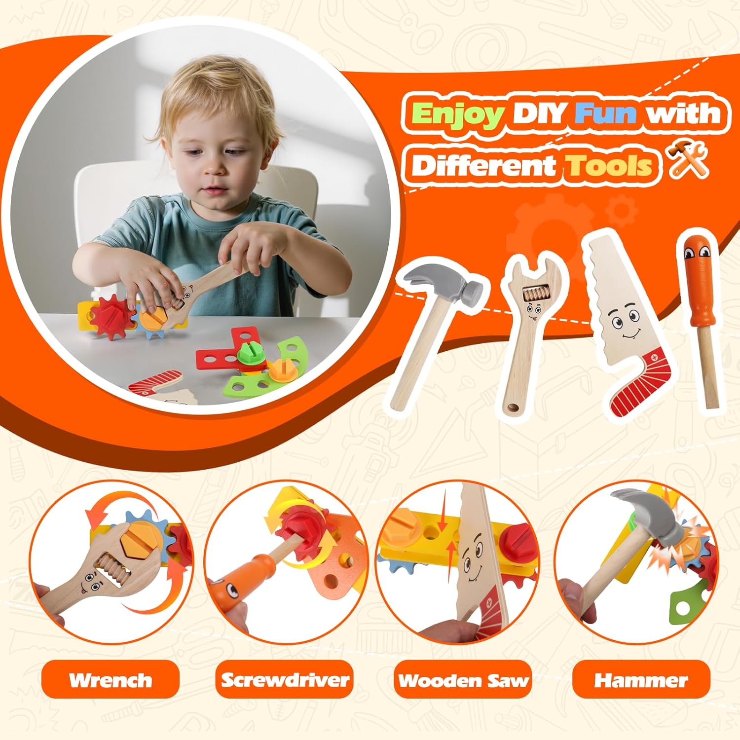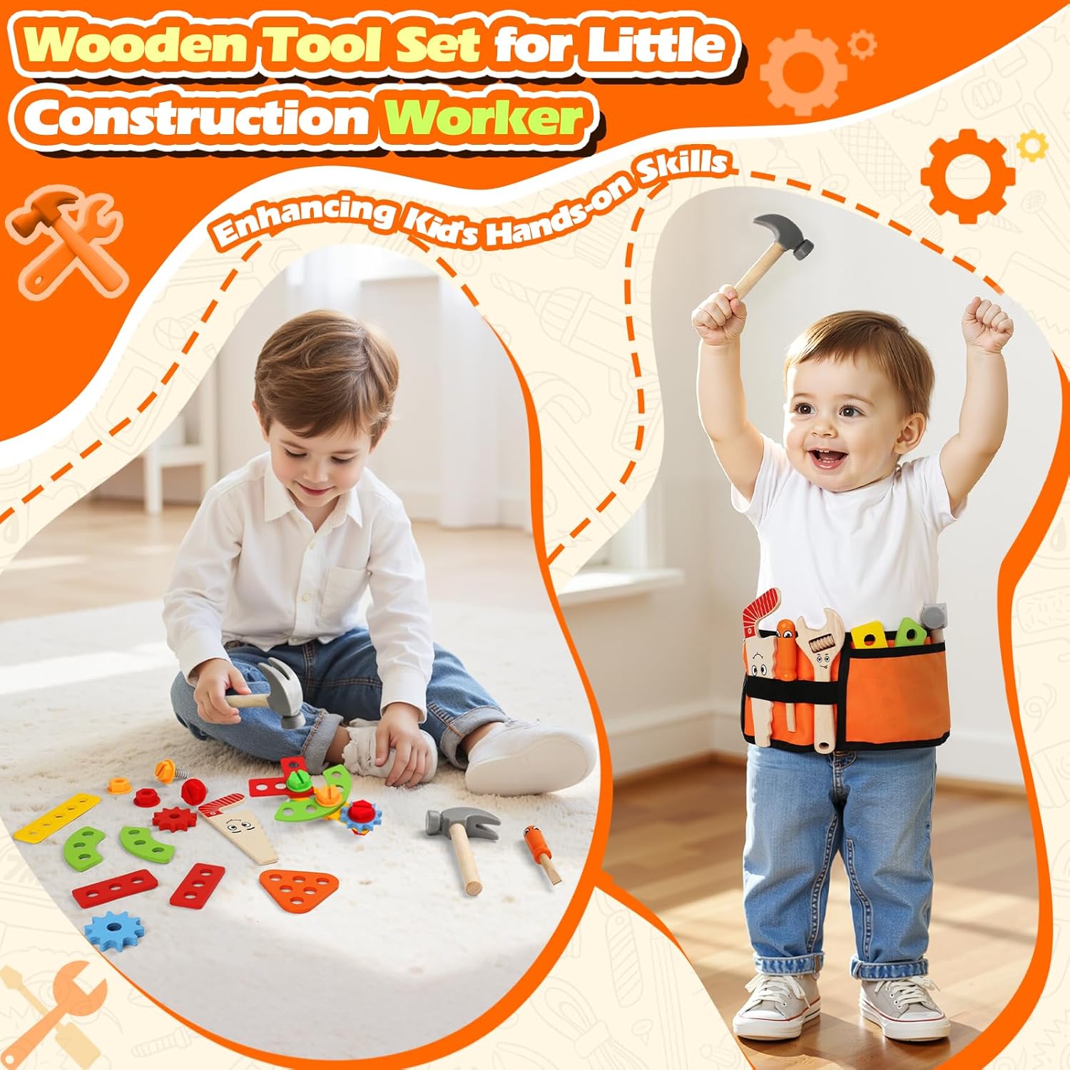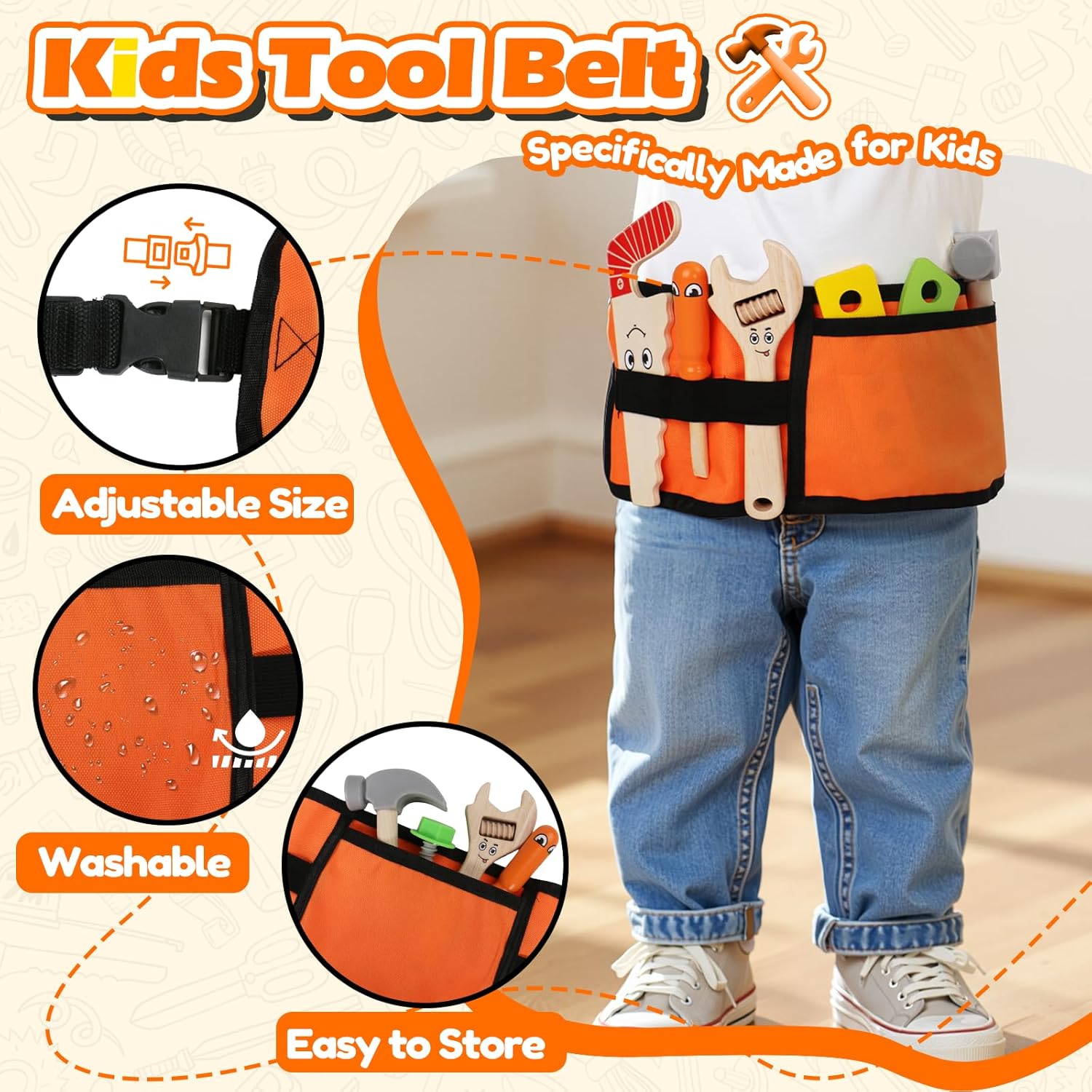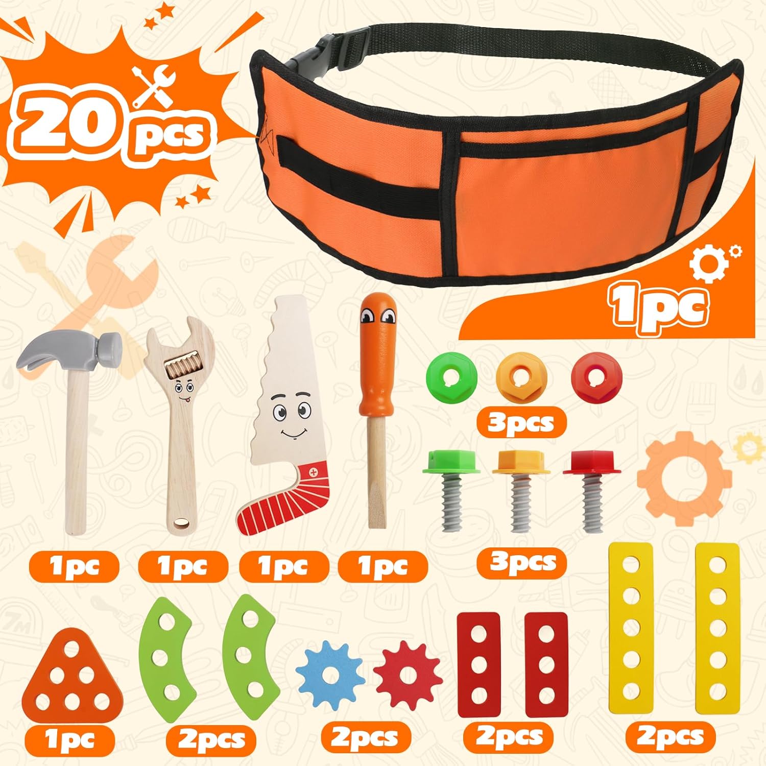 20 Pezzi Giochi Bambini 2 Anni : Gioco bambino 2 anni è dotato di 1 cintura porta attrezzi arancione, 4 utensili diversi e altri piccoli accessori. Quando uscite per divertimento o riunioni familiari, è facile imballare e portare, il che consente ai bambini di imbarcarsi nella "avventura ingegneristica" a casa, nel parco o in movimento, e godere del divertimento pratico in qualsiasi momento. È un buon giochi educativi per bambini di 2, 3 e 4 anni. Giochi Bambini 2 3 Anni con Cintura Porta Attrezzi Regolabile :Giochi montessori 2 anni con cintura porta attrezzi regolabile è più portatile e leggero, che consente ai bambini di portare i loro strumenti facilmente. Usandolo, diventano piccoli costruttori! Funziona anche come travestimento per Halloween o eventi scolastici. La cintura strumenti contiene tutti gli strumenti giocattolo, aiutando i bambini a sviluppare la buona abitudine di ordinare dopo aver giocato. Divertente Giochi Educativi 2 Anni:È sia uno“strumento di manutenzione” che un ausilio didattico! Il bambino può maneggiare viti, assemblare ingranaggi, esercitare i movimenti fini della mano; abbinando accessori di forme e dimensioni diverse, sfida il pensiero spaziale e il ragionamento logico, giocando a migliorare la coordinazione mano-cervello, in modo che apprendimento e divertimento vadano di pari passo.Idoneità giochi montessori 2 3 4 5 anni. Costruzioni per Bambini 2 Anni in Legno :questo giochi 2 anni realizzato in legno naturale di alta qualità, dopo un'accurata lucidatura, rifiuta bave, spigoli e angoli vivi, la superficie è liscia e non fa male alla mano. Colorato e inodore, dal materiale alla lavorazione artigianale, strato dopo strato, per offrire ai bambini un'esperienza di gioco sicura e senza preoccupazioni, e ai genitori una maggiore sicurezza. Regalo Bambino Bimbo 2 3 Anni : adatto alle riunioni di famiglia, i genitori possono partecipare allo smontaggio e alla costruzione con i loro figli, approfondendo le emozioni genitori-figli nella collaborazione; i bambini possono anche fare “gare di attrezzi” tra di loro, condividendo stili di gioco e scambiando idee, aiutando a coltivare le abilità sociali.Regalo perfetto per regalo bambino bambina 2 3 4 anni maschio,Ottima scelta per la festa dei bambini e per il ritorno a scuola.