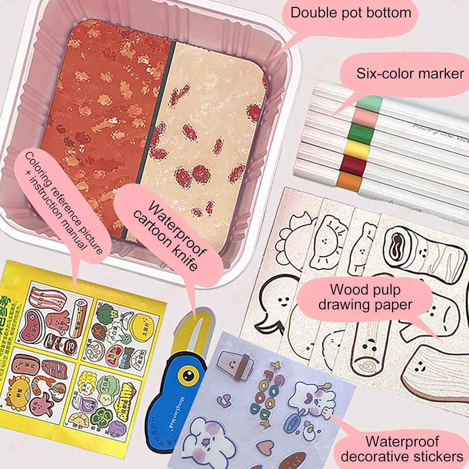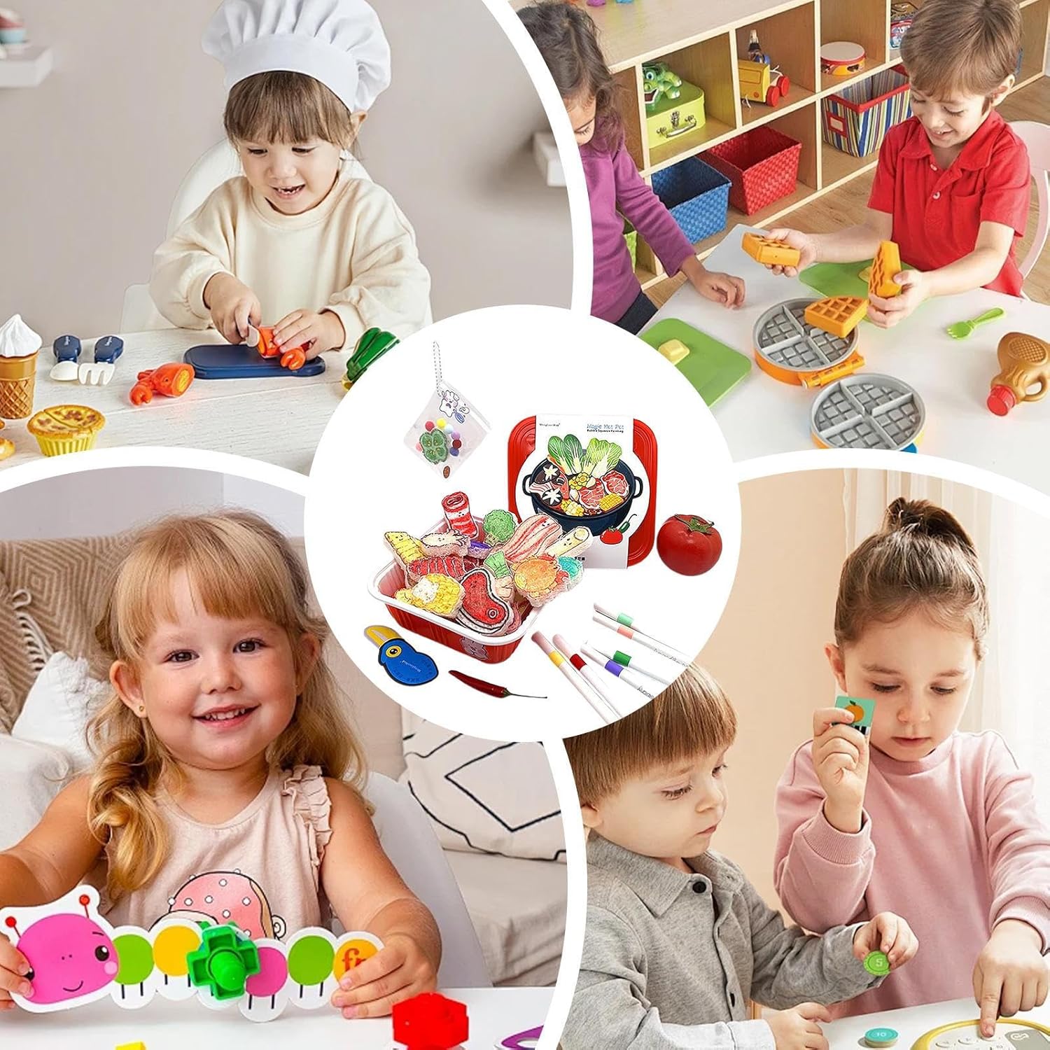 Combo creativo completo: Coinvolge i bambini con creazione di pendenti, taglio di alimenti giocattolo, colorazione e pittura a bolle 3D. Potenzia il pensiero immaginativo e offre intrattenimento educativo per ore, adatto per occasioni speciali e feste. Regalo Festivo: Ideale per compleanni feste Natale e fine anno esprime amore e cura per bambini ragazzi e ragazze aumentando la gioia e creando ricordi preziosi con giochi di cucina in miniatura Apprendimento Interattivo: Esplorare l'educazione infantile con giochi di cucina a tema hot pot, pittura e modellazione rafforzano legami affettivi, creando intrattenimento familiare coinvolgente per bambini. Gioco Creativo: Stimola lo sviluppo infantile attraverso esperienze ludiche in cucina giocattolo, focalizzandosi sul miglioramento della motricità fine e delle capacità pratiche con attività coinvolgenti di taglio e colorazione Affidabilità Gioco: I materiali carta e PVC garantiscono superfici morbide e sicure per bambini, assicurando esplorazione protetta durante attività di gioco creativo e divertente, a tutela della pelle sensibile