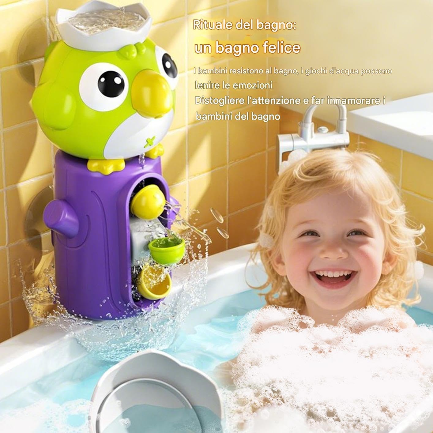 Design Accattivante e Giocoso: Forme creative a tema uccellini e colori brillanti stimolano l'entusiasmo al bagno, rendendo i giocattoli irresistibili per i bambini e garantendo un'esperienza coinvolgente Sicurezza Morbida: Morbide texture senza spigoli e materiale ABS resistente garantiscono un design antigraffio e affidabile, dedicato alla massima sicurezza durante ore di divertimento in acqua. Stabilità Migliorata: Le forti ventose assicurano i giocattoli a superfici lisce di vasche e piastrelle, garantendo una posizione fissa senza spostamenti Gioco Acqua Interattivo: Attrae i bambini con un'uscita rotante 'acqua che stimola l'immaginazione, favorisce la creatività e incoraggia l'esplorazione e affascinanti trasformazioni del movimento 'acqua durante il bagnetto. Apprendimento Giocoso: Stimola l'interazione e potenzia coordinazione occhio-mano e abilità motorie fini, rendendo il bagnetto educativo e coinvolgente per i bambini attraverso il gioco interattivo con giocattoli da bagno