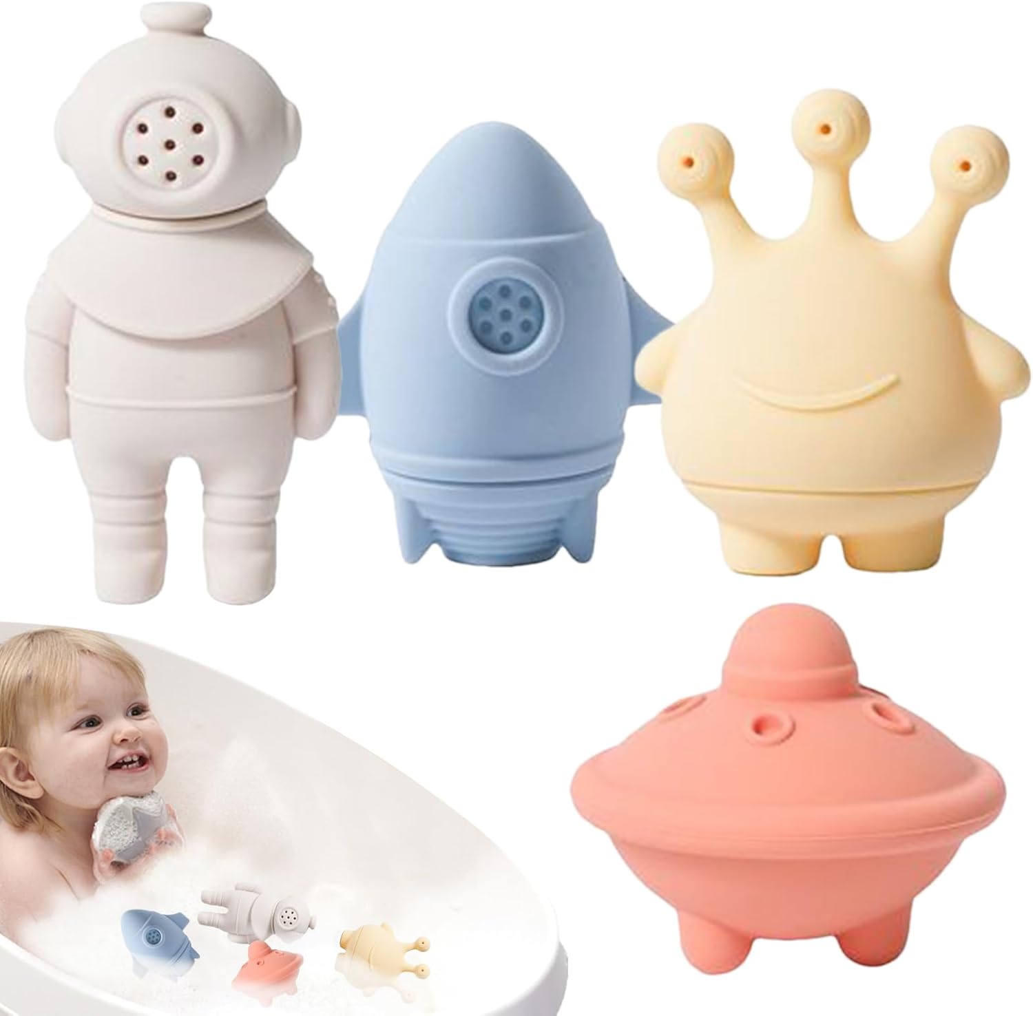 Apprendimento Precoce: Giocattoli da bagno con finiture testurizzate e colori vivaci stimolano lo sviluppo tattile e visivo, migliorando la coordinazione -manuale attraverso modelli di gioco coinvolgenti per un apprendimento sensoriale efficace Gioco Spaziale Creativo: Stimola la curiosità dei bambini con astronauti e corpi celesti, trasformando il bagno in un entusiasmante viaggio di scoperta piena di divertimento e immaginazione senza fine Design Igienico: Struttura smontabile favorisce essiccazione rapida ed evita ristagni d'acqua, semplificando la pulizia con risciacquo per mantenere igiene impeccabile dei giocattoli da bagno senza sforzo Gioco Acquatico Coinvolgente: Galleggia e spruzza acqua per rendere il bagnetto più piacevole, combinando relax idrico e interazione genitore-bambino con divertimento coinvolgente per i piccoli Sicurezza in Acqua: Progettati per la massima sicurezza, i giocattoli in silicone alimentare sono morbidi, robusti e ideali per essere masticati dal bambino durante il bagnetto.