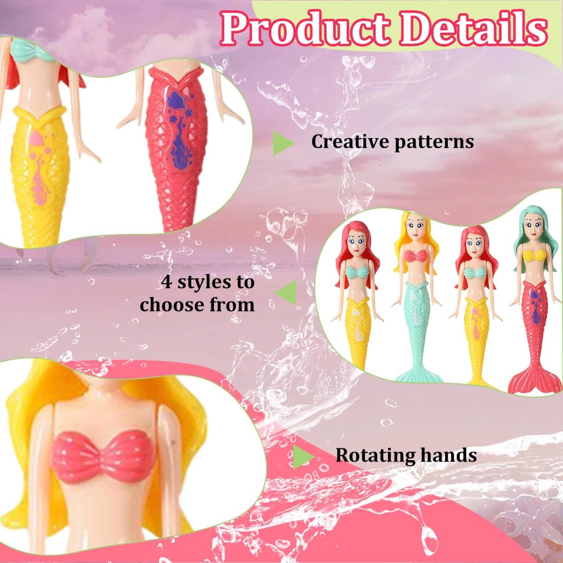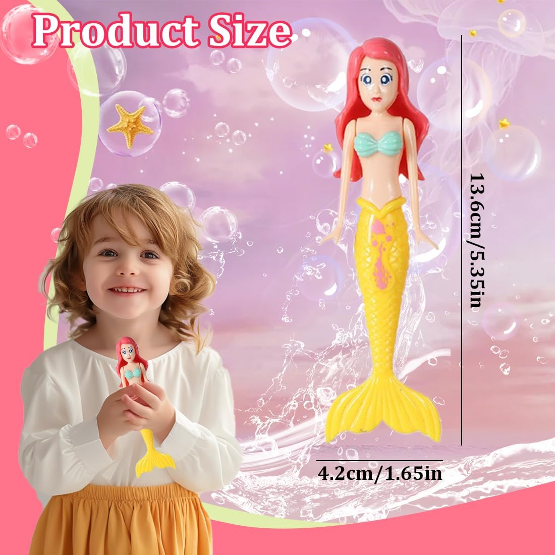 Giocattolo subacqueo a forma di sirena: l'attività di gruppo perfetta. La sirena si apre delicatamente al buio, perfetta per feste in piscina, giochi in famiglia o feste di compleanno per bambini. Promuove il legame e l'amicizia tra genitori e figli: invita i bambini a immergersi, condividere e giocare insieme. Questo gioco acquatico interattivo per 2-8 persone promuove il lavoro di squadra e le abilità sociali. Giocattolo acquatico per bambini 4 in 1: che sia nella piscina dell'asilo, in vacanza al mare o come giocattolo per la vasca da bagno, questo set incoraggia il gioco di gruppo creativo sia all'interno che all'esterno. Giocattolo subacqueo per bambini: la plastica ultra morbida con bordi arrotondati sviluppa la coordinazione occhio-mano nella presa e le capacità cognitive nell'abbinamento dei colori. Regalo perfetto: il giocattolo a forma di sirena è il regalo perfetto per i bambini, come decorazione per feste in piscina, gioco acquatico per bambini, giocattolo da piscina e regalo di compleanno.