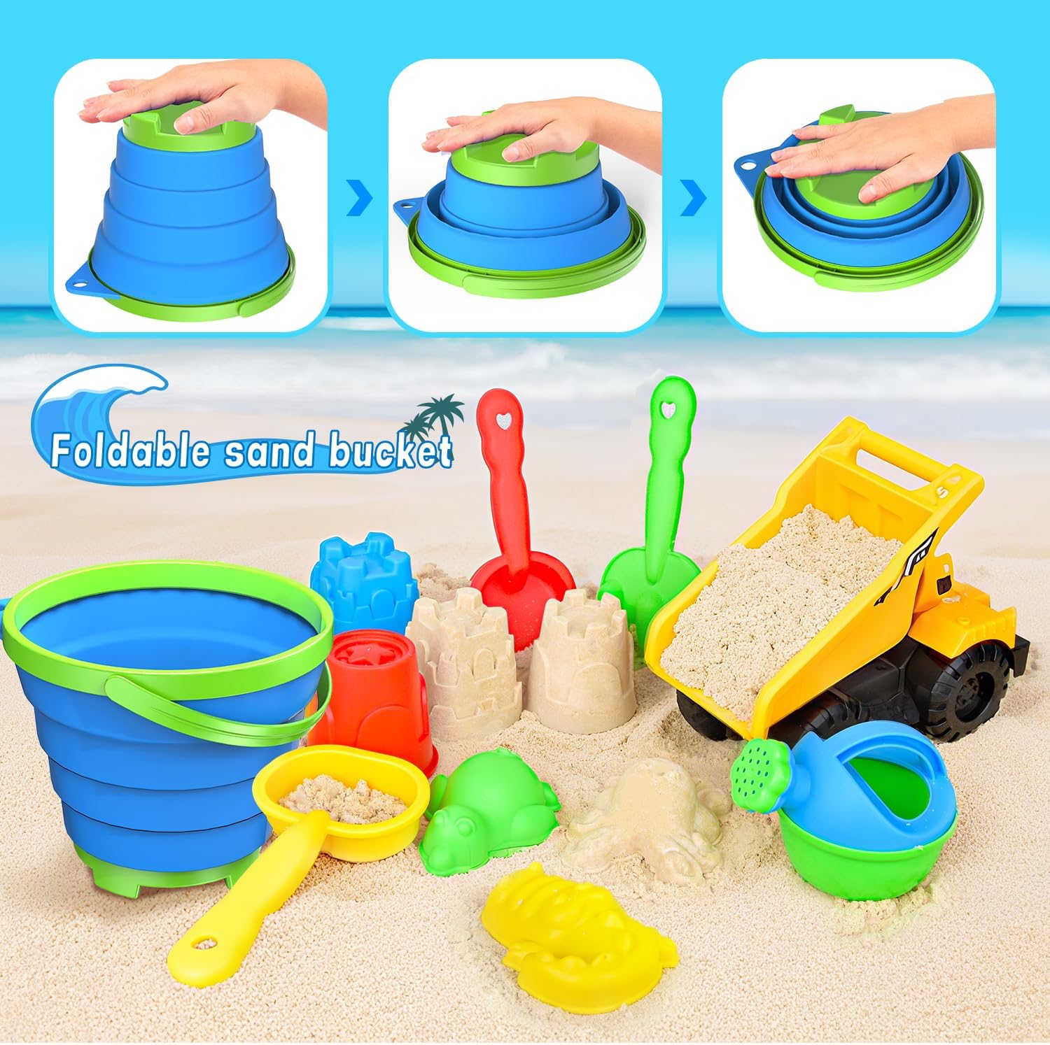 SET COMPLETO: Kit da 14 pezzi comprendente veicolo da cantiere, stampi per animali, annaffiatoio e attrezzi per la sabbia da spiaggia BORSA DA TRASPORTO: comoda borsa in rete per riporre e trasportare facilmente tutti i giocattoli da spiaggia SECCHIO PIEGHEVOLE: innovativo secchiello da spiaggia pieghevole per riporre in modo compatto e facilitare il trasporto ACCESSORI VARI: Set di pale e strumenti progettati appositamente per il gioco sulla sabbia GIOCATTOLI CREATIVI: Stampi per animali e accessori da costruzione per stimolare l'immaginazione e la creatività dei bambini