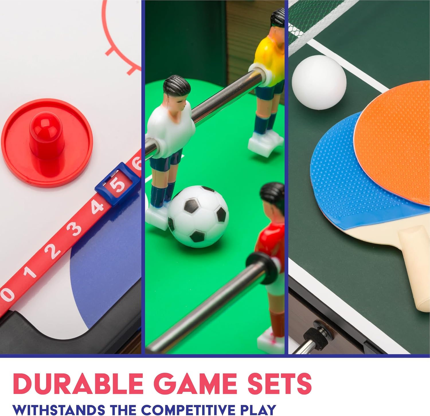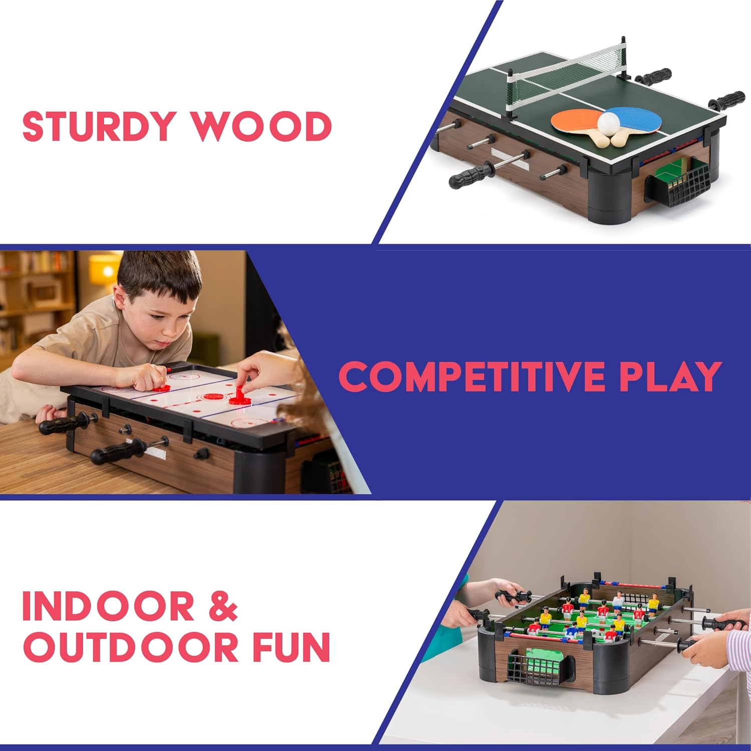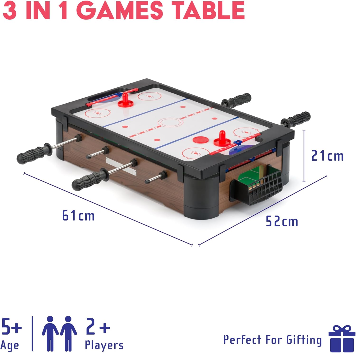 SPORT DA PISCINA 3 in 1: la versione piccola da tavolo offre 3 giochi in 1, ping pong, calcio balilla e air hockey. Questi classici giochi da tavolo offrono ore di divertimento per tutta la famiglia Facile da configurare: include istruzioni per una configurazione semplice e veloce e una struttura robusta per una lunga durata garantisce anni di divertimento Materiale durevole: il set da gioco del biliardo è realizzato in materiale durevole e resistente per garantire una lunga durata Leggero e portatile: può essere utilizzato a casa con facile conservazione o in viaggio, basta posizionarlo su un tavolo e giocare. Cambia gioco tutte le volte che vuoi, attacca semplicemente i tabelloni giocabili con le clip incluse e gioca con mini calcio, ping pong e hockey. Regalo ideale: l'emozionante scatola lo rende un regalo perfetto di compleanno o di Natale che durerà tutta la vita. Ideale per i bambini pieni di energia che amano giocare. Adatto a bambini dai 5 anni in su, dimensioni del prodotto (L x P x A): 61 x 52 x 21 cm