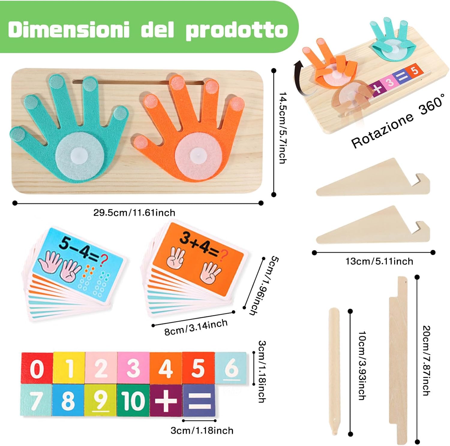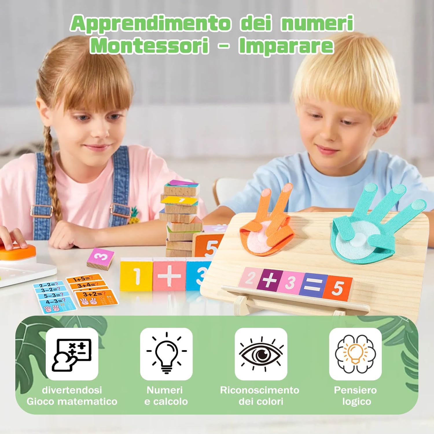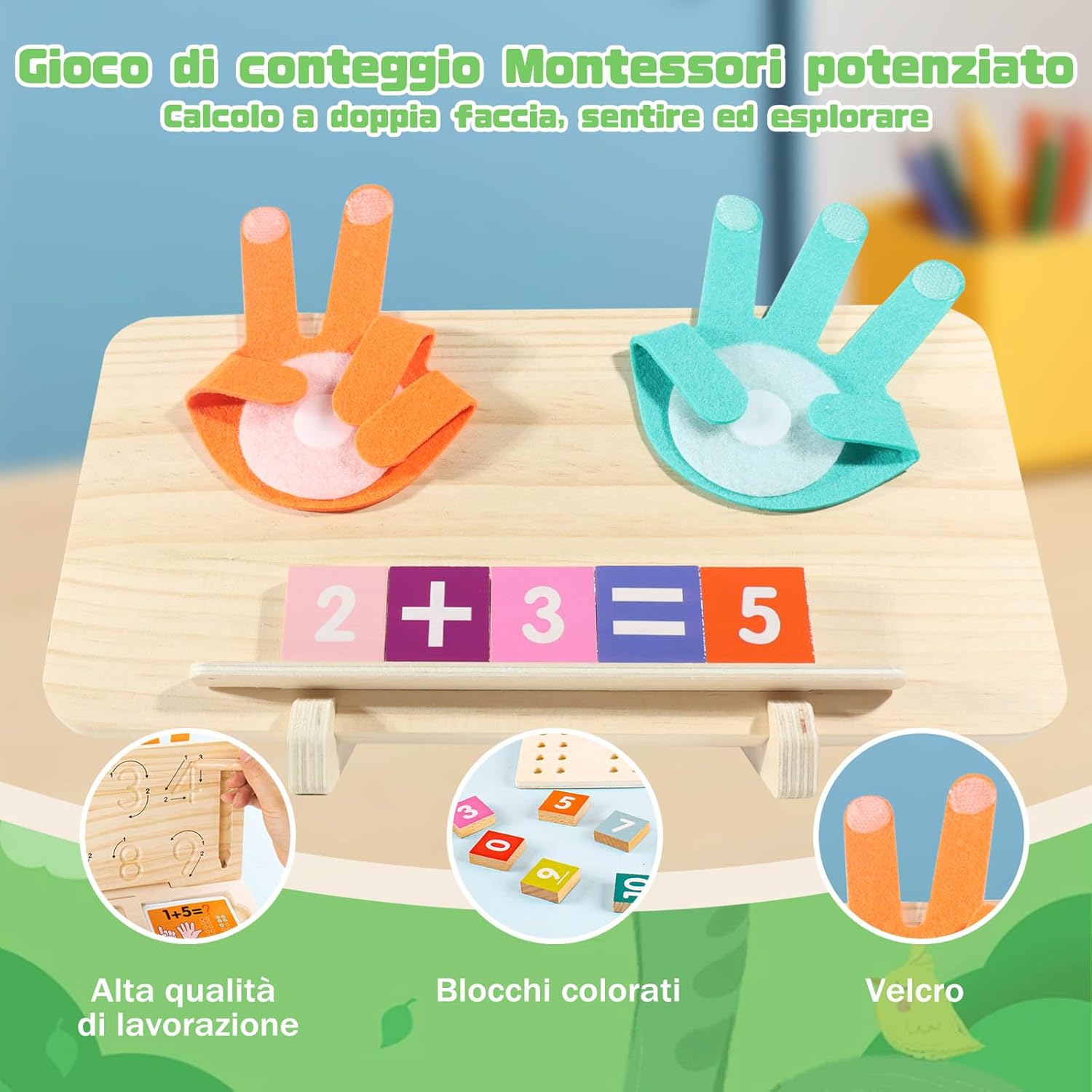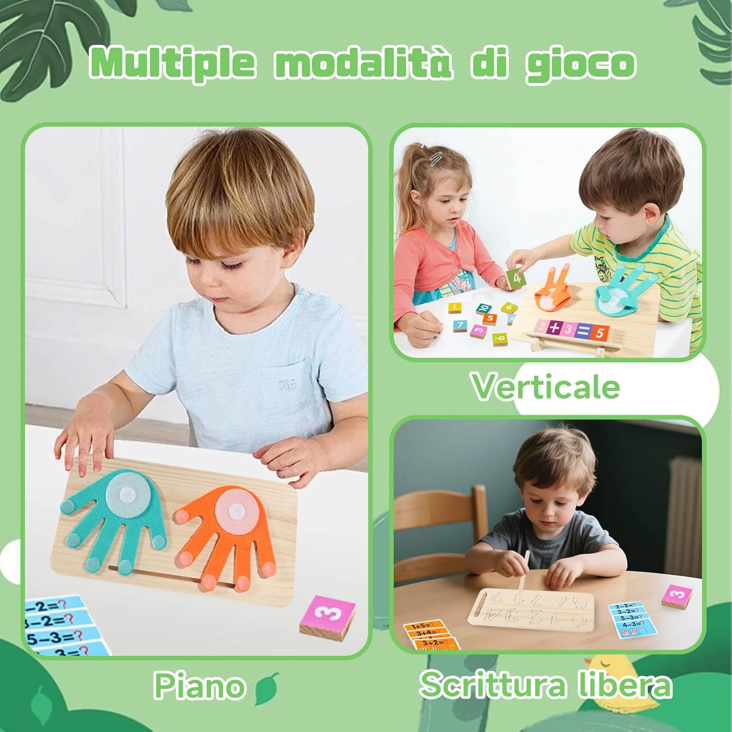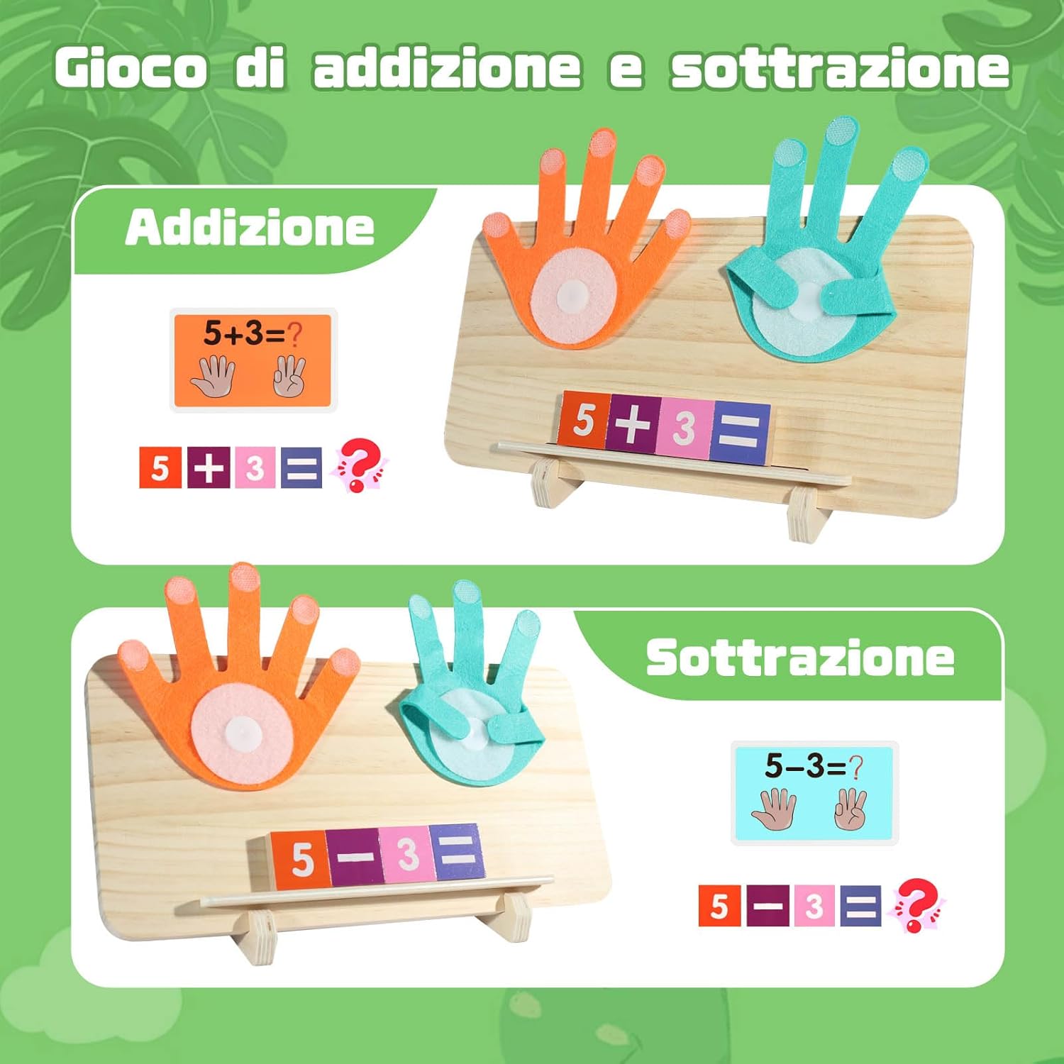 【Giochi Matematici Educativi Intrattenenti per Bambini】Questi giochi legno rendono l'apprendimento dei numeri, dell'addizione e della sottrazione un'esperienza interattiva e divertente. Sono giochi legno bambini ideali per i ragazzi di 3-8 anni, aiutando i bambini a sviluppare abilità matematiche di base attraverso i giochi. 【Giochi con Numeri Aggiornati】I giochi matematici bambini sono aggiornati a lastre di legno a doppio lato: un lato per il conteggio, l'altro per esercitarsi nella scrittura dei numeri. Includono anche 13 mattoncini colorati a doppio lato, 10 carte flash a doppio lato e 2 supporti da usare in due modi, perfetti come giochi educativi per bambini a partire da 3 anni. 【Design Multisensoriale】Questi giochi multifunzionali per il conteggio con le dita, grazie a tastiere numeriche in legno colorate, carte flash colorate e puzzle mobili delle mani, promuovono la conoscenza dei numeri, aiutando i bambini a rafforzare memoria, creatività e apprendimento contestuale in un ambiente divertente. 【Materiali Sicuri di Alta Qualità】Questi giochi matematici per bambini sono realizzati in legno robusto e ecologico, con bordi lisci, e vernici acriliche ecologiche adatte ai bambini. Ideali per attività attive, sono sicuri per le mani dei piccoli. 【Regalo Perfetto per i Bambini】Questi giochi educativi interattivi sono adatti a bambini di oltre 3 anni. Sono regali ideali per compleanno o Natale, perfetti come giochi educativi per bambini di 3 anni e oltre!