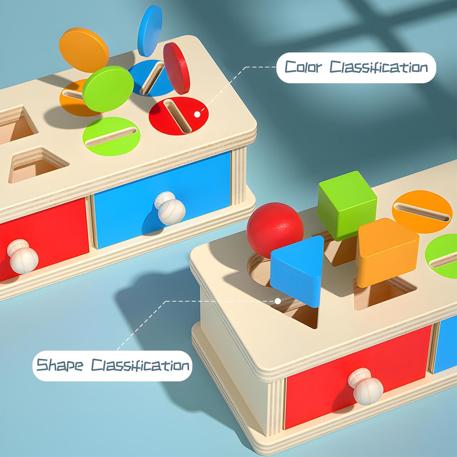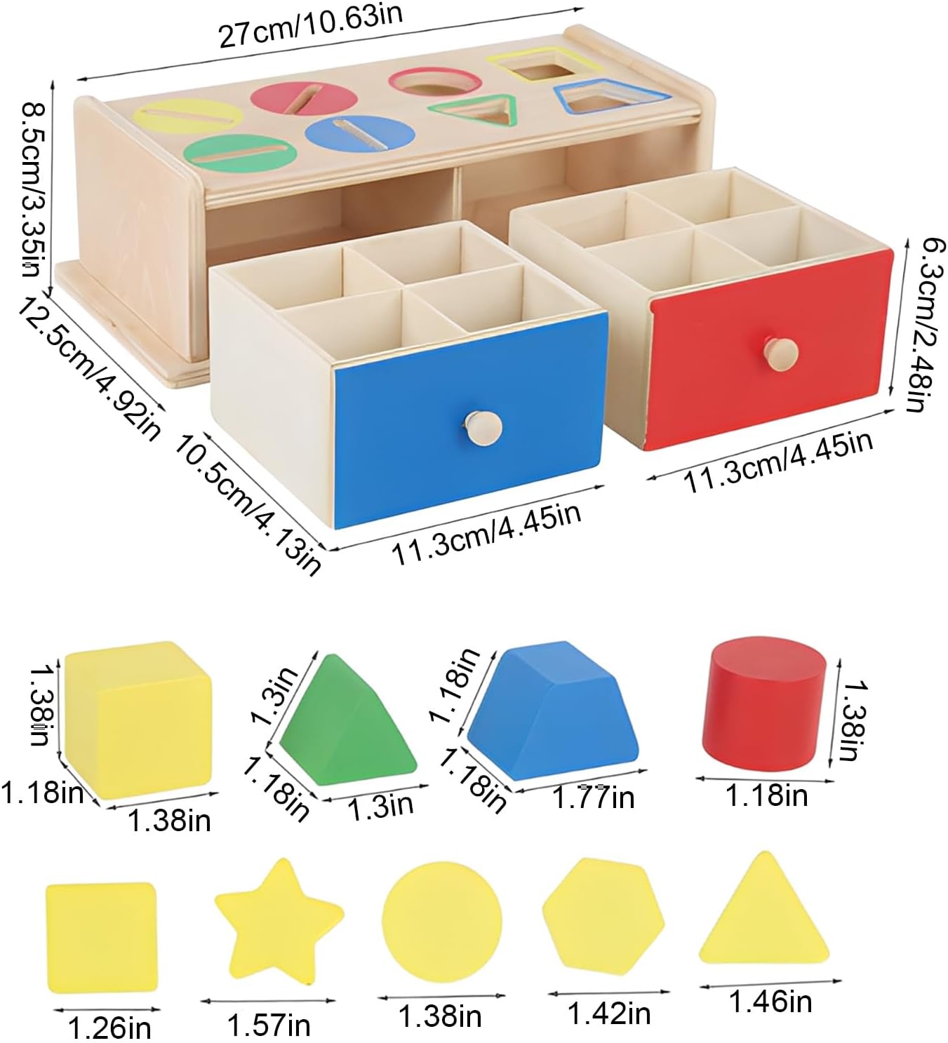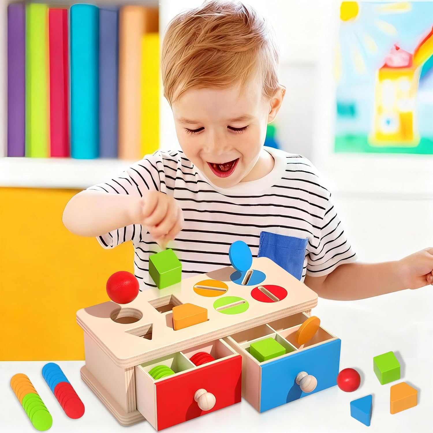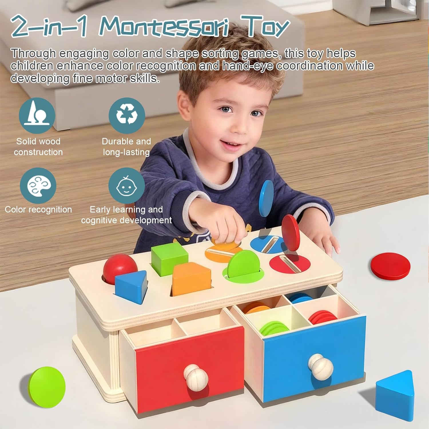 【Giocattolo Montessori 2 in 1 a partire da 1 anno】 Questo giocattolo Montessori funziona attraverso divertenti giochi di smistamento dei colori e delle forme, che stimolano il riconoscimento dei colori e la coordinazione occhio-mano dei bambini. Facilita la fase di “inserimento” grazie a una pratica maniglia a cassetto. Il giocattolo aiuta a sviluppare la capacità di risolvere i problemi, sviluppa le capacità motorie fini, le abilità pratiche, insegna a ordinare, classificare e impilare, rafforza il rapporto tra genitori e bambini. 【Materiale di alta qualità e sicuro】 Questo resistente giocattolo in legno per bambini è realizzato in materiale di alta qualità con un bell'aspetto e bordi lisci per una maggiore durata. Realizzato con vernice a base d'acqua atossica per garantire un'esperienza sicura e piacevole per i bambini, perfetto come regalo per bambini di 1-2 anni. 【Giocattolo Montessori con lancio di monete】 I bambini di età compresa tra 1 e 3 anni si divertono molto a spingere e tirare i cassetti e sono affascinati dall'inserire oggetti nelle fessure o nei fori, senza mai stancarsi. L'uso ripetuto della scatola dei giocattoli aiuta a sviluppare ed espandere la creatività, la presa delle mani e l'apprendimento dei colori. Ciò lo rende un giocattolo ideale per lo sviluppo del cervello. 【Giocattoli portatili per bambini piccoli】 Tutti i pezzi possono essere riposti nel contenitore a cassetto, facile da trasportare come giocattolo da viaggio. Tenete i bambini felici e tranquilli durante il viaggio con questo giocattolo motorio per bambini di 2 anni. I giocattoli sono realizzati in dimensioni Montessori internazionali, il che li rende perfetti per le mani piccole, ma comunque spessi. 【Adatto come regalo ben pensato】 Il valore educativo del set di giocattoli Montessori, combinato con il suo design visivamente stimolante, lo rende un regalo meraviglioso che incoraggia i bambini piccoli ad imparare, esplorare e svilupparsi. È un regalo di nascita ben pensato per la mamma ed è anche molto adatto come regalo per la festa dei bambini, regalo di compleanno, regalo di Natale, regalo di Pasqua e regalo da mettere nella calza per il vostro bambino.
