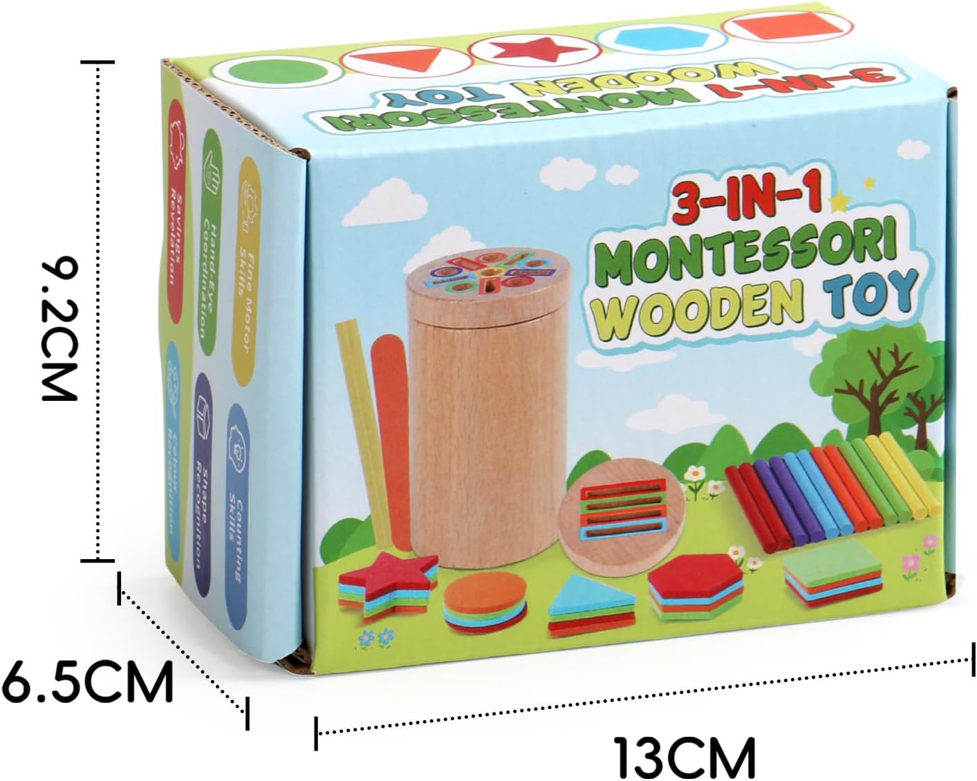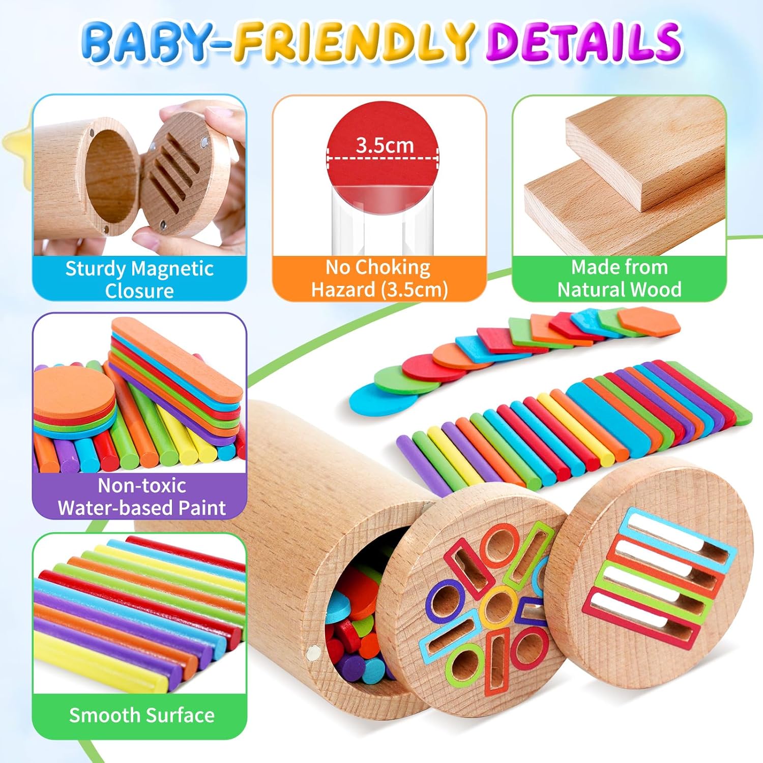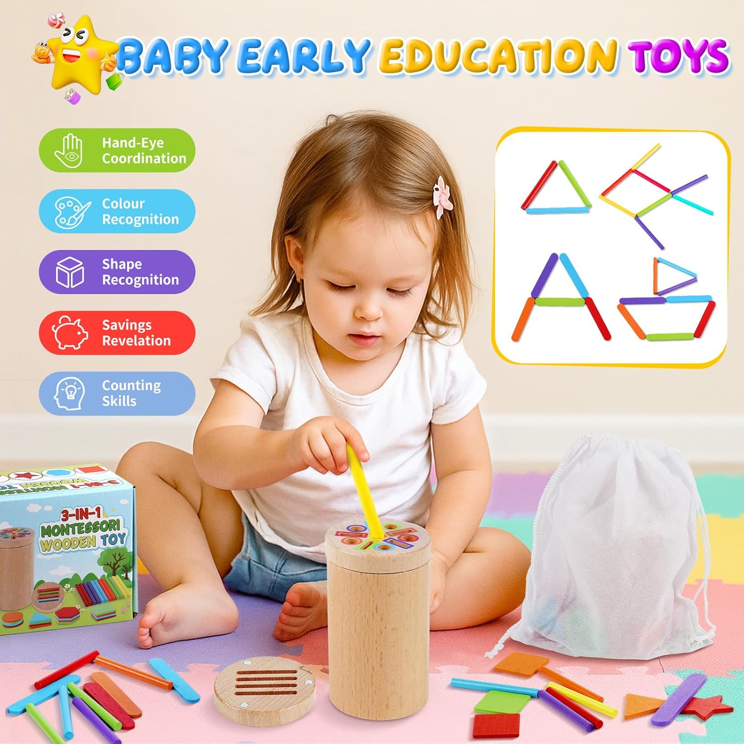 【 Giochi Bambini 1 2 Anni 3 in 1 】 Questo giochi montessori 1 anno affascina i bambini con i suoi colori vivaci e le molteplici attività. Inserire i bastoncini colorati nei fori aiuta a sviluppare le capacità motorie fini e il riconoscimento dei colori. Cercando di far passare i bastoncini attraverso i fori, il bambino allena la flessibilità del polso e la coordinazione occhio-mano. 【 Giochi Montessori 1 2 Anni Educativo 】 I bambini possono inserire blocchi di diverse forme nei fori corrispondenti; imparare i nomi di 5 forme semplici (cerchio, quadrato, triangolo, esagono e stella); e fare esercizi di impilamento. Gioco bambino 2 anni con tanti bastoncini, possono dare sfogo alla loro immaginazione creando diverse figure semplici, ideale per la prima educazione. 【 Gioco Bambino 1 2 Anni Sicuro e Durevole 】 Giochi montessori 2 anni realizzato in legno massello di alta qualità, è robusto e resistente. Levigato finemente, ha superfici e bordi lisci. Verniciato con colori ad acqua atossici, è inodore e sicuro. Il secchiello e il coperchio hanno una chiusura magnetica, sicura e stabile. Tutte le parti soddisfano gli standard internazionali di sicurezza per giocattoli. 【 Portatile, per Giocare Ovunque 】 Giochi bambini 1 2 anni completo di una pratica borsa in tessuto con cordini per il trasporto e il riporo. Giochi montessori 2 anni si porta facilmente nello zaino, così il bambino può giocare ovunque: a casa, con gli amici, a scuola, al parco, al ristorante o in viaggio, restando impegnato e felice. 【 Regalo Bambino Bambina 1 2 Anni Significativo 】 Il giochi montessori 1 anno include un secchiello di legno con 2 coperchi, 12 bastoncini colorati, 10 bastoncini gelato e 20 blocchi di forme diverse. Ricco di attività e colori, è il regalo perfetto per bambini di 1-2 anni. Ideale per genitori ed educatori che vogliono stimolare l'apprendimento attraverso il gioco, è un'ottima idea regalo per compleanni, feste dei bambini, Pasqua o Natale.