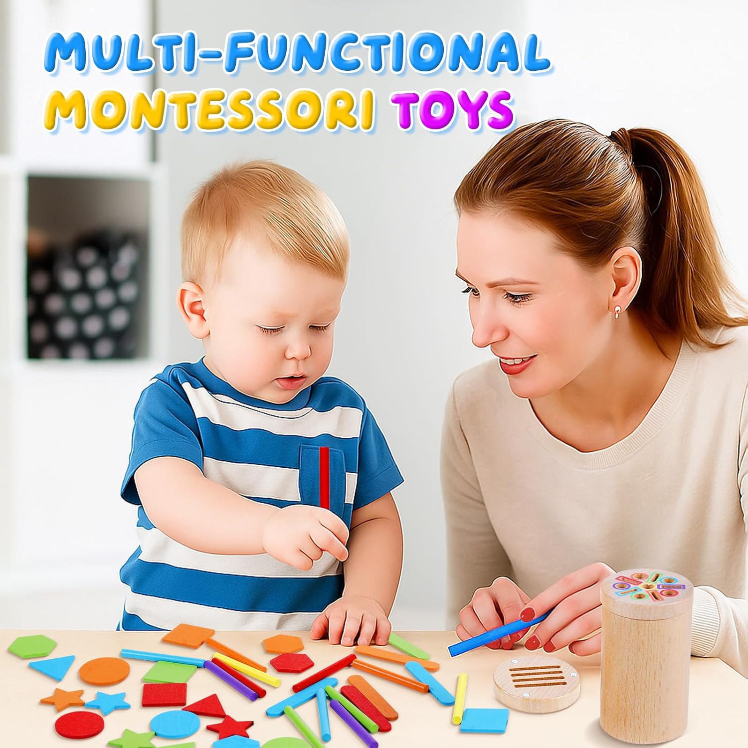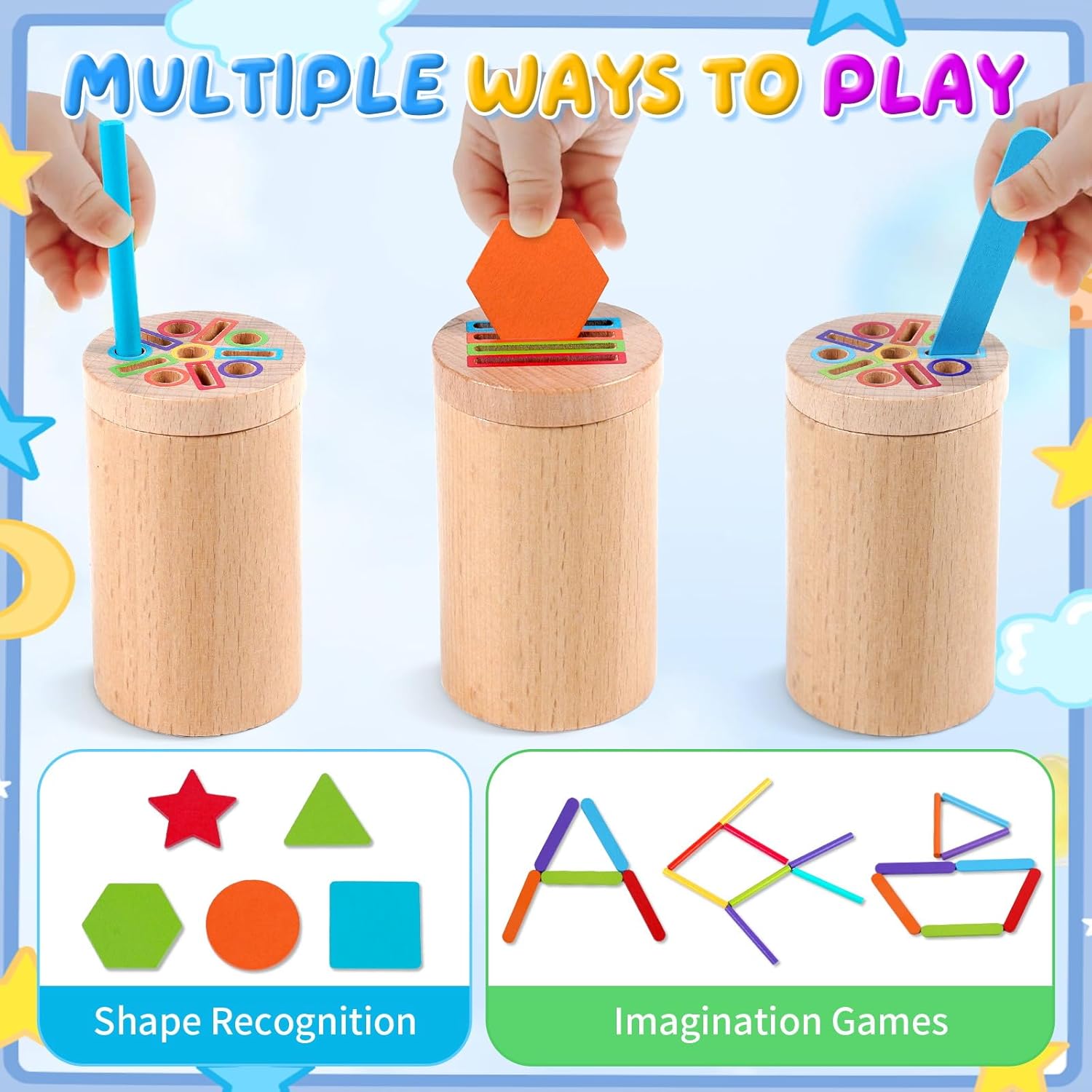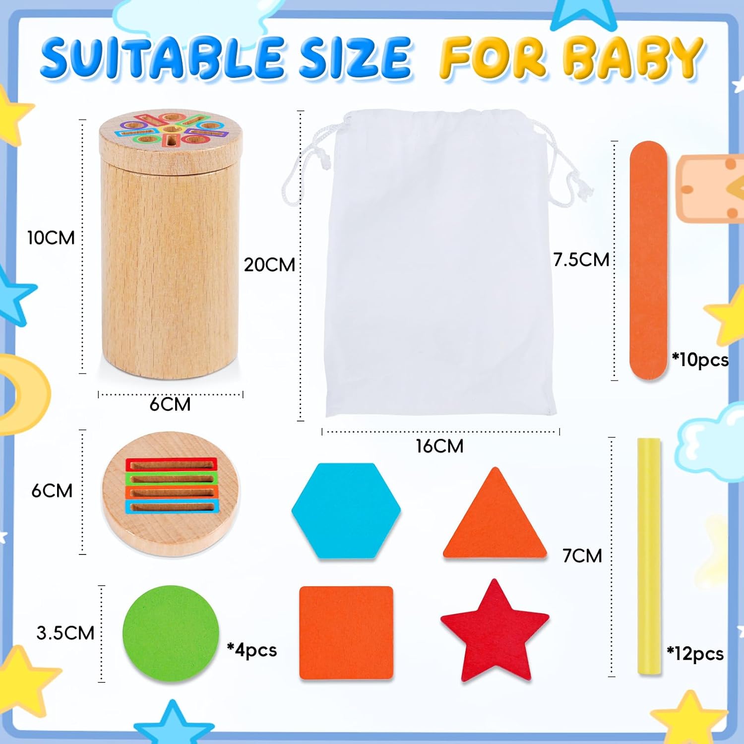【 Giochi Bambini 1 2 Anni 3 in 1 】 Questo giochi montessori 1 anno affascina i bambini con i suoi colori vivaci e le molteplici attività. Inserire i bastoncini colorati nei fori aiuta a sviluppare le capacità motorie fini e il riconoscimento dei colori. Cercando di far passare i bastoncini attraverso i fori, il bambino allena la flessibilità del polso e la coordinazione occhio-mano. 【 Giochi Montessori 1 2 Anni Educativo 】 I bambini possono inserire blocchi di diverse forme nei fori corrispondenti; imparare i nomi di 5 forme semplici (cerchio, quadrato, triangolo, esagono e stella); e fare esercizi di impilamento. Gioco bambino 2 anni con tanti bastoncini, possono dare sfogo alla loro immaginazione creando diverse figure semplici, ideale per la prima educazione. 【 Gioco Bambino 1 2 Anni Sicuro e Durevole 】 Giochi montessori 2 anni realizzato in legno massello di alta qualità, è robusto e resistente. Levigato finemente, ha superfici e bordi lisci. Verniciato con colori ad acqua atossici, è inodore e sicuro. Il secchiello e il coperchio hanno una chiusura magnetica, sicura e stabile. Tutte le parti soddisfano gli standard internazionali di sicurezza per giocattoli. 【 Portatile, per Giocare Ovunque 】 Giochi bambini 1 2 anni completo di una pratica borsa in tessuto con cordini per il trasporto e il riporo. Giochi montessori 2 anni si porta facilmente nello zaino, così il bambino può giocare ovunque: a casa, con gli amici, a scuola, al parco, al ristorante o in viaggio, restando impegnato e felice. 【 Regalo Bambino Bambina 1 2 Anni Significativo 】 Il giochi montessori 1 anno include un secchiello di legno con 2 coperchi, 12 bastoncini colorati, 10 bastoncini gelato e 20 blocchi di forme diverse. Ricco di attività e colori, è il regalo perfetto per bambini di 1-2 anni. Ideale per genitori ed educatori che vogliono stimolare l'apprendimento attraverso il gioco, è un'ottima idea regalo per compleanni, feste dei bambini, Pasqua o Natale.