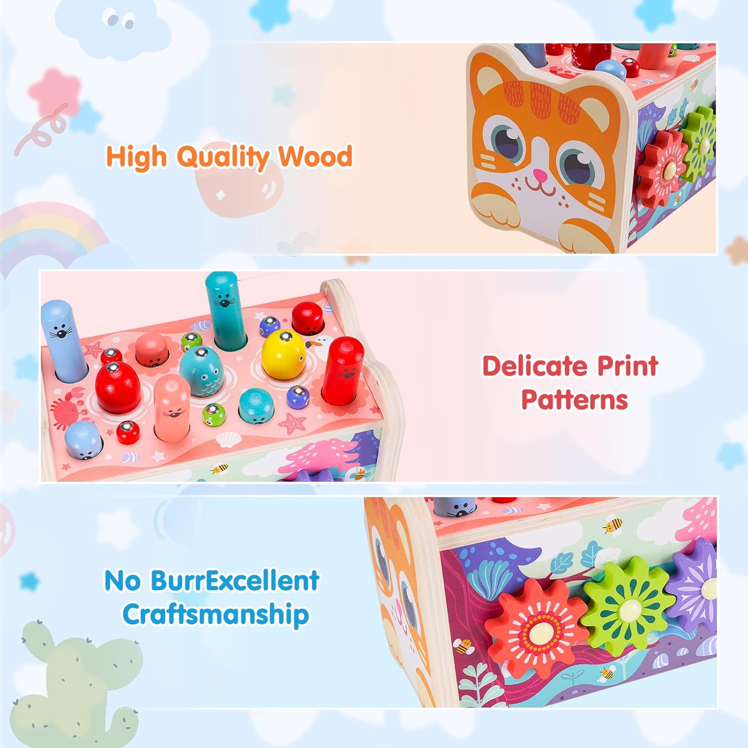 🎀【Giocattolo in legno 5 in 1 per bambini da 1 anno in su】Questo giocattolo Montessori per bambini da 1 anno in su permette ai tuoi bambini di giocare a 5 giochi in uno: Schiaccia la talpa, Pesca, Cattura insetti, Xilofono, Ingranaggi rotanti e include 2 martelli, così due o più bambini possono giocare insieme. 🎀【Educazione precoce e allenamento delle capacità motorie】Questo gioco di tapping presenta un'adorabile e accattivante tigre su entrambi i lati. I bambini saranno affascinati da questa simpatica tigre mentre imparano le capacità motorie fini e il senso del ritmo. Colpendo, afferrando e abbinando, i bambini allenano giocosamente la loro reattività e imparano a riconoscere colori, numeri e suoni. Un giocattolo educativo ideale per piccoli esploratori curiosi. 🎀【Materiale】Giocattolo per le capacità motorie realizzato in legno per la sicurezza- sicuro, inodore e resistente. Tutti i bordi sono accuratamente levigati e arrotondati in modo che il tuo bambino possa giocare in sicurezza. 🎀【Gioco interattivo genitore-figlio】Questo giocattolo Montessori non solo incoraggia il gioco indipendente, ma rafforza anche il legame tra genitori e figli. Mentre suonano musica o pescano insieme, i bambini possono sviluppare fiducia e capacità comunicative: un momento prezioso per tutta la famiglia. 🎀【Il regalo perfetto per ogni occasione】Un regalo perfetto per bambini e bambine da 1 anno in su, che sia per un compleanno, Natale, Pasqua o semplicemente come una sorpresa d'amore. Il design colorato e le diverse possibilità di gioco rendono questo giocattolo in legno un punto di forza tra i giocattoli educativi per i più piccoli.