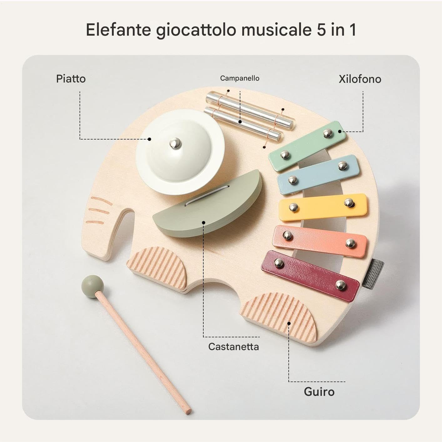 Stimola il Gioco Creativo: Promuovono apprendimento interattivo ed espressione creativa attraverso attività prescolastiche piacevoli, ideali per interazioni genitore-bambino Esplorazione Sonora: Stimola il coinvolgimento uditivo e la crescita sensoriale con e carillon, integrando più strumenti per effetti sonori ricchi in giochi musicali educativi per l'infanzia. Garanzia di Sicurezza: Struttura in legno e metallo integrata con materiali sicuri, offre bordi arrotondati e finiture lisce che assicurano longevità del giocattolo musicale in totale sicurezza. Elefante Affascinante:incantevole attira i bambini con look accattivante, incoraggia curiosità e favorisce primi approcci alla musica attraverso il gioco interattivo Ritmo e Coordinazione: Incentiva il motorio con giochi interattivi, sostiene lo sviluppo ritmico e rafforza la coordinazione occhio-mano, creando solide musicali