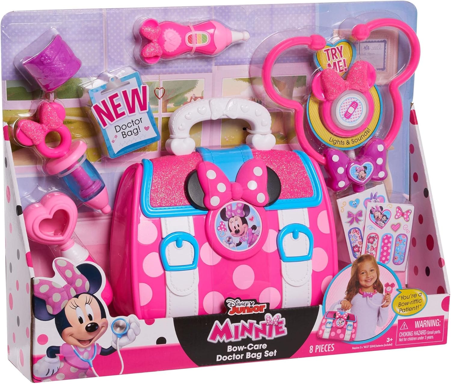 Set del dottore con valigetta personalizzata di Minni, 5 accessori a tema medico e 2 foglietti di adesivi Gli accessori inclusi sono: stetoscopio con luce ed effetti sonori, otoscopio, siringa, termometro e cerotto Puoi usare gli adesivi per personalizzare la valigetta o quello che vuoi tu La valigetta si apre per riporre tutti gli accessori all'interno La valigetta di Minni è adatta a bambini a partire dai 3 anni
