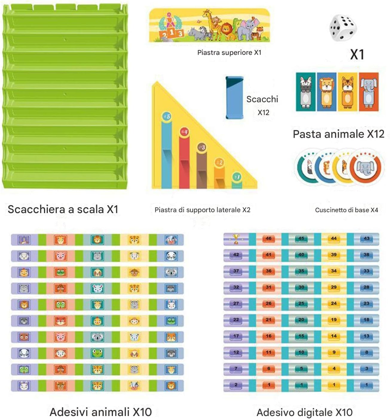 Equilibrio -Strategia: Aggiunge suspense e divertimento con un mix di e tattica: premiando con un turno extra sul 6 e mantenendo i giocatori attenti al rischio di reset dopo tre 6 per un'esperienza immersiva. Attività Dinamica: Scelta eccellente per raduni familiari e festività, offre un gameplay emozionante e competitivo. Unisce divertimento e sviluppo numerico precoce, permettendo ai giocatori di gareggiare per essere il primo a completare il percorso in modo coinvolgente e interattivo. Strategia Numerica: Interazioni con dadi rafforzano il pensiero logico, migliorano la consapevolezza spaziale e le abilità di riconoscimento numerico, coltivando competenze di pianificazione strategica Gioco : Promuove competizione sana insegnando regole e correttezza, ideale per gioco genitori-figli. Migliora l'interazione familiare con esperienze educative coinvolgenti per creare momenti di qualità unici. Stimolo Visivo: Favorisce la partecipazione attiva con elementi grafici accattivanti che rafforzano le abilità di riconoscimento dei colori, garantendo allo stesso semplicità di identificazione e godibilità di ogni componente del gioco