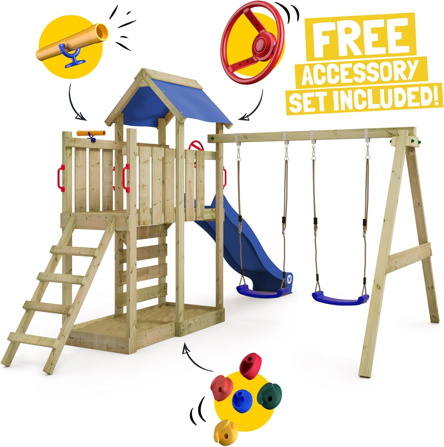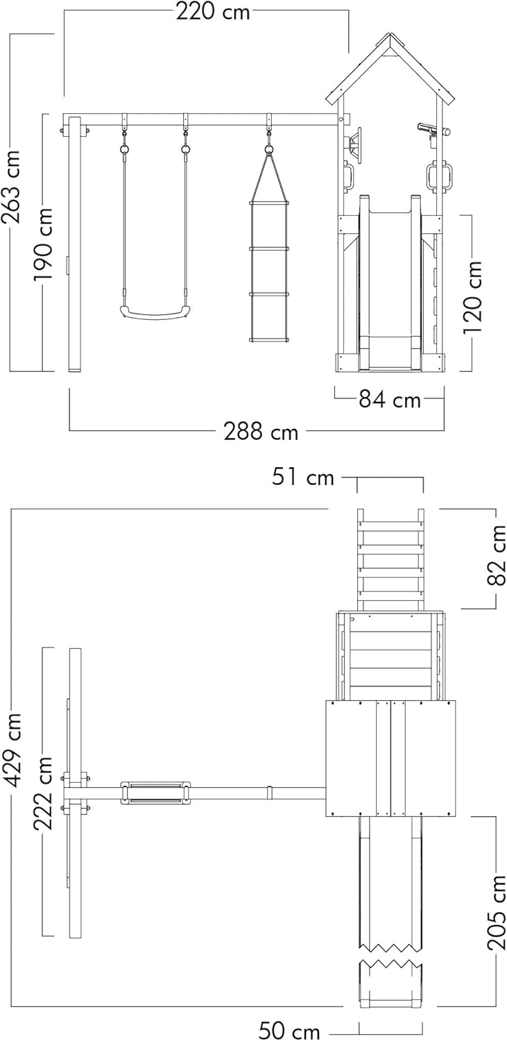 PARCO GIOCHI PER IL GIARDINO: il MultiFlyer con pedana alta 120 cm si distingue per la sua grande sabbiera, l'altalena per bambini, lo scivolo con attacco per l'acqua e per il tetto con telone resistente all'acqua. Gli accessori per il gioco da giardino vengono consegnati inclusi nella confezione. AVVENTURE SENZA FINE: con i nostri giochi da giardino, desideriamo rendere possibile per i bambini un'infanzia indimenticabile e piena di avventure emozionanti. Così i grandi possono rilassarsi mentre i piccoli giocano gioiosi nel giardino di casa. SICUREZZA PER I BAMBINI: prestiamo particolare attenzione a dare ai nostri articoli stabilità e sicurezza, affinché i bambini possano giocare in tutta tranquillità. Le grandi travi delle altalene da 9 x 9 cm e i pali montanti da 9 x 4,5 cm rendono i nostri parchi giochi da giardino veramente stabili. LEGNO EUROPEO: il legno di pino e abete rosso di provenienza europea dona ai nostri giochi da giardino un carattere unico. Il legno non solo è sicuro a livello biologico, ma è anche più resistente e non deve nemmeno essere verniciato grazie all'impregnazione. 10 ANNI DI GARANZIA: sui nostri giochi da giardino in legno di alta qualità offriamo una garanzia di 10 anni. Consigliamo ai nostri clienti di acquistare anche i nostri sistemi di ancoraggio, non solo per beneficiare della suddetta garanzia, ma anche per garantire un fissaggio sicuro della struttura al terreno.