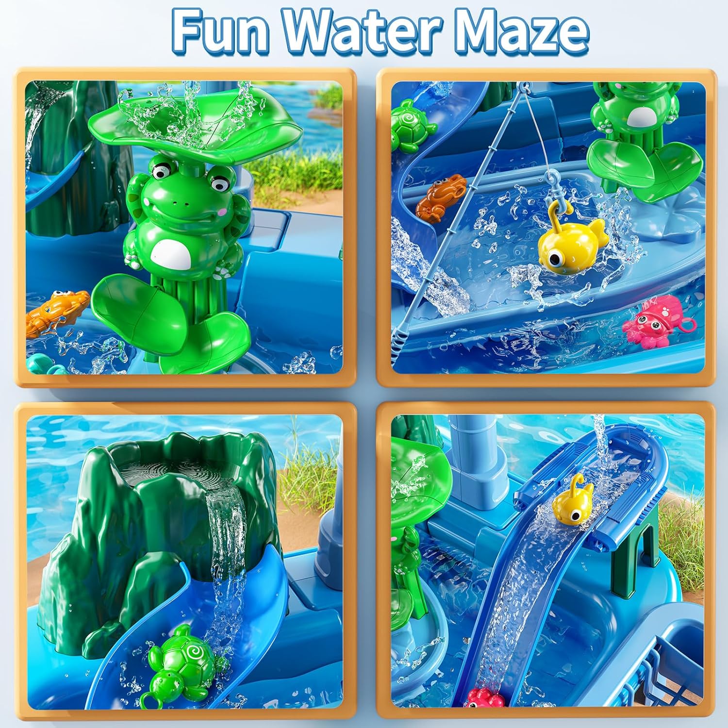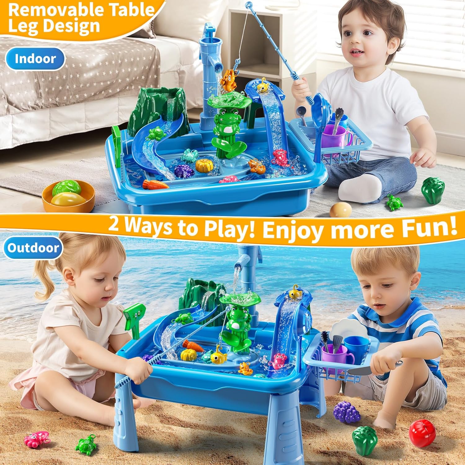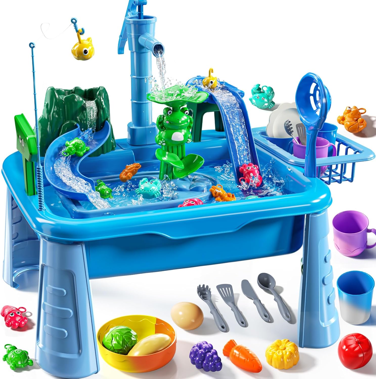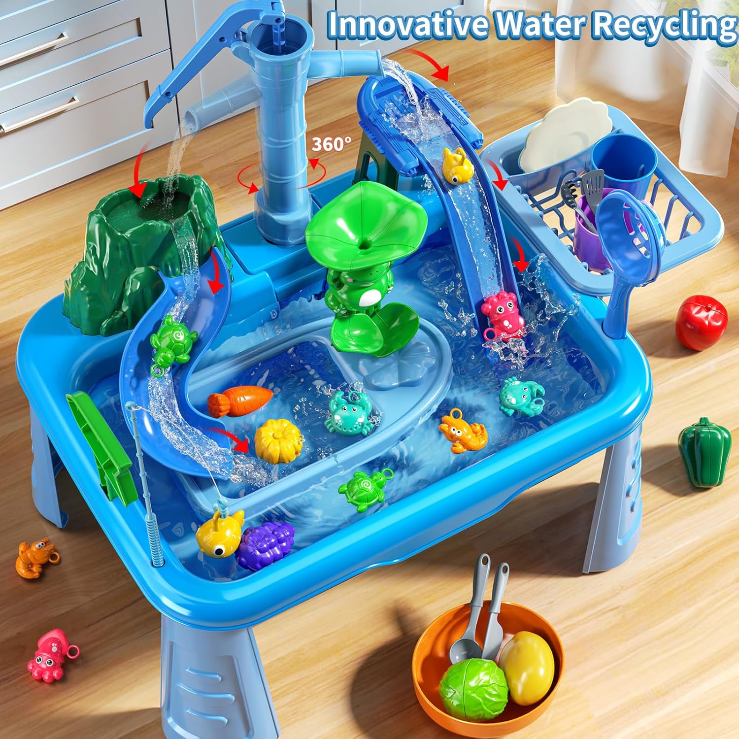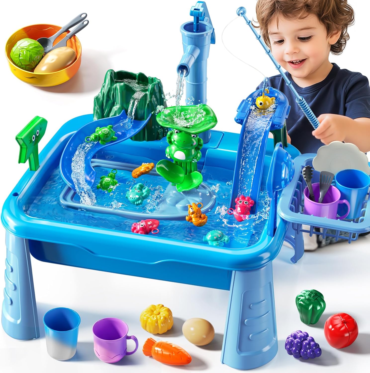 Giochi da tavolo ad acqua: il lavandino per giochi d'acqua corrente per bambini (19,7 x 4,75 x 6,2 pollici) include un set da pesca per bambini piccoli, 10 giocattoli con animali marini, accessori per l'acqua, giocattoli, piatti giocattolo e cibo. I bambini imparano a lavare, pescare e sviluppare abilità di vita Circolazione automatica dell'acqua: riempire i giocattoli estivi con acqua, azionare il set di rubinetti rotanti per la circolazione dell'acqua a 360° e l'acqua scorre lungo gli scivoli. Utilizzare le reti da pesca per catturare i giocattoli dei pesci per aiutare i bambini a sviluppare le loro abilità pratiche. Gioco: Il tavolo da gioco per bambini è facile da giocare come un gioco estivo all'aperto. Se posizionato in acqua a 90°F, il set di piastre giocattolo cambierà colore, consentendo ai genitori di regolare facilmente la temperatura dell'acqua appropriata. Simulazione dei giocattoli da pesca: le gambe del tavolo delle attività estive per bambini possono essere rimosse per feste, compleanni e festività: Ringraziamento, Natale e Capodanno per bambini dai 3-5-4-8 anni Goditi l'interazione genitore-figlio del gioco d'acqua