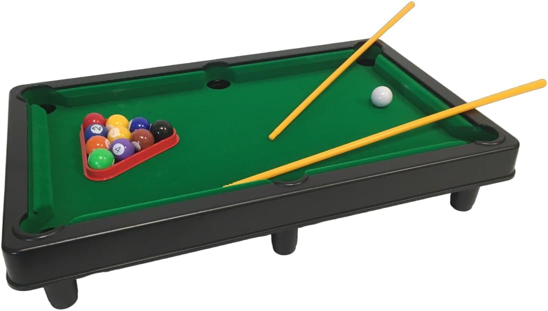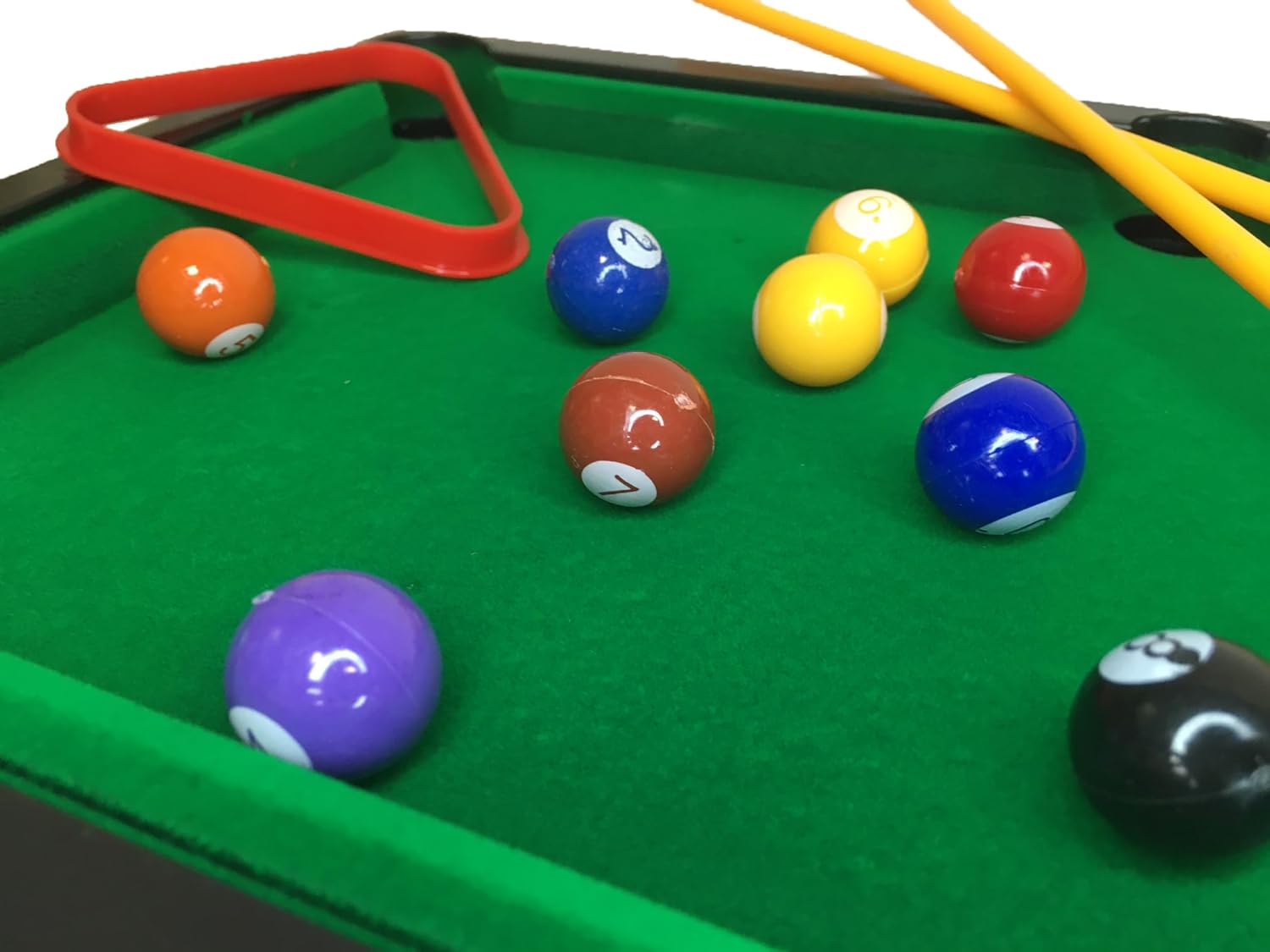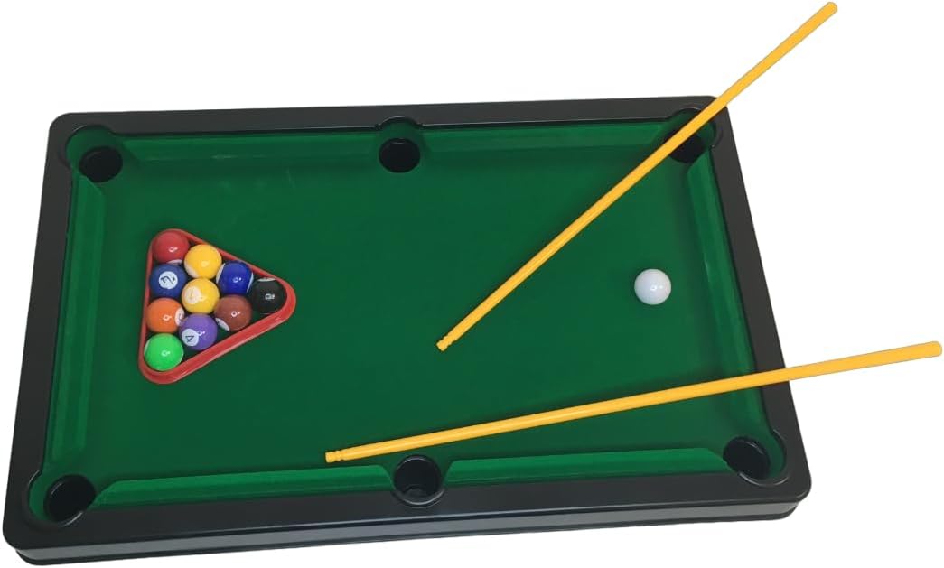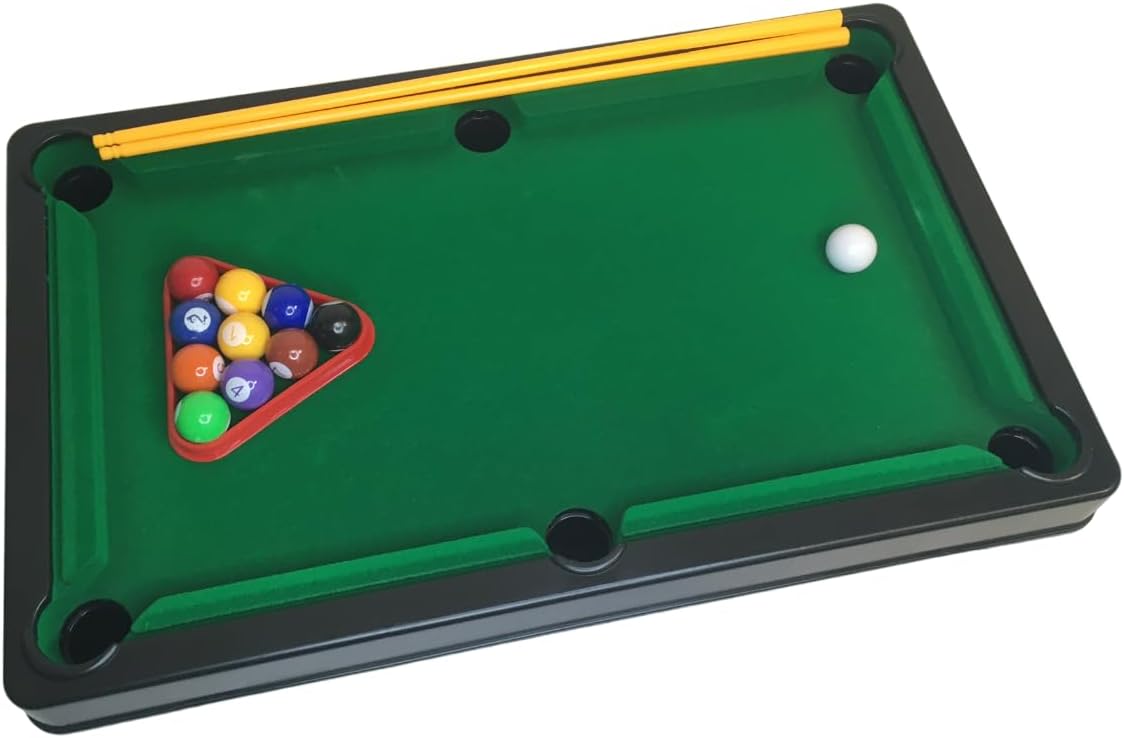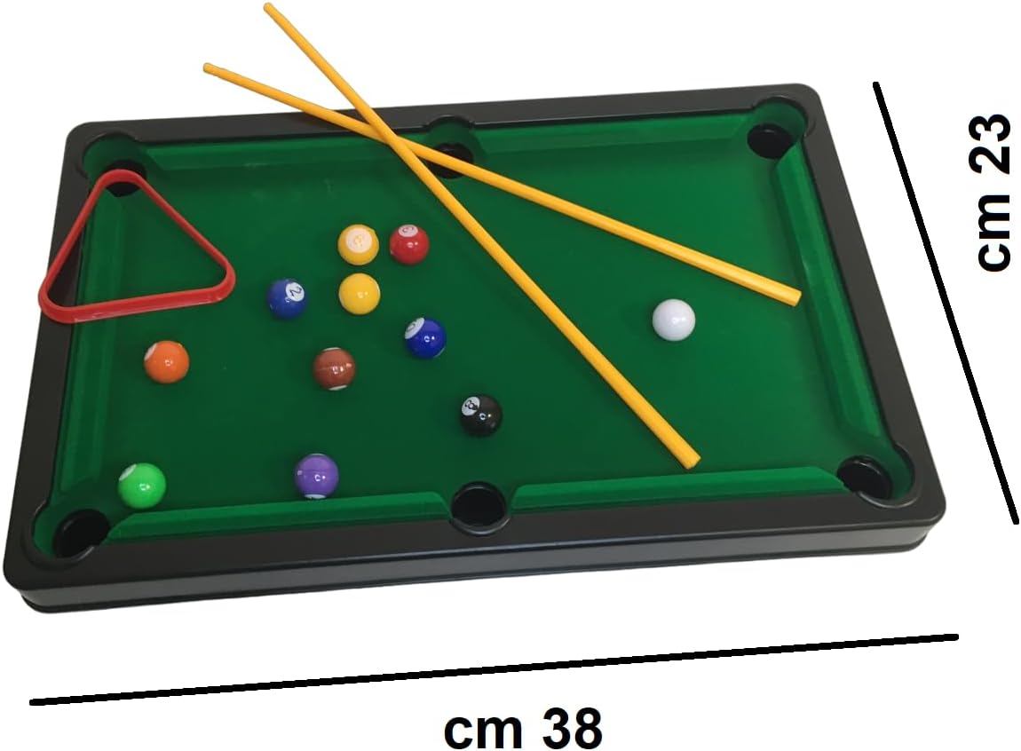 [Tavolo da Biliardo in Miniatura]: Questo set portatile di tavoli da biliardo in miniatura è la dimensione ideale per risparmiare spazio ed è perfetto per i luoghi in cui non c'è spazio per un tavolo da biliardo di dimensioni reali. Permette di giocare in spazi limitati, riduce lo stress e favorisce il legame tra genitori e figli. [Materiali di Alta Qualità]: Questo mini tavolo da biliardo è realizzato in plastica ispessita e l'intero tavolo è solido e resistente. Il tessuto morbido sulla superficie e gli ammortizzatori sui lati offrono una sensazione realistica che imita i tavoli da biliardo standard. Il design con angoli arrotondati non ferisce le mani e offre ai bambini una maggiore attenzione. [Divertimento per Tutte le Età]: Questo biliardo da tavolo è divertente per tutte le età. Abbastanza piccolo da poter essere manovrato senza sforzo dai bambini, ma abbastanza funzionale da poter essere utilizzato anche dagli adulti. Sviluppa inoltre la motricità fine e la coordinazione occhio-mano dei bambini. [Facile da Montare]: Non sono necessari strumenti speciali per il montaggio. Tutto il necessario è incluso nella confezione. Fornendo tutto il necessario, è possibile giocare con la famiglia e gli amici in tutta tranquillità. [Ampiamente Utilizzato]: Il tavolo da biliardo può essere comodamente portato ovunque e facilmente riposto senza occupare spazio inutile in salotto, in sala giochi o in camera da letto. Il gioco del biliardo è ideale per la sala giochi, la camera da letto, il soggiorno, la scrivania, la casa dei giochi, la sala giochi, ecc. Contenuto della confezione: tavolo da biliardo,2 stecche, 16 palline da biliardo e 11 palline da biliardo, triangolo; giocattolo per bambini per tutta la famiglia, per un divertimento indimenticabile, ad esempio durante la serata di gioco