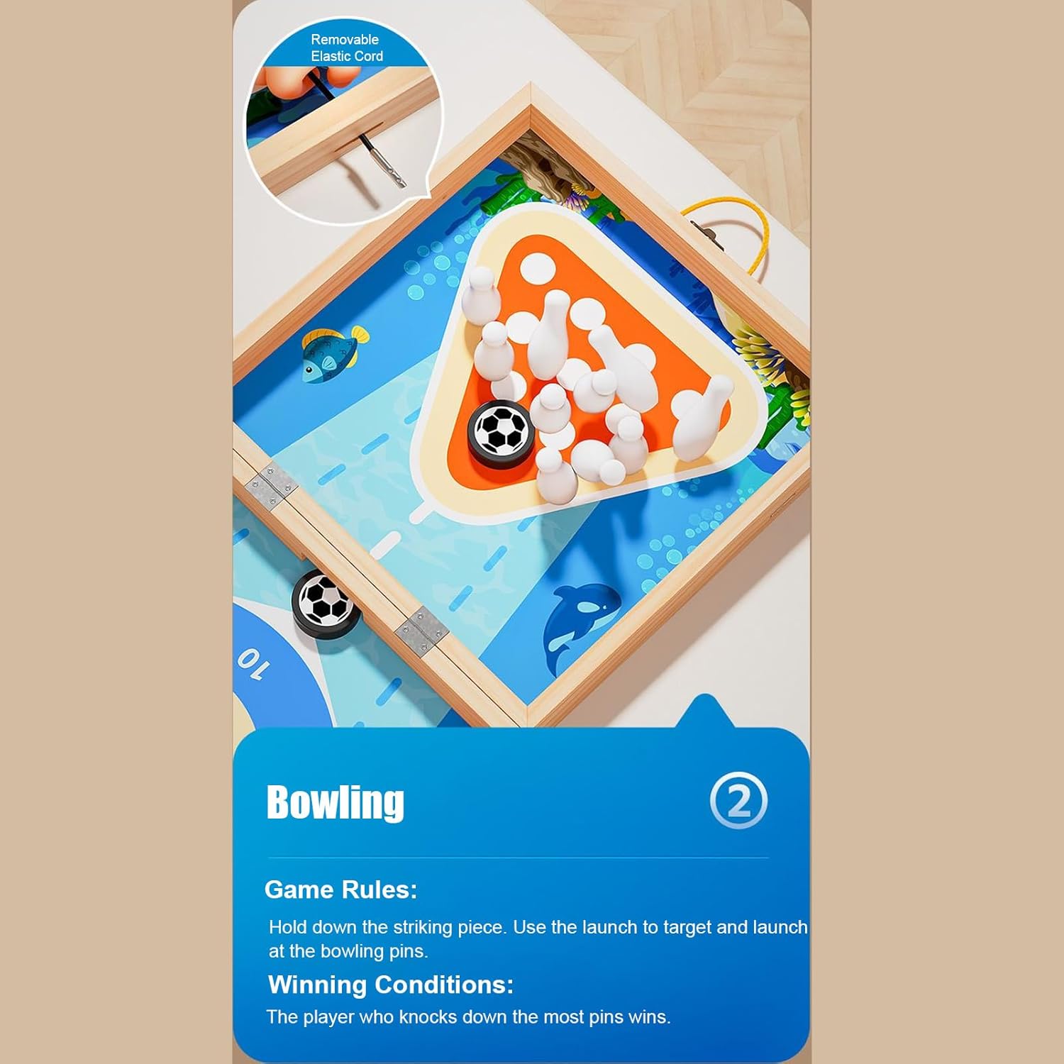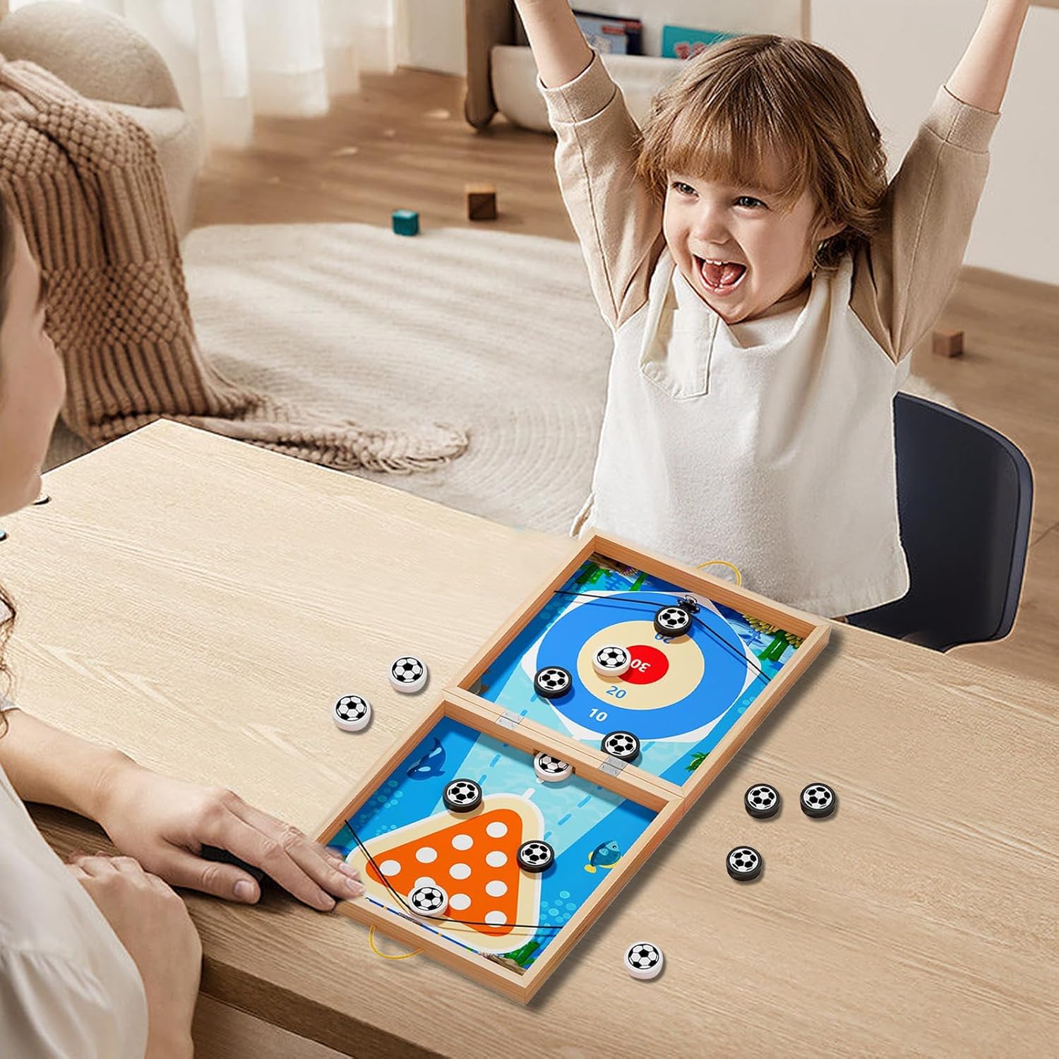 Gioco da tavolo con disco in legno progettato per l'azione multigiocatore, che incoraggia la coordinazione occhio-mano, il pensiero strategico e l'apprendimento interattivo per bambini e adulti. Il design educativo promuove la concentrazione, i riflessi rapidi e la competizione amichevole, rendendolo adatto per aule, scuole materne o ambienti di apprendimento domestico. La configurazione leggera e compatta consente un facile posizionamento su scrivanie, tavoli o superfici piane, supportando un gioco conveniente per famiglie o attività di gruppo. Incoraggia l'interazione sociale e il lavoro di squadra fornendo al contempo un'esperienza pratica divertente che si fonde con gli obiettivi di apprendimento. Ideale per bambini, adolescenti e adulti, supporta lo sviluppo delle competenze, la concentrazione e l'impegno nel gioco educativo o nelle sessioni di gioco ricreativo in famiglia.