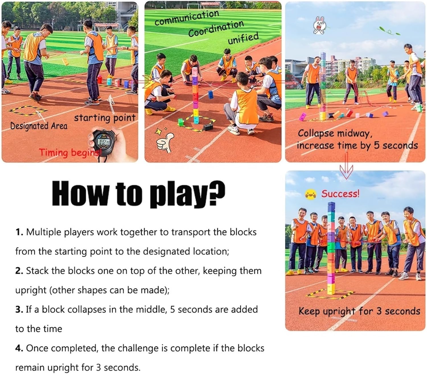 Realizzati in plastica ABS industriale, questi blocchi da gioco di squadra sono costruiti per resistere a rigorose sfide di collaborazione e uso frequente, garantendo prestazioni di lunga durata. Versatile per molteplici scenari, tra cui team building aziendali, progetti STEM in classe, serate di giochi in famiglia e attività rompighiaccio, per gruppi di diverse dimensioni e impostazioni. Progettati per migliorare la collaborazione del team, questi blocchi richiedono una pianificazione strategica del gruppo, il miglioramento delle capacità di comunicazione e la promozione dello sviluppo della leadership attraverso il gioco interattivo. Presenta un design modulare che supporta gruppi da 4 a oltre 20 giocatori, consentendo una facile personalizzazione sia per piccoli team che per attività di coinvolgimento di grandi folle. Il gioco prevede che 5-20 giocatori lavorino insieme per impilare i blocchi da una linea di partenza a una posizione specifica e mantenerli stabili per 3 secondi per portare a termine una sfida di successo.
