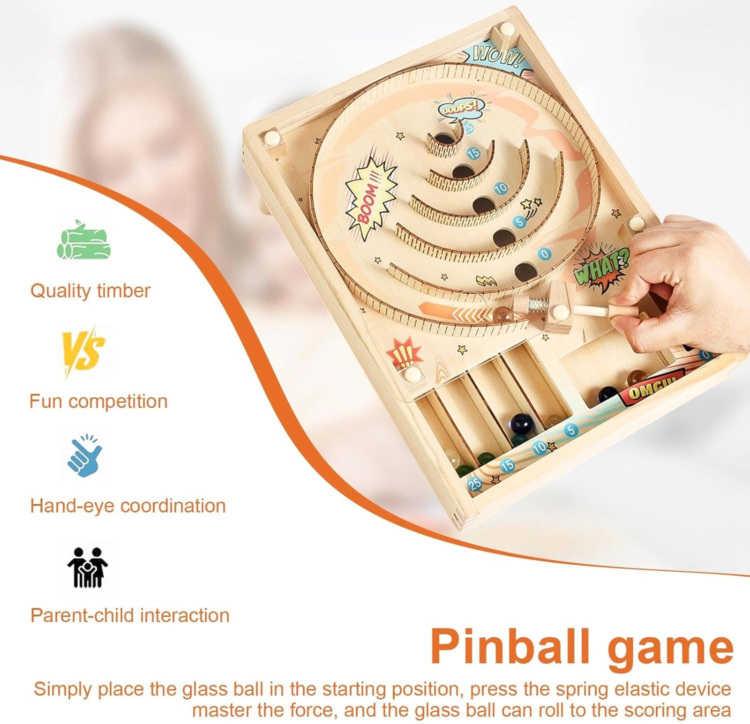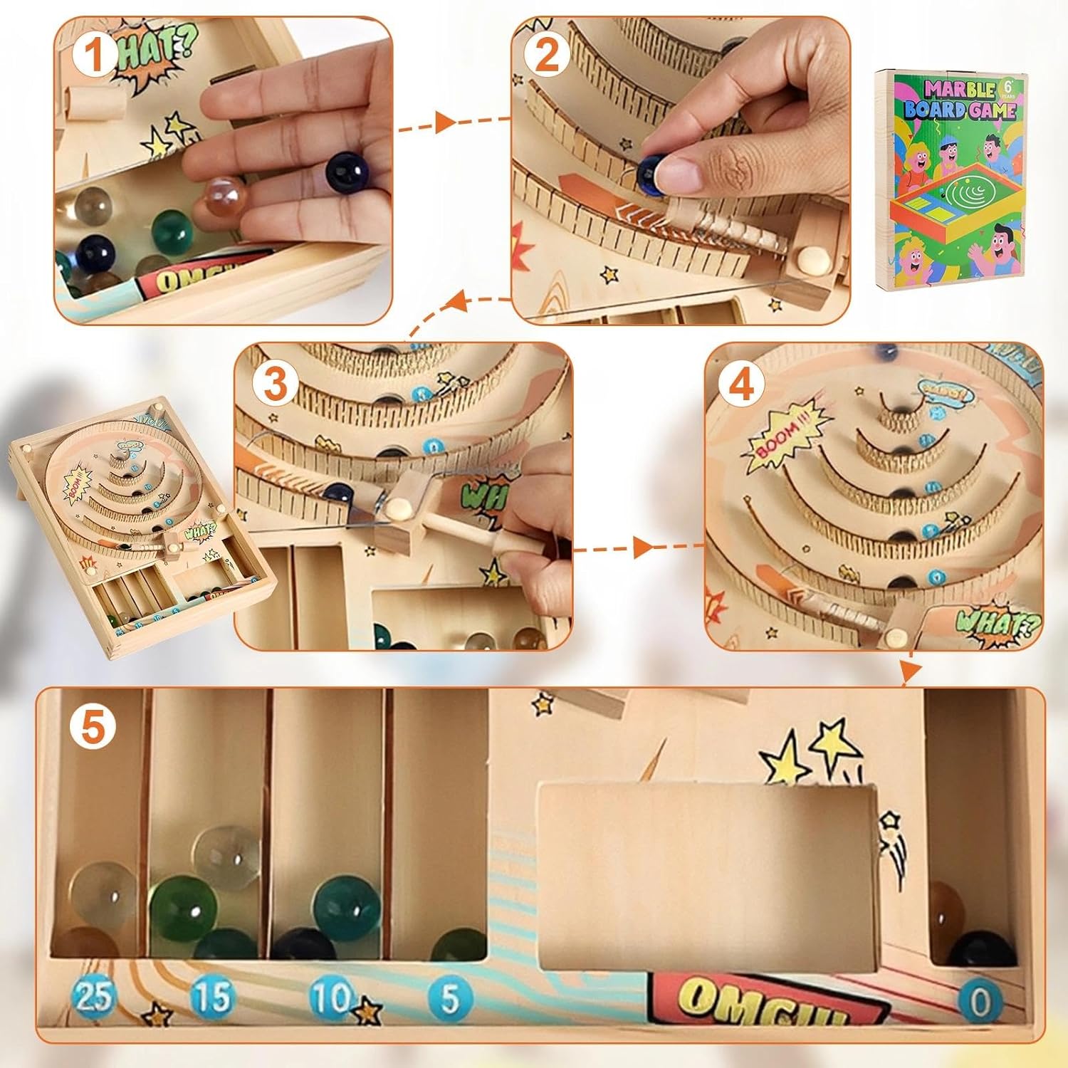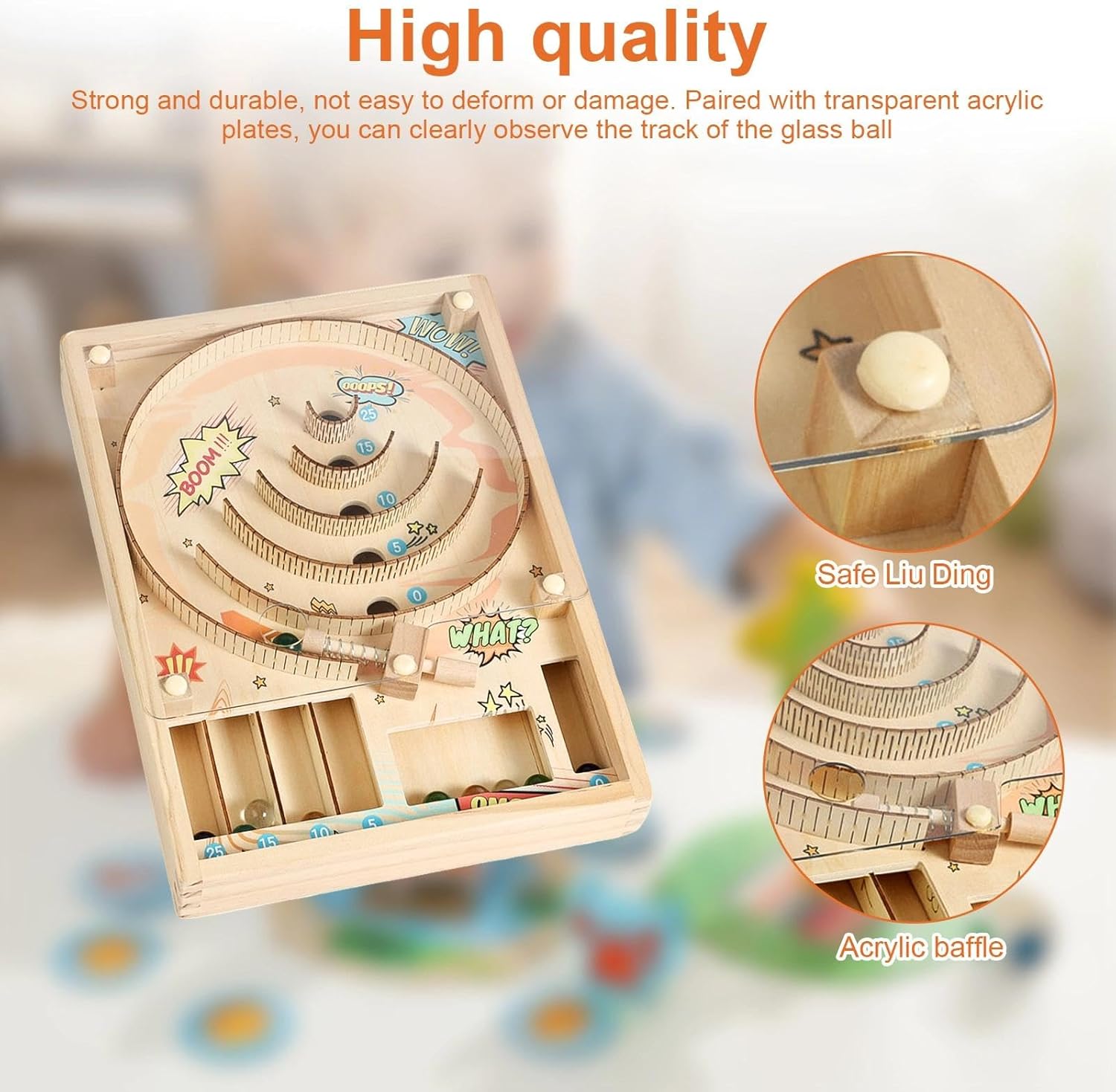 Alta qualità: realizzato in legno di alta qualità, il gioco da tavolo è durevole e resistente alla deformazione e ai danni, la piastra acrilica trasparente consente una visione chiara della traiettoria della palla, garantendone la durata Giochi di sfida per famiglie: posiziona semplicemente la palla nella posizione iniziale, premi il meccanismo a molla e controlla la forza per farla rotolare nell'area di punteggio, facile da impugnare, ti divertirai immediatamente Design pratico: il gioco di abilità ha una pista curva con cinque aree di punteggio (0/5/10/15/25), guadagni punti quando la palla atterra nella buca corrispondente, una volta che tutte e dieci le palline sono atterrate, puoi facilmente calcolare il tuo punteggio totale Facile da trasportare: Misura 30 x 22 x 10,7 cm, il gioco del punteggio da tavolo è facilmente trasportabile e può essere posizionato in una camera da letto, in una sala giochi o in ufficio, non è solo uno strumento divertente, ma anche un eccentrico pezzo da esposizione, che aggiunge un tocco di divertimento a qualsiasi stanza 1 pezzo Accessori completi: Il set include un gioco di divertimento in legno, 10 palline di vetro e due piedini di montaggio, questo gran numero di palline aiuta soddisfare un'ampia varietà di esigenze di gioco, i piedini di montaggio creano una forma inclinata, garantendo un rotolamento fluido e migliorando l'esperienza di gioco