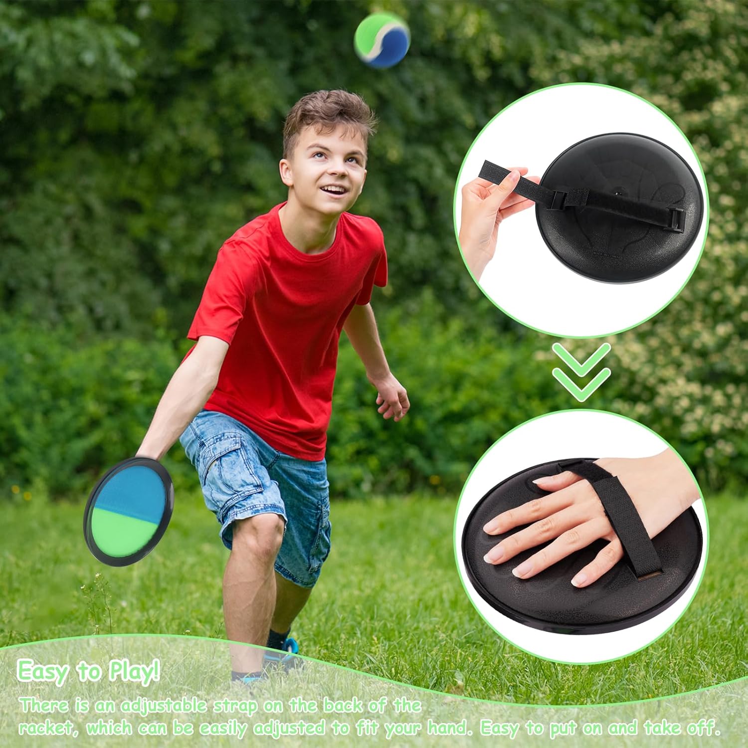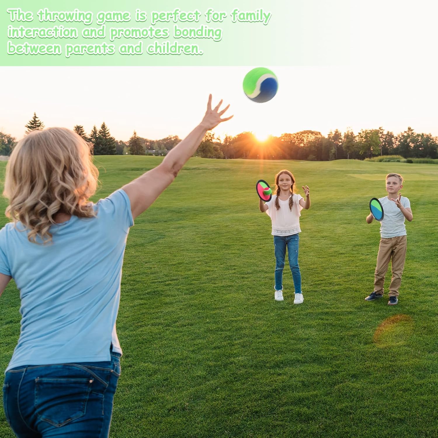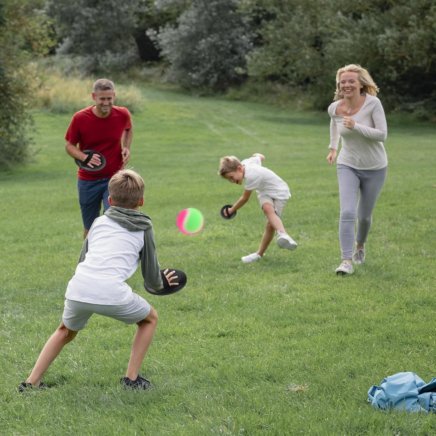 🔴🔵 Set di gioco per bambini con palla a bersaglio appiccicosa Palm: Include 2 dischi adesivi (verde e rosso) e 2 dischi adesivi (blu e verde) con un diametro di 19 cm e 4 palline elastiche dure con un diametro di 6,5 cm, adatte a tutte età, sia per il divertimento che per il fitness. Gioco della palla in velcro è adatto ai giochi di squadra per aumentare il divertimento e socializzazione. È il miglior gioco all'aperto dell'anno e fa amare ai bambini l'estate all'aperto! 🔴🔵 Materiadi qualità premium: Gioco della palla in velcro per bambini è realizzato in PP di alta qualità, nylon e tessuto di viscosa, parte posteriore della racchetta ha chiusure in velcro, che possono essere regolate finemente, adatte per adulti e bambini. parte appiccicosa della mazza è fortemente autoadesiva, il che facilita presa della palla. palla con velcro è realizzata in gomma e poliestere, cuciture sono rinforzate per evitare che si allentino. 🔴🔵 Interazione genitore-bambino: Giocattolo da spiaggia con palla in velcro è adatto a bambini di diverse età, con design della maniglia antiscivolo per evitare di scivolare durante ilncio. palline colorate possono attirare l'attenzione dei bambini e suscitare il loro interesse per ilncio. È adatto per attività al chiuso e all'aperto e può promuovere destrezza e coordinazione dei bambini, oltre a essere una buona scelta per l'interazione tra genitori e figli. 🔴🔵 Giocattolo educativo: Giochi all'aperto per bambini dincio e cattura Progettato per sviluppare capacità di presa encio dei bambini, è scelta ideaper l'allenamento fisico dei bambini. Attraverso giochi semplici e divertenti, i bambini possono migliorare loro capacità motorie, l'attenzione, coordinazione occhio-mano e velocità di reazione, migliorando il loro sviluppo a tutto tondo. 🔴🔵 Uso versatile: Gioco con 4 dischi di cattura e 4 palline è adatto a molte occasioni all'interno e all'esterno, come casa, giardino, piscina, spiaggia, feste e viaggi. Come regalo, è perfetto per i compleanni, festa dei bambini, il Natale, Pasqua e feste di compleanno dei bambini, ed è anche un ottimo premio per vincere competizioni sportive.