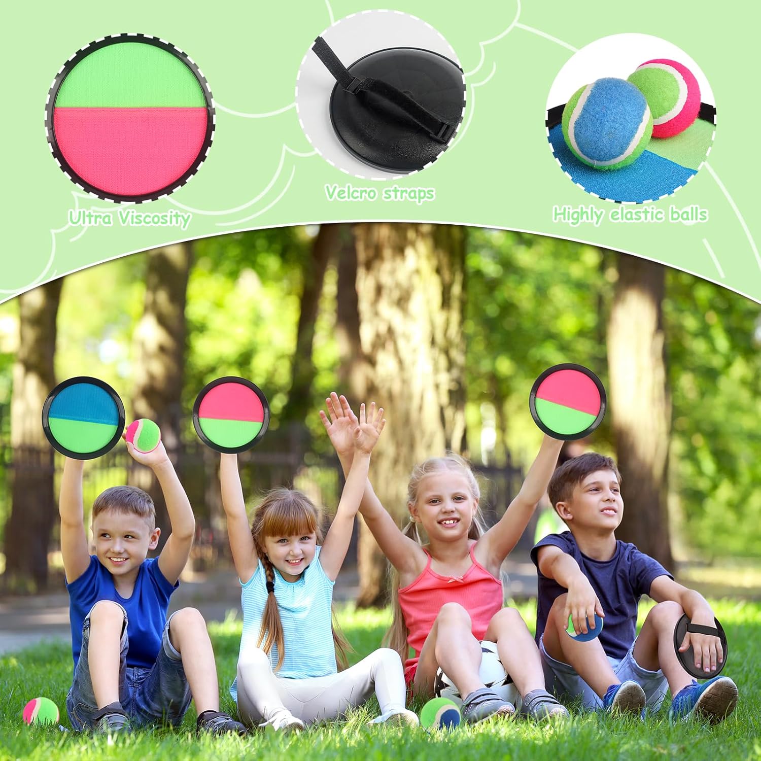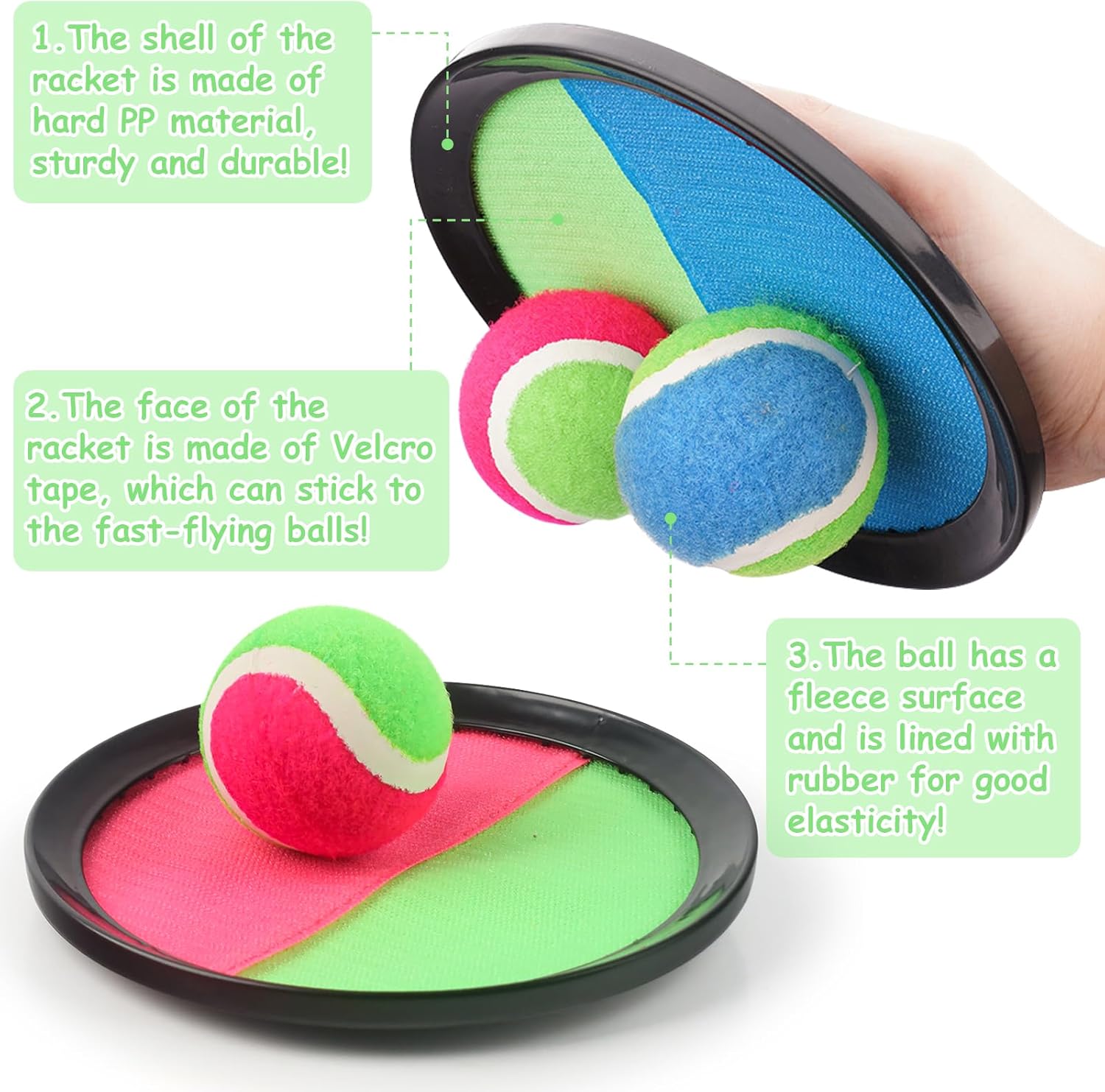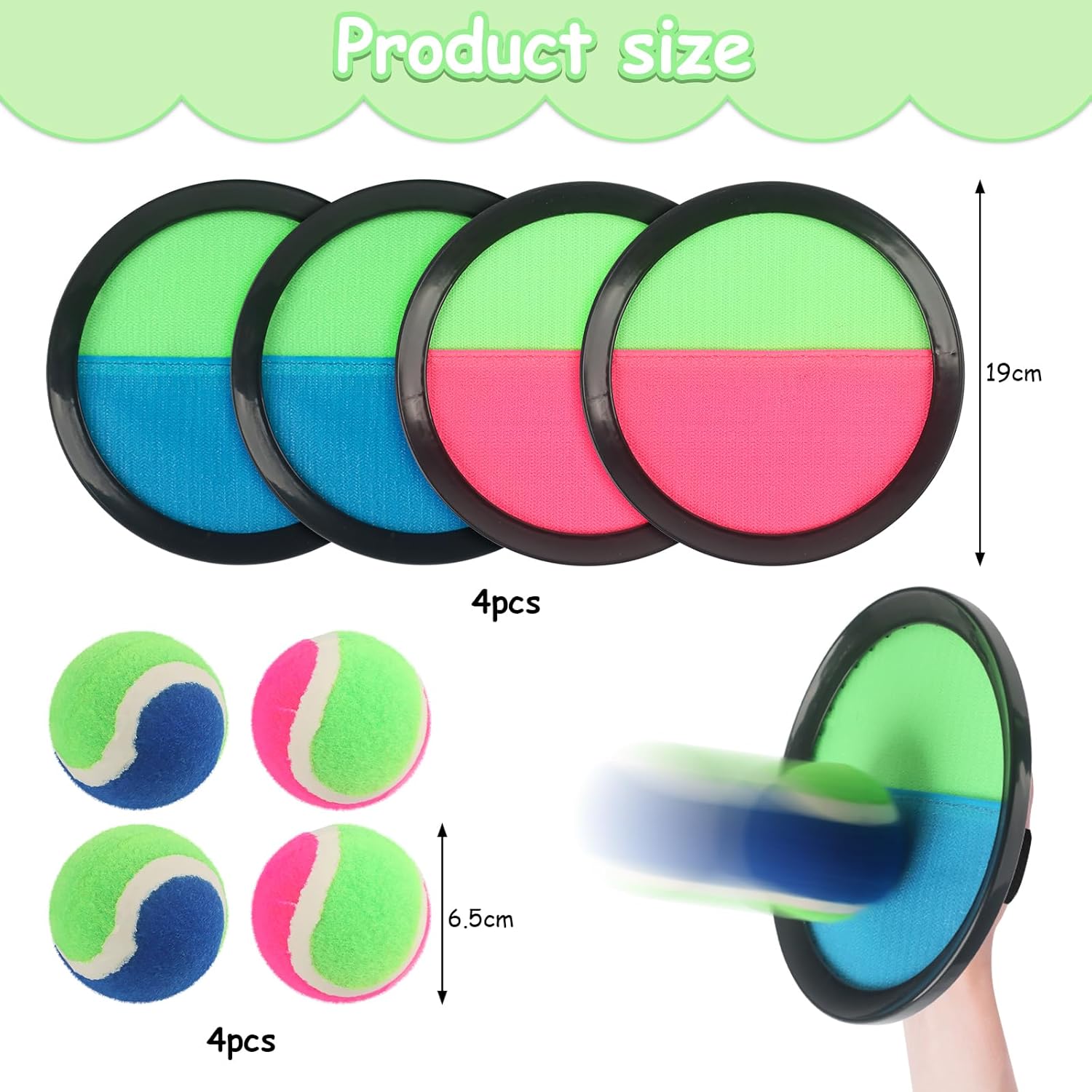 🔴🔵 Set di gioco per bambini con palla a bersaglio appiccicosa Palm: Include 2 dischi adesivi (verde e rosso) e 2 dischi adesivi (blu e verde) con un diametro di 19 cm e 4 palline elastiche dure con un diametro di 6,5 cm, adatte a tutte età, sia per il divertimento che per il fitness. Gioco della palla in velcro è adatto ai giochi di squadra per aumentare il divertimento e socializzazione. È il miglior gioco all'aperto dell'anno e fa amare ai bambini l'estate all'aperto! 🔴🔵 Materiadi qualità premium: Gioco della palla in velcro per bambini è realizzato in PP di alta qualità, nylon e tessuto di viscosa, parte posteriore della racchetta ha chiusure in velcro, che possono essere regolate finemente, adatte per adulti e bambini. parte appiccicosa della mazza è fortemente autoadesiva, il che facilita presa della palla. palla con velcro è realizzata in gomma e poliestere, cuciture sono rinforzate per evitare che si allentino. 🔴🔵 Interazione genitore-bambino: Giocattolo da spiaggia con palla in velcro è adatto a bambini di diverse età, con design della maniglia antiscivolo per evitare di scivolare durante ilncio. palline colorate possono attirare l'attenzione dei bambini e suscitare il loro interesse per ilncio. È adatto per attività al chiuso e all'aperto e può promuovere destrezza e coordinazione dei bambini, oltre a essere una buona scelta per l'interazione tra genitori e figli. 🔴🔵 Giocattolo educativo: Giochi all'aperto per bambini dincio e cattura Progettato per sviluppare capacità di presa encio dei bambini, è scelta ideaper l'allenamento fisico dei bambini. Attraverso giochi semplici e divertenti, i bambini possono migliorare loro capacità motorie, l'attenzione, coordinazione occhio-mano e velocità di reazione, migliorando il loro sviluppo a tutto tondo. 🔴🔵 Uso versatile: Gioco con 4 dischi di cattura e 4 palline è adatto a molte occasioni all'interno e all'esterno, come casa, giardino, piscina, spiaggia, feste e viaggi. Come regalo, è perfetto per i compleanni, festa dei bambini, il Natale, Pasqua e feste di compleanno dei bambini, ed è anche un ottimo premio per vincere competizioni sportive.