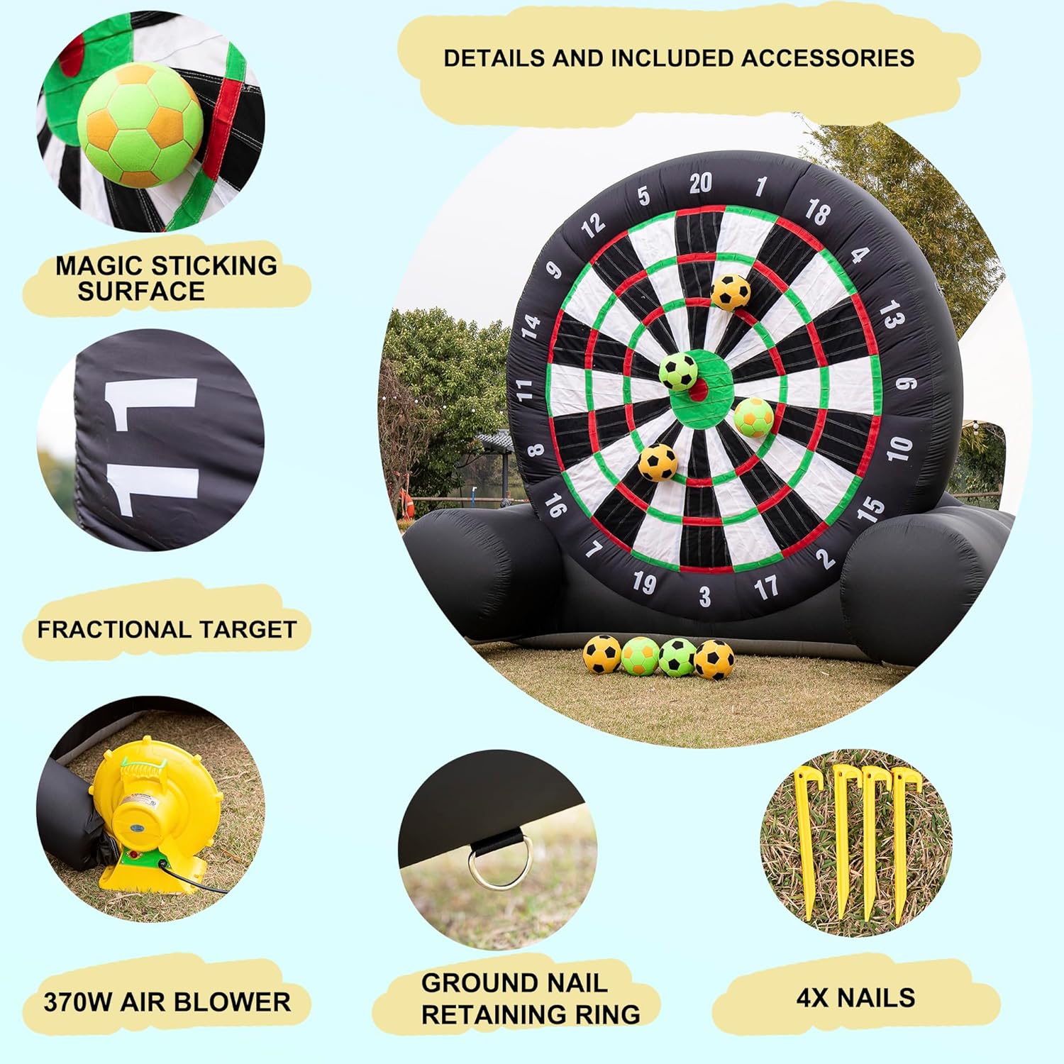 Gonfiaggio rapido del gioco del calcio gonfiabile: niente attese! Gonfia questo fantastico bersaglio per freccette in meno di 5 minuti, raggiungendo un'altezza di oltre 3 metri. (Nota: è necessario un gonfiaggio continuo durante l'uso.) Gioco di calcio gonfiabile Tutto incluso: questo set è completo di un grande bersaglio gonfiabile per freccette, 8 palloni da calcio e 1 pompa per kickball per il tuo divertimento all'aria aperta. Gioco di calcio gonfiabile: oltre 15 giochi originali: scopri il gioco per attività all'aperto per eccellenza, perfetto da regalare! Il nostro esclusivo bersaglio gonfiabile è versatile per giochi come Kick Ball, Long Ball, Shoot, Freccette, Home Run Derby e Golf, solo per citarne alcuni. Materiali di alta qualità per il gioco del calcio gonfiabile: realizzato in tessuto Oxford 210D, il nostro tabellone gonfiabile è leggero, resistente e progettato per resistere all'elettricità statica, offrendo al contempo una resistenza all'usura superiore per un uso prolungato. Presenta un design del telaio triangolare per una maggiore stabilità, superando le prestazioni dei bersagli per freccette standard. Bersaglio gonfiabile per freccette extra adesivo: di' addio ai tiri sbagliati! Questo bersaglio è progettato per garantire la massima aderenza e presa, ma le freccette rimangono facili da rimuovere, consentendo anche ai giocatori più piccoli di divertirsi senza perdere le freccette dal bersaglio.