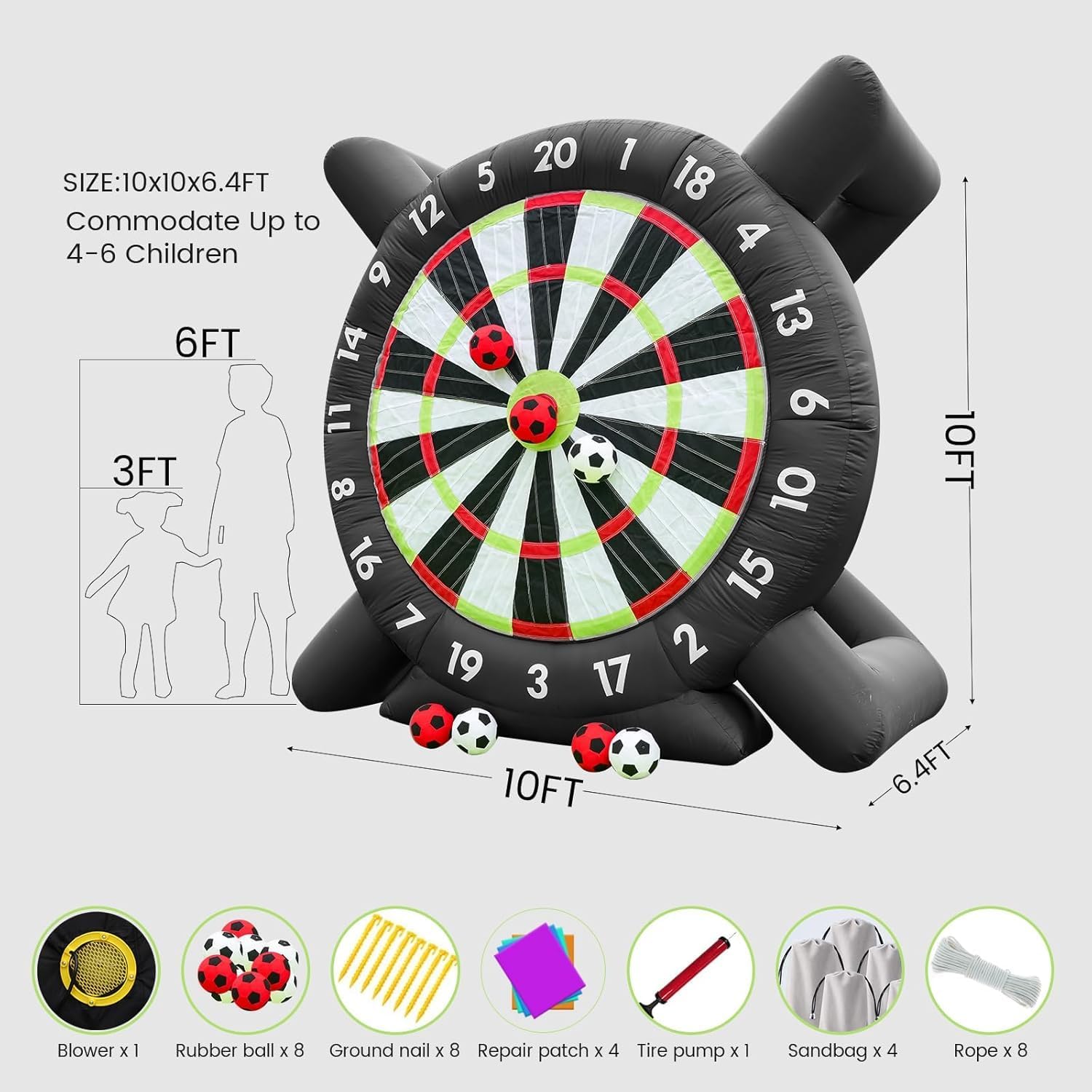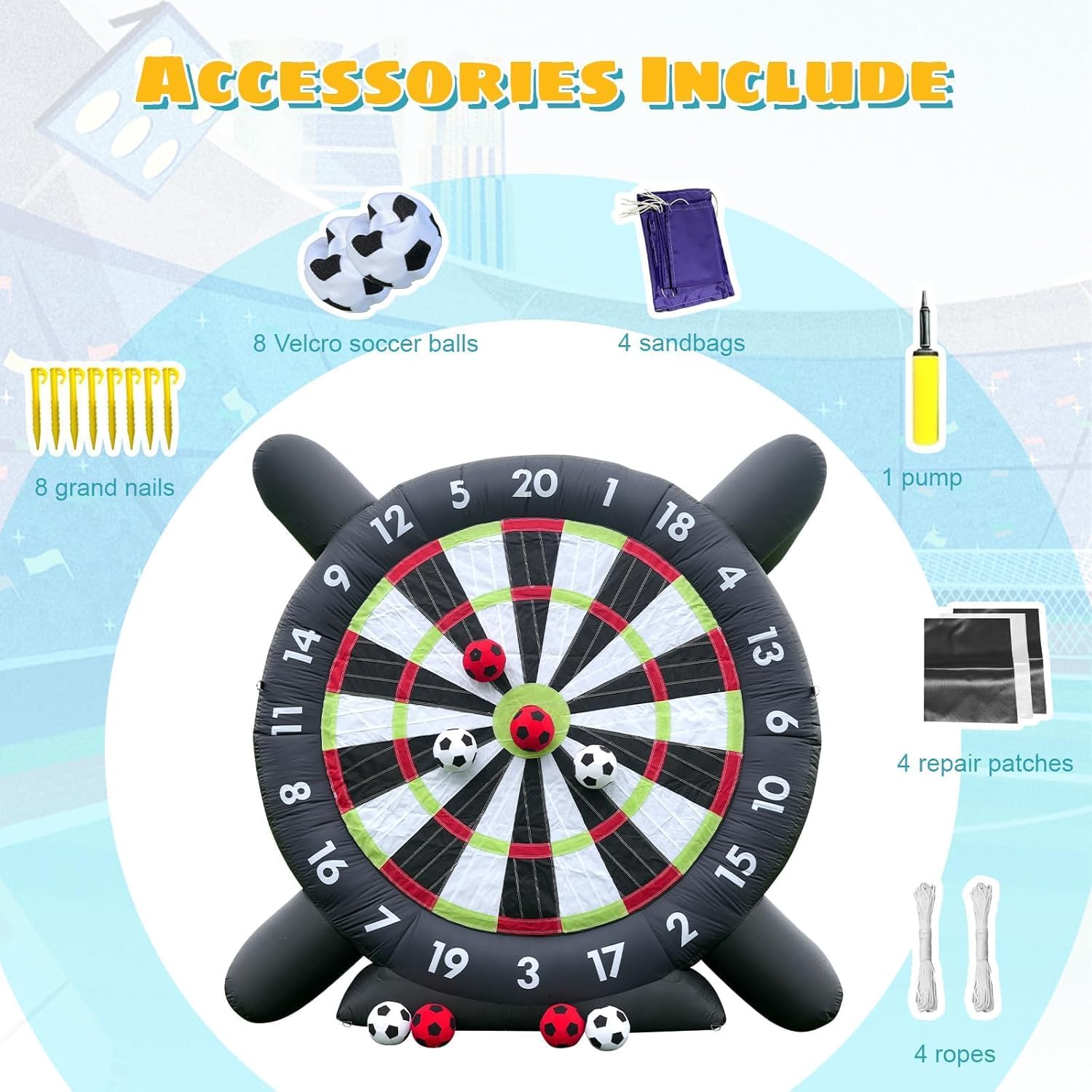 Gioco di calcio gonfiabile: montaggio semplice e comodo da riporre: il bersaglio gonfiabile per freccette e calcio può essere montato in soli 2 minuti o meno. Assicurarsi che la cerniera sia ben chiusa prima di gonfiarlo. Si sgonfia facilmente e può essere ripiegato in modo compatto, rendendolo perfetto per il trasporto e lo stoccaggio. Evitare oggetti appuntiti durante la manipolazione per prevenirne l'usura. Gioco di calcio gonfiabile Maggiore durata e stabilità: il nostro bersaglio gonfiabile per freccette da calcio misura 3 metri per 3 metri ed è realizzato in tessuto Oxford 210d, antistatico e altamente resistente all'usura. Tutte le cuciture sono doppie e la superficie autoriparante offre una forte aderenza, consentendo un facile smontaggio senza danneggiare la palla. Gioco di calcio gonfiabile Design innovativo e divertente: il set include 8 palloni da calcio in feltro. Questo nuovo ed entusiasmante sport unisce calcio e freccette in un unico gioco. Il bersaglio gonfiabile oversize è ideale sia per bambini che per adulti, con superfici gonfiabili e autoadesive su cui è possibile calciare i morbidi palloni da calcio sul grande bersaglio in velcro per un'esperienza di punteggio divertente. Gioco di calcio gonfiabile Uso versatile: perfetto per gli appassionati di calcio e rugby, le società di noleggio, le scuole, le gite in spiaggia, i campi estivi, gli eventi aziendali, le riunioni della comunità, le feste in giardino e per promuovere uno stile di vita attivo con la famiglia e gli amici, favorendo al contempo il lavoro di squadra. Kit completo di accessori per gioco da calcio gonfiabile: include 8 palloni da calcio, 1 soffiatore, 1 pompa ad aria, 8 picchetti, 4 corde e 4 sacchi di sabbia. Il nostro servizio clienti è disponibile 24 ore su 24, 7 giorni su 7. Non esitate a contattarci online in qualsiasi momento per ulteriori informazioni sui nostri prodotti.