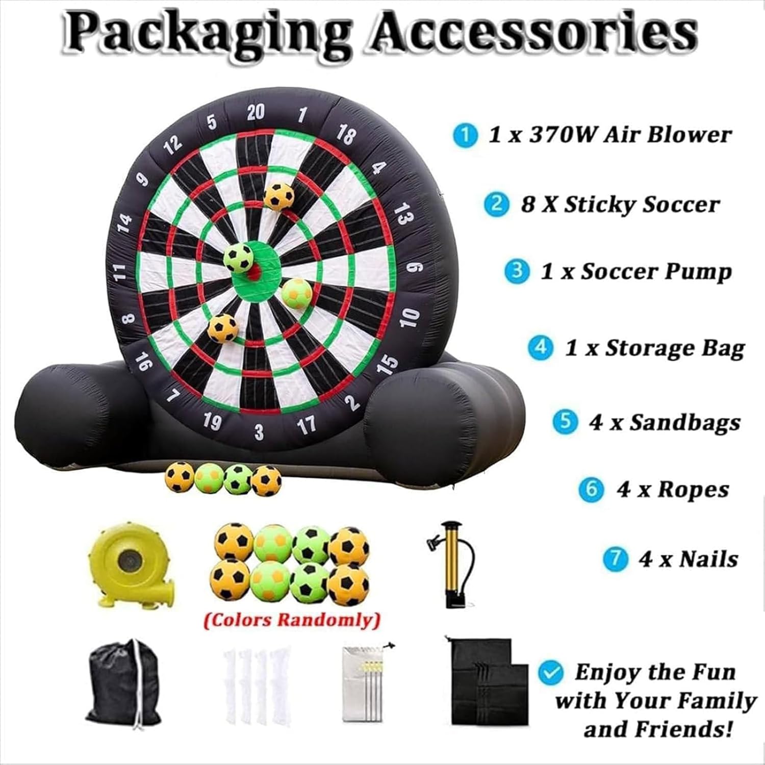 Gioco di freccette: installazione rapida e facile da riporre: bastano solo 2 minuti per gonfiare enormi freccette da calcio e mantenerle gonfie per tutta la durata dello spettacolo, una volta inserite, in modo da non dover perdere troppo tempo per gonfiarle. Ricordarsi di chiudere la cerniera prima del gonfiaggio. Al termine della partita, aprire la cerniera per far fuoriuscire l'aria e riporre rapidamente. Gioco di freccette Materiale di alta qualità: il nostro bersaglio per freccette è realizzato in tessuto Oxford. Dimensioni: 300 cm x 380 cm (L x A). Il tessuto Oxford è leggero e resistente; è facile da riporre o da trasportare. Caratteristiche del gioco delle freccette: è l'ultimo sport in cui calcio e freccette sono collegati. Il bersaglio da calcio di grandi dimensioni è adatto a bambini e adulti; è completamente gonfiabile con superficie autoadesiva; design gonfiabile per un divertimento morbido e sicuro. Applicazione del gioco delle freccette: ideale per gli appassionati di calcio e di calcio, ma anche per aziende di noleggio, scuole, giornate in spiaggia, campi estivi, eventi aziendali, gruppi, feste di gruppo e per amici e familiari che desiderano uno stile di vita attivo e promuovere il lavoro di squadra. Gioco di freccette Se hai domande durante l'acquisto o l'uso, contattaci in tempo, saremo felici di aiutarti. Contattaci in tempo per qualsiasi domanda, ti risponderemo entro 24 ore. La tua soddisfazione è il nostro ultimo desiderio, ti auguro un felice shopping!